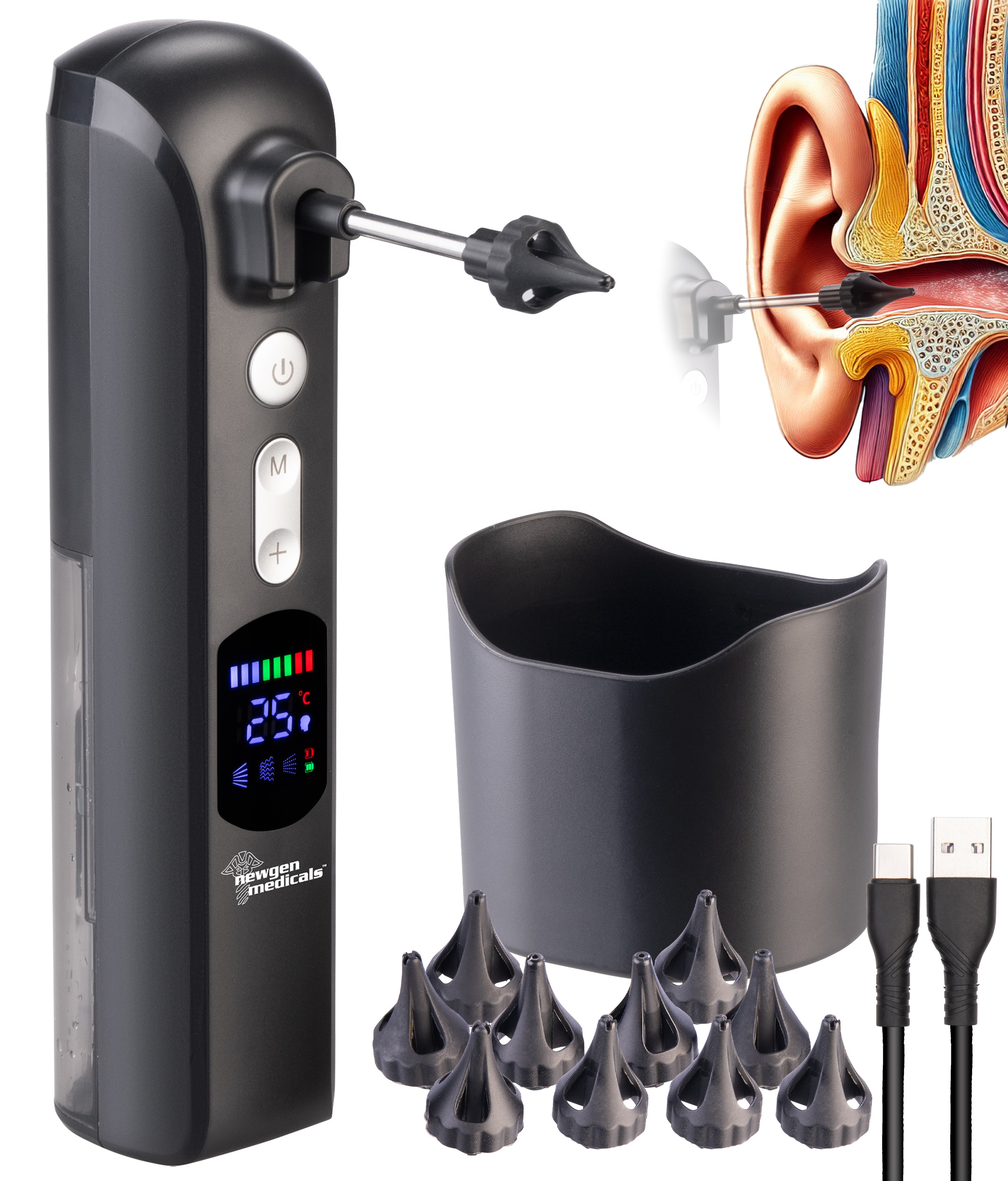 Der Akku-Ohrreiniger von newgen medicals ermöglicht die schonende Entfernung von Ohrenschmalz durch eine integrierte Wasserspülung. Das System bietet drei Reinigungsmodi mit jeweils acht Intensitätsstufen zur individuellen Anpassung.