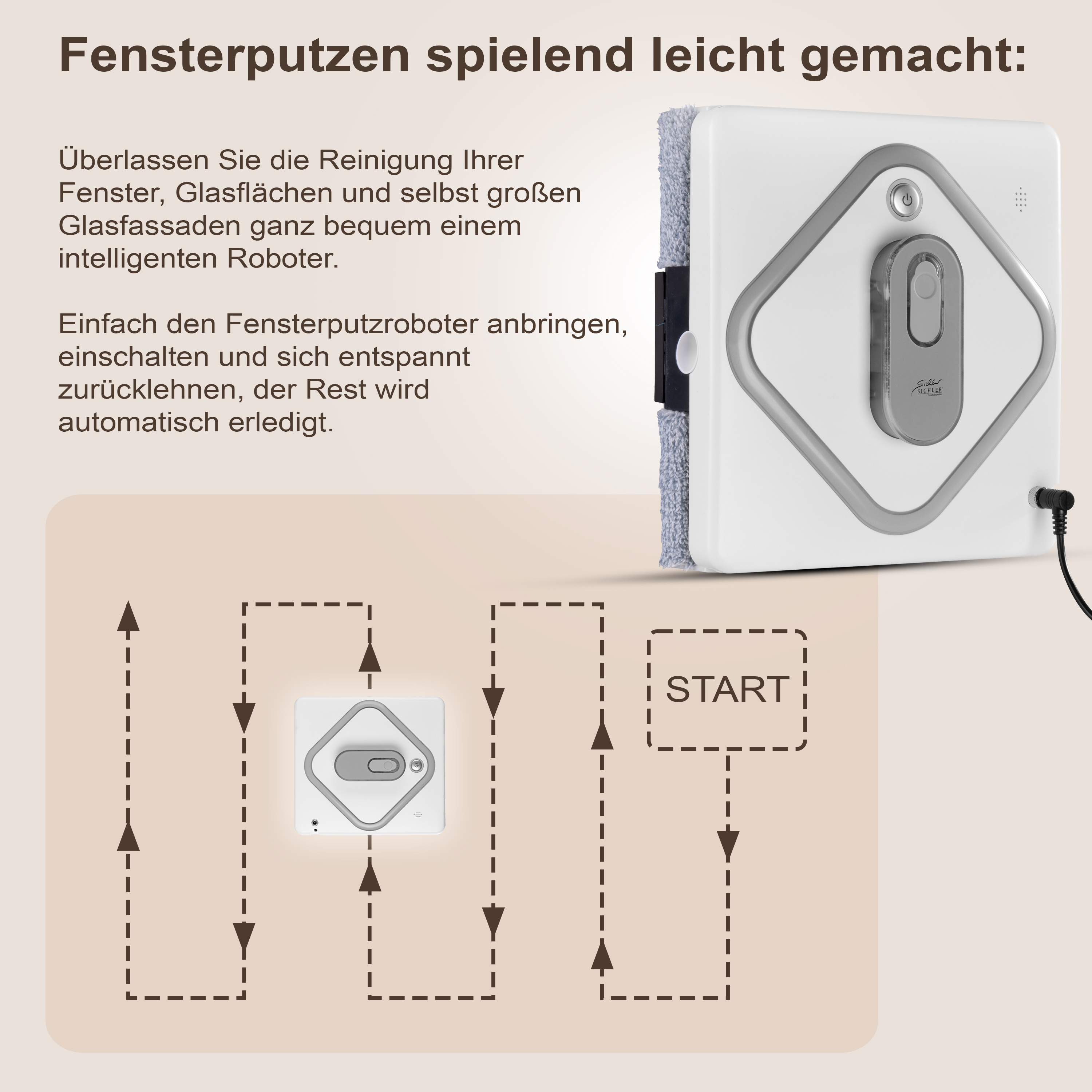 Automatische Fensterreinigung mit intelligenter Technik: Der Profi-WLAN-Fensterputzroboter von Sichler Haushaltsgeräte übernimmt vollautomatisch die Reinigung von Fenstern, Glasflächen und großen Glasfassaden. Nach der Montage und Aktivierung reinigt das Gerät selbstständig ohne manuellen Eingriff.
