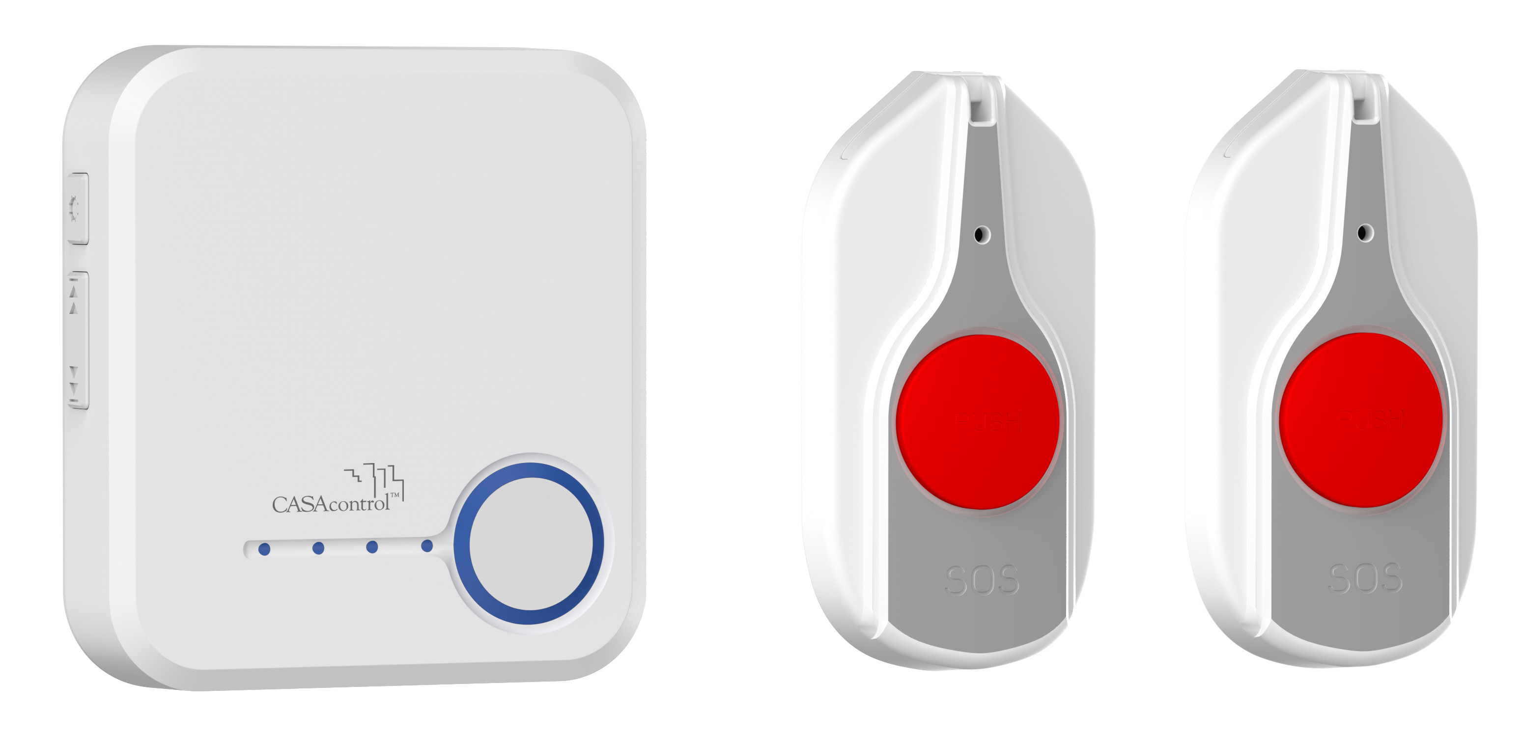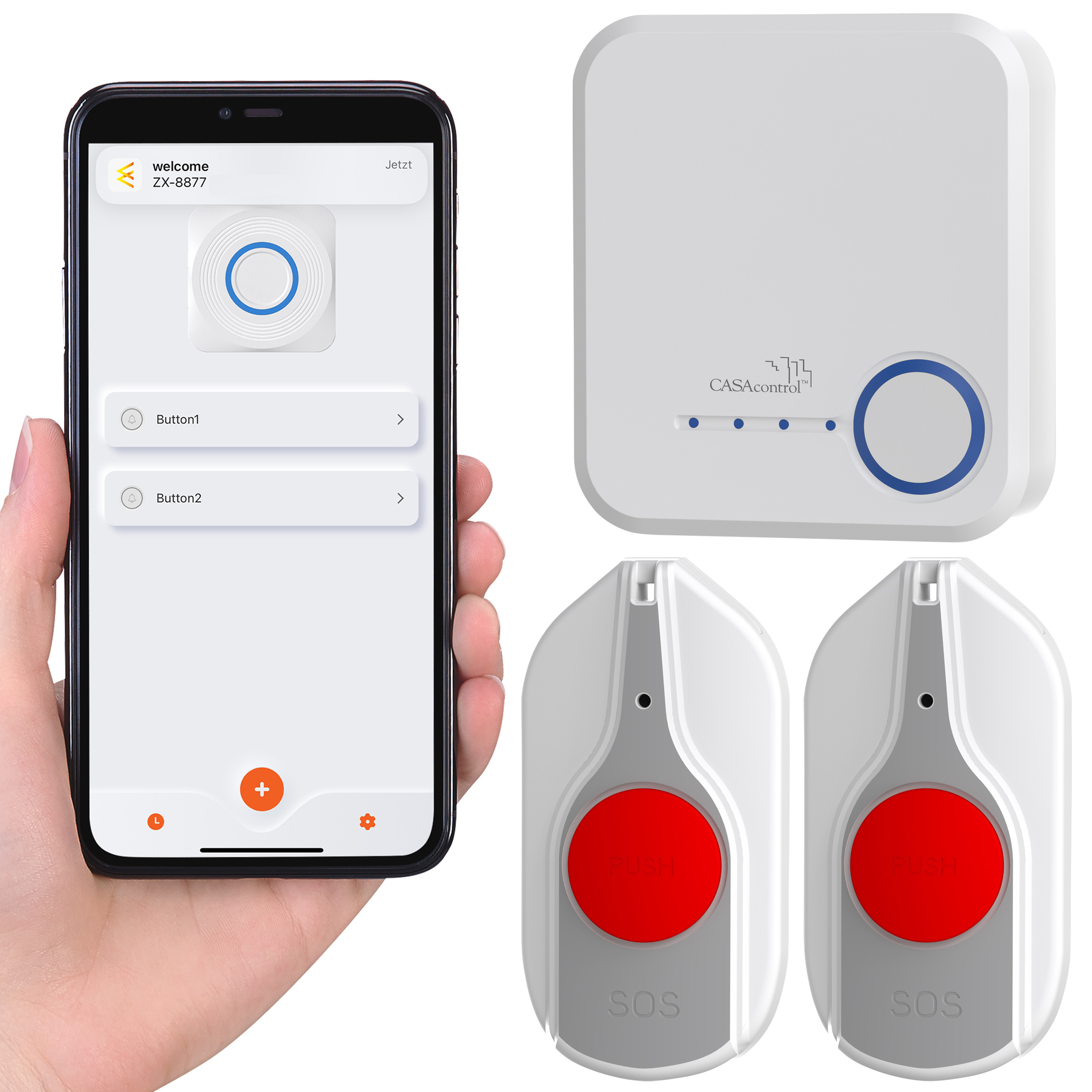 CASAcontrol Smartes SOS-Notrufknopf-Set für Senioren, 4x Sender, 2x Empfänger, App