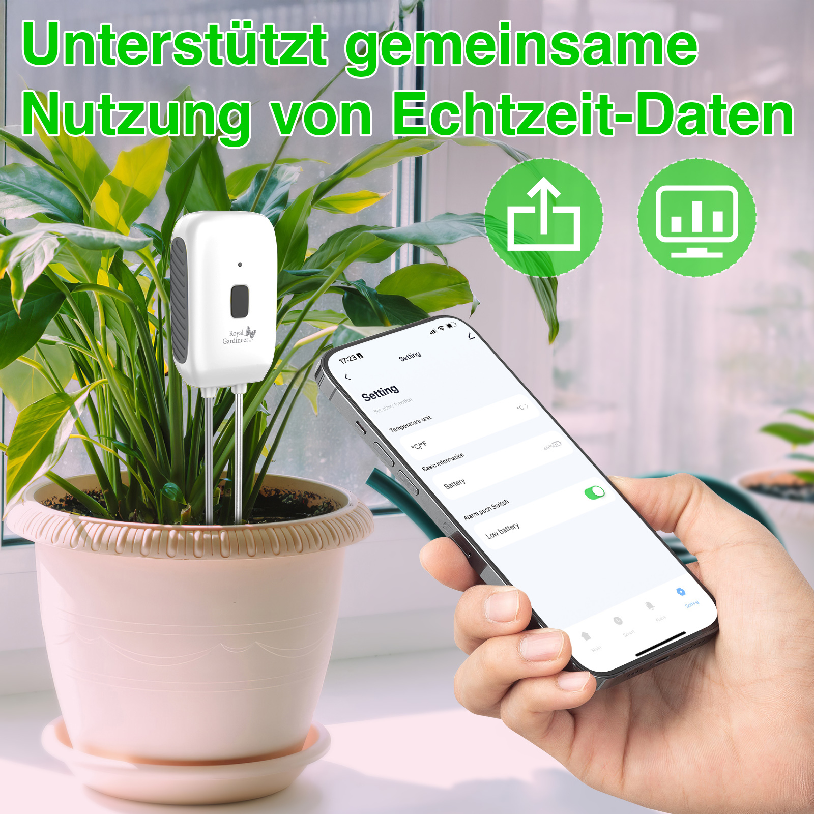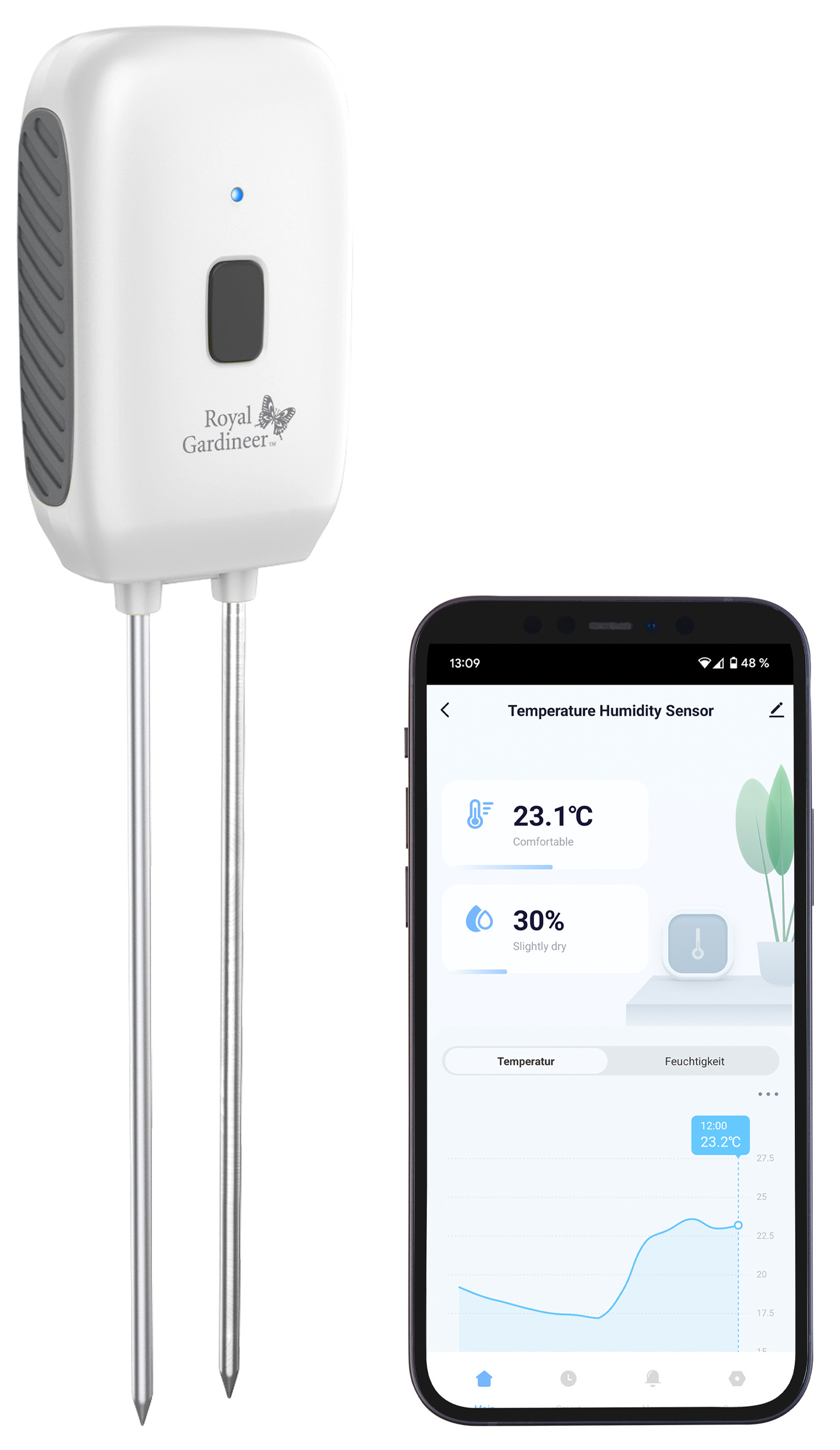Ein smarte Sensor von Royal Gardineer misst präzise die Bodenfeuchte und -temperatur und überträgt die Daten direkt an die kostenlose App „ELESION“ auf dem Smartphone. Die App eignet sich für Blumen, Kräuter und andere Pflanzen im Garten oder auf der Terrasse.
