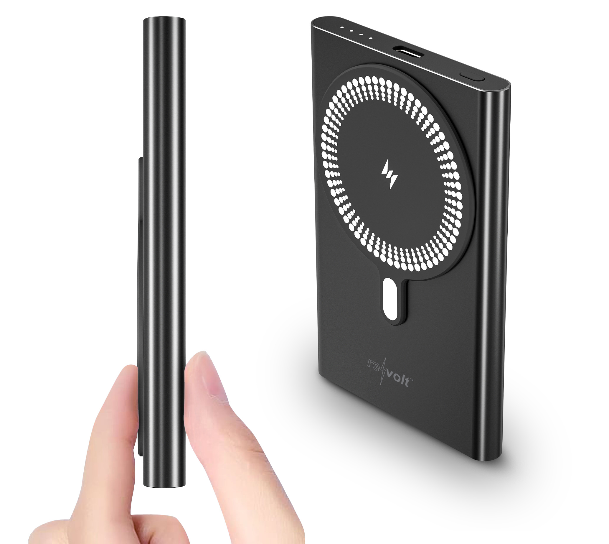 (lifepr) (Buggingen, 13.03.2025) Die revolt PB-450 ist eine ultraflache Powerbank mit einer Kapazität von 5.000 mAh, nur 12 mm dick und 128 g leicht. Sie ermöglicht das kabellose Aufladen kompatibler Geräte mit bis zu 15 Watt und unterstützt über USB-C Power Delivery bis zu 20 Watt für schnelles Aufladen. Dank MagSafe-Kompatibilität haftet sie magnetisch an entsprechenden Smartphones. Vier LEDs zeigen den Ladestatus an und das robuste Metallgehäuse sorgt für Langlebigkeit. Ideal für unterwegs, um Smartphones, Tablets und andere Geräte schnell und effizient aufzuladen.