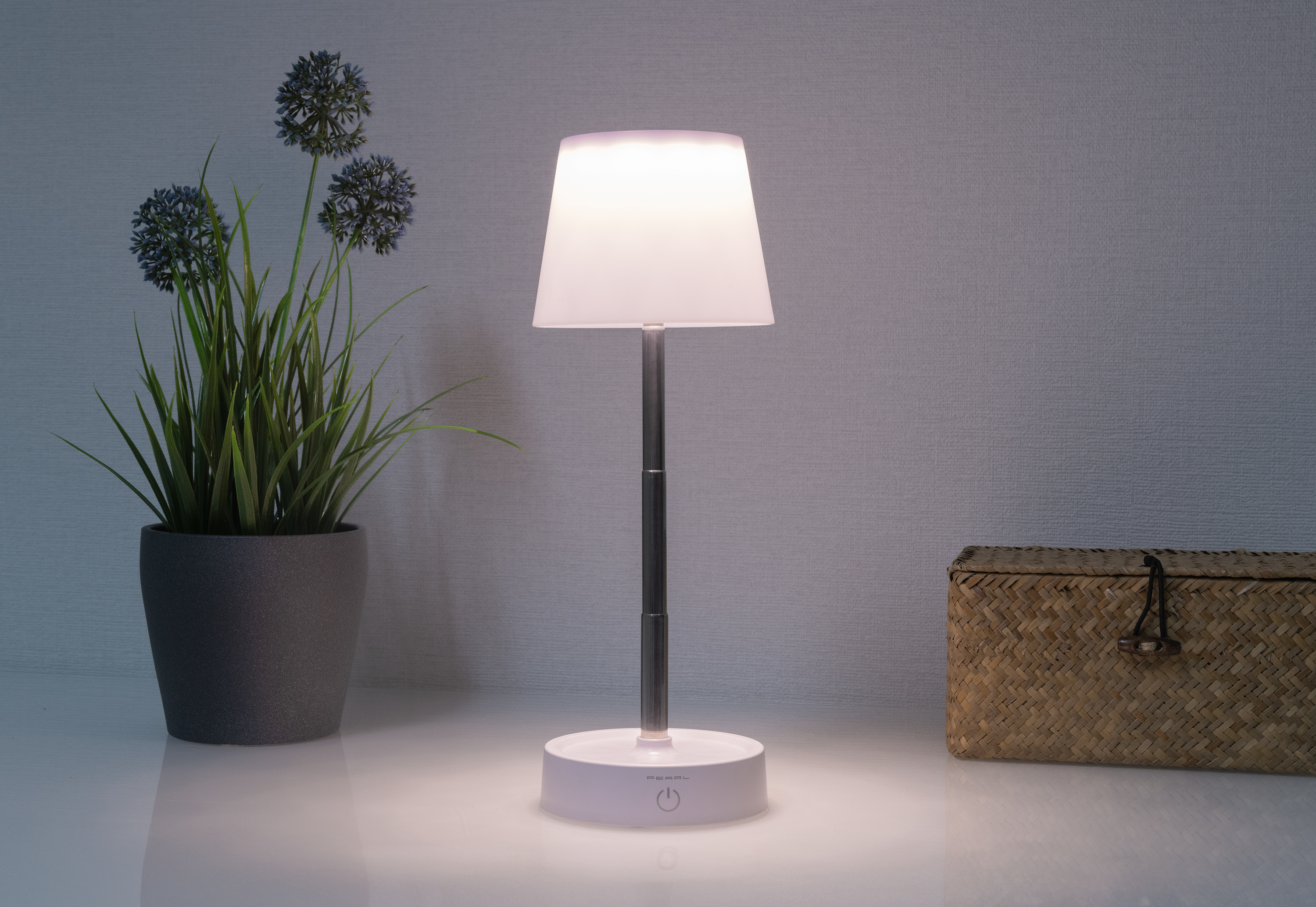 Eine flexible Lichtquelle für verschiedene Einsatzorte: Ob auf dem Campingplatz, dem Balkon oder der Terrasse - mit dem Teleskopstativ lässt sich die dimmbare Teleskop-Akku-Tischleuchte von PEARL stufenlos in der Höhe verstellen. Die Helligkeit lässt sich über einen Taster regulieren und erreicht bis zu 80 Lumen.