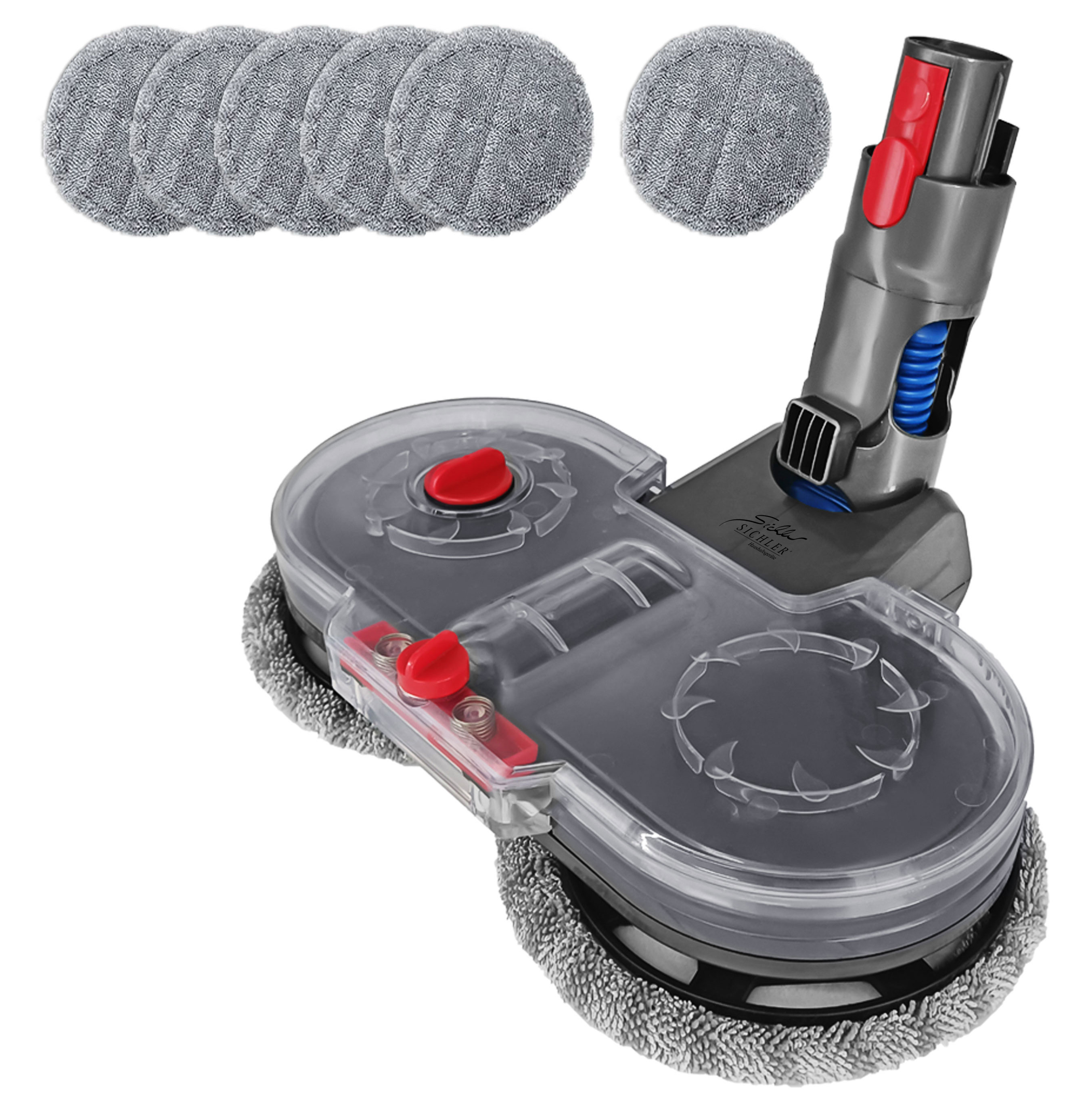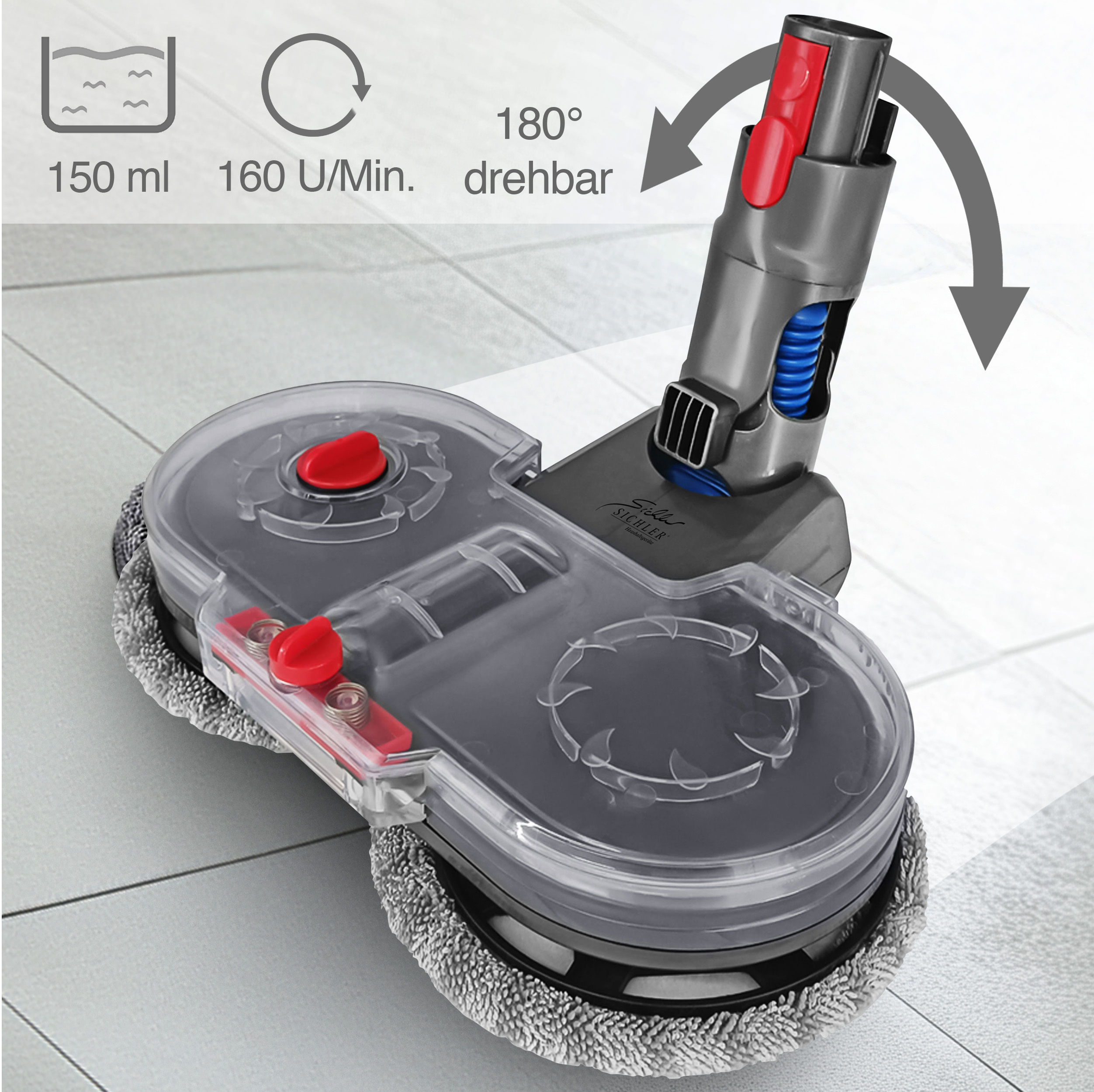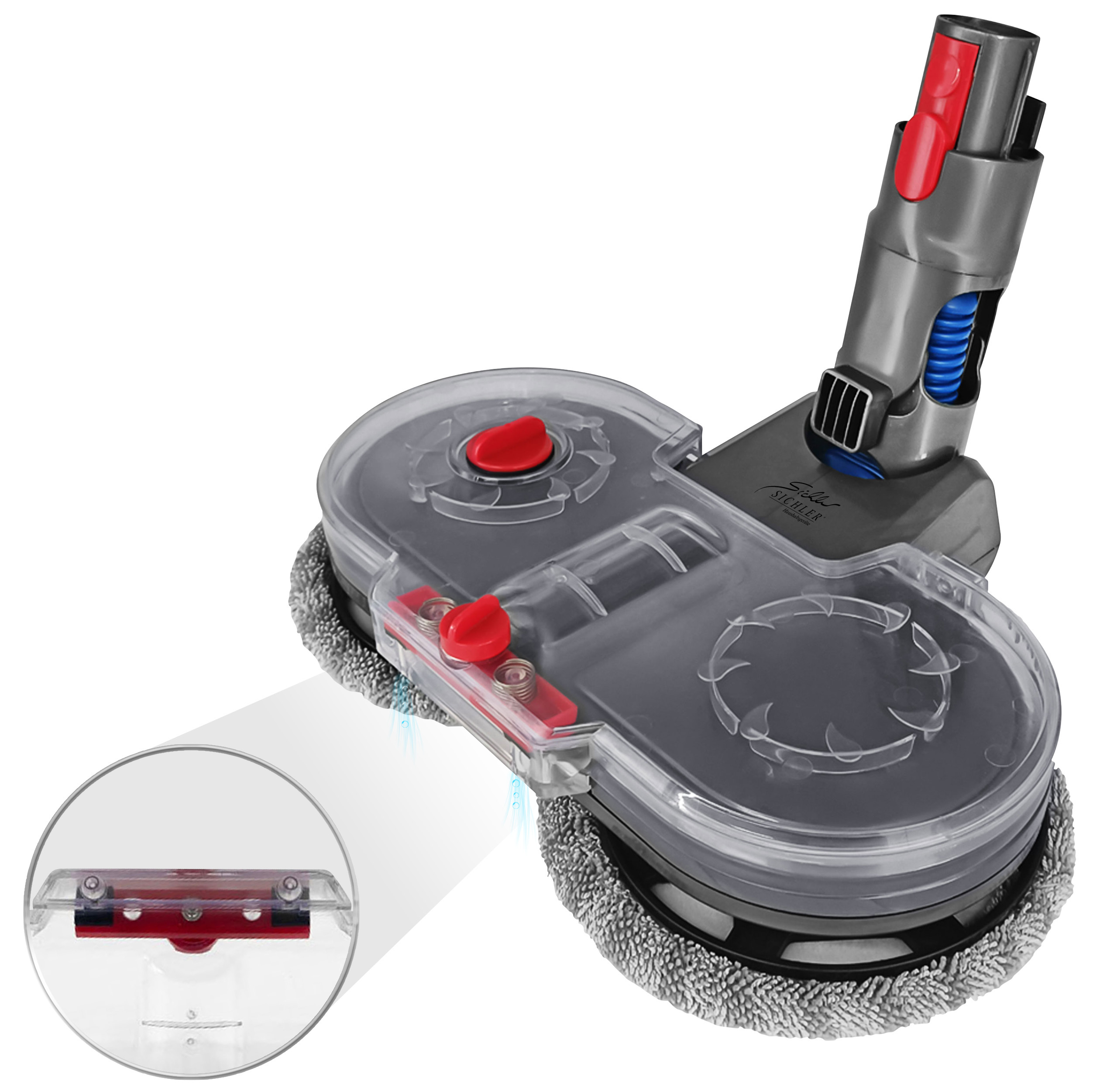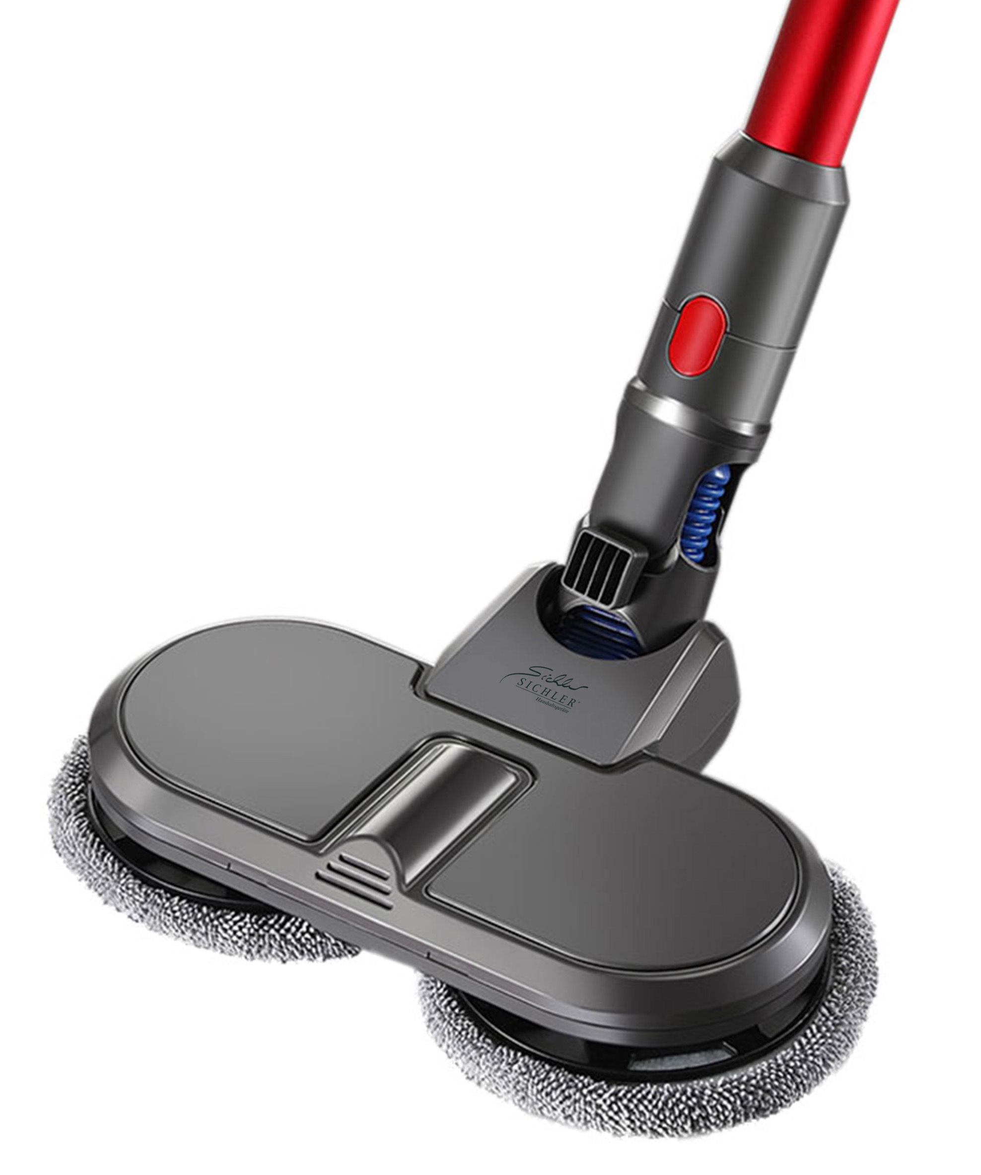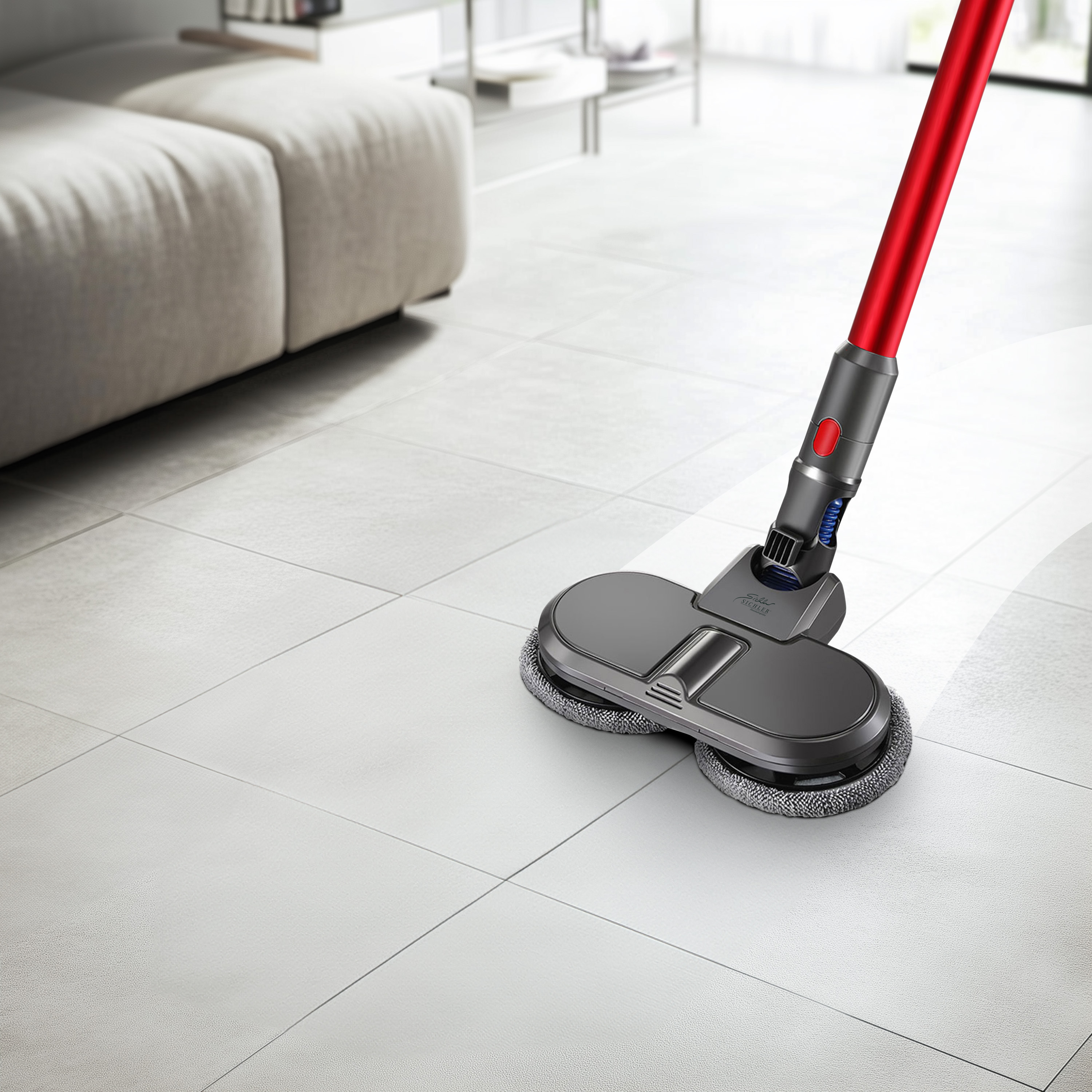 Der elektrische Wischaufsatz von Sichler Haushaltsgeräte erweitert die Funktionalität des Dyson Staubsaugers und ermöglicht eine umfassendere Bodenreinigung. Mit diesem Zubehör können nun glatte Böden wie Fliesen, Holz- und Vinylböden nass gereinigt werden. Um Parkett oder Fliesen auf Hochglanz zu bringen, wird einfach der Wasserauslass des Behälters geschlossen und trocken poliert.