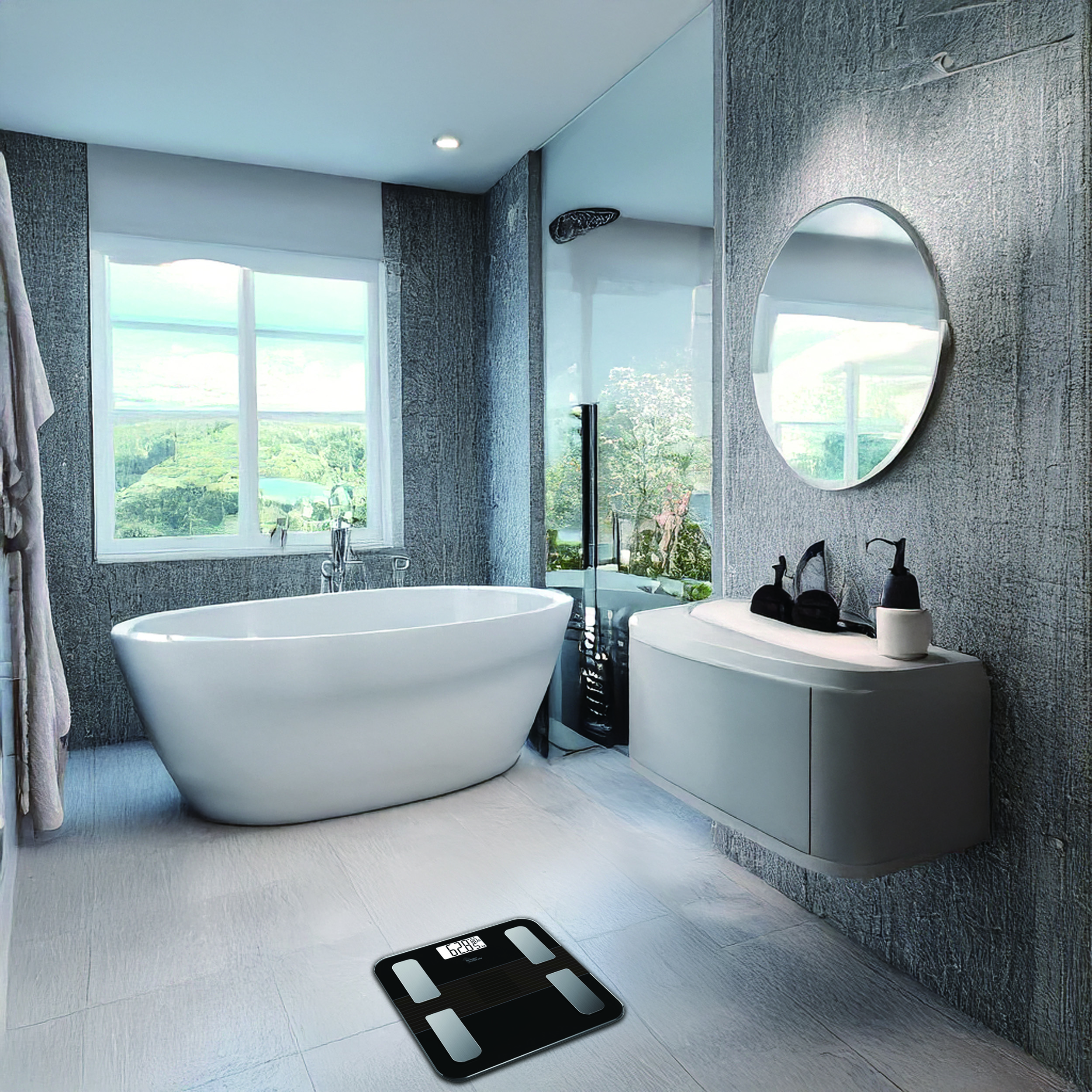 Das Gehäuse der Waage besteht aus gehärtetem Glas und misst 28 x 28 cm. Das Design ist funktional und gleichzeitig zurückhaltend elegant, wodurch eine harmonische Integration in moderne Badezimmerumgebungen ermöglicht wird.