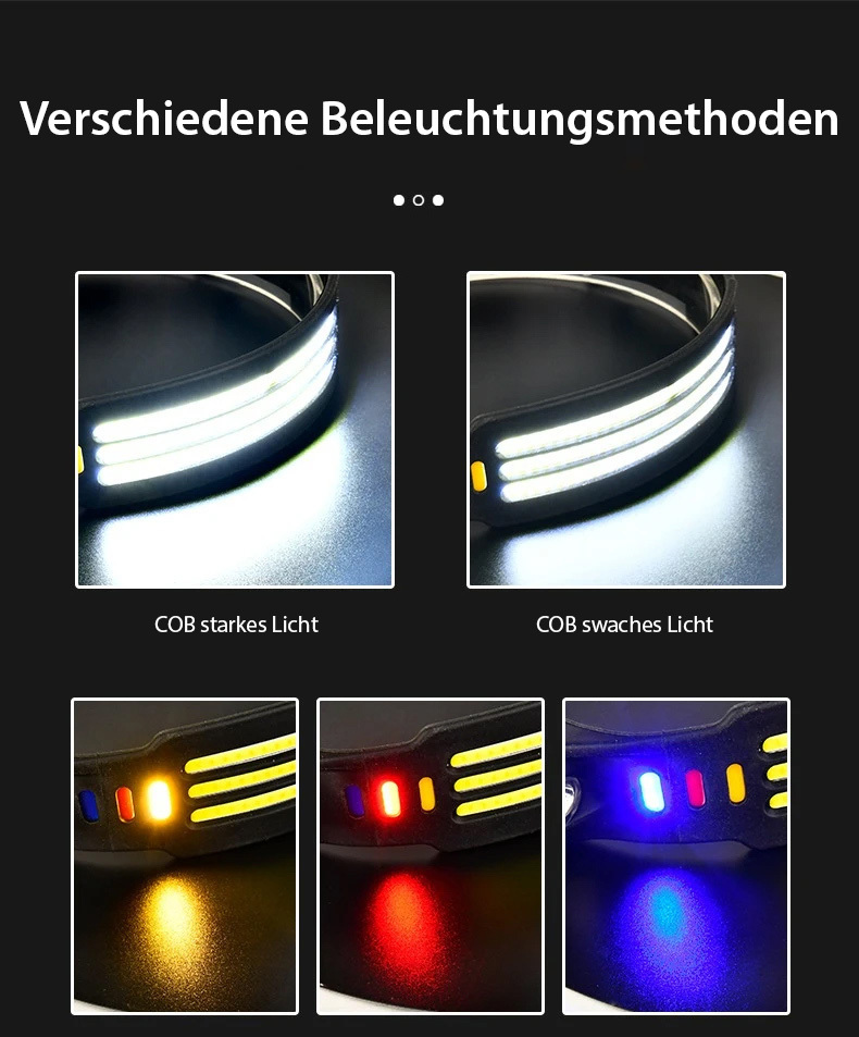 Die Akku-Stirnlampe von KryoLights mit umfangreicher Ausstattung sorgt für optimale Sichtverhältnisse bei Dunkelheit. Drei helle COB-LED-Bänder leuchten einen großen Bereich von bis zu 270° aus. Zusätzlich sorgt eine fokussierte LED für punktgenaue Ausleuchtung. Die Stirnlampe ermöglicht freihändiges Arbeiten und eignet sich für Outdoor-Aktivitäten, Nachtwanderungen, Joggen, Camping und handwerkliche Tätigkeiten.