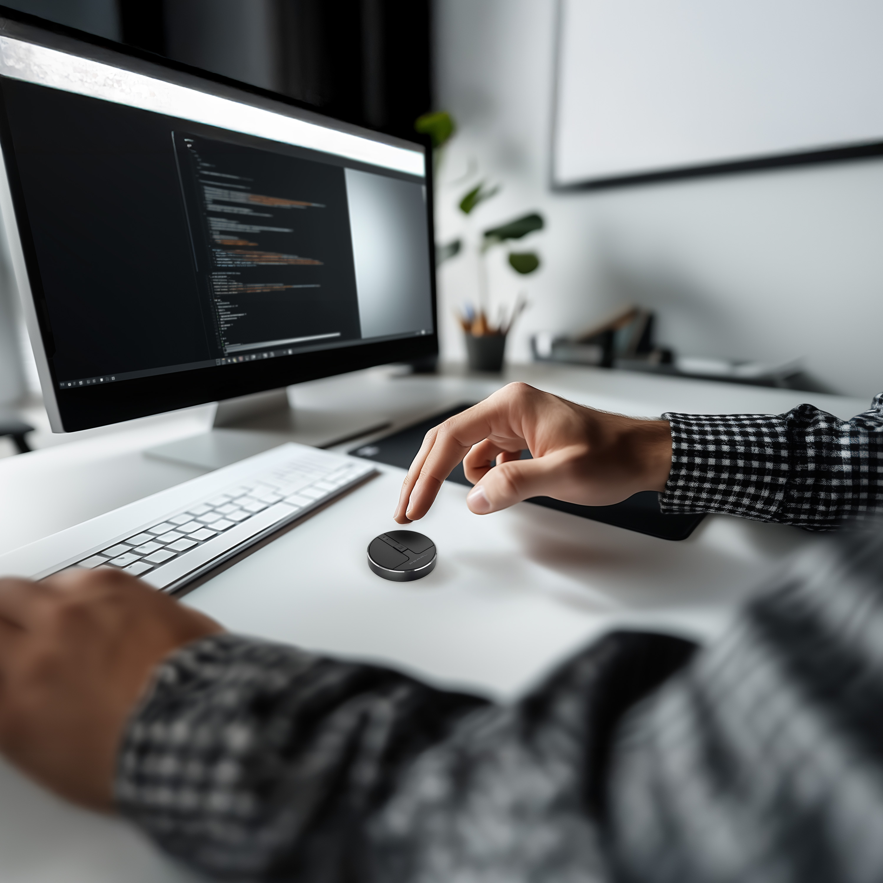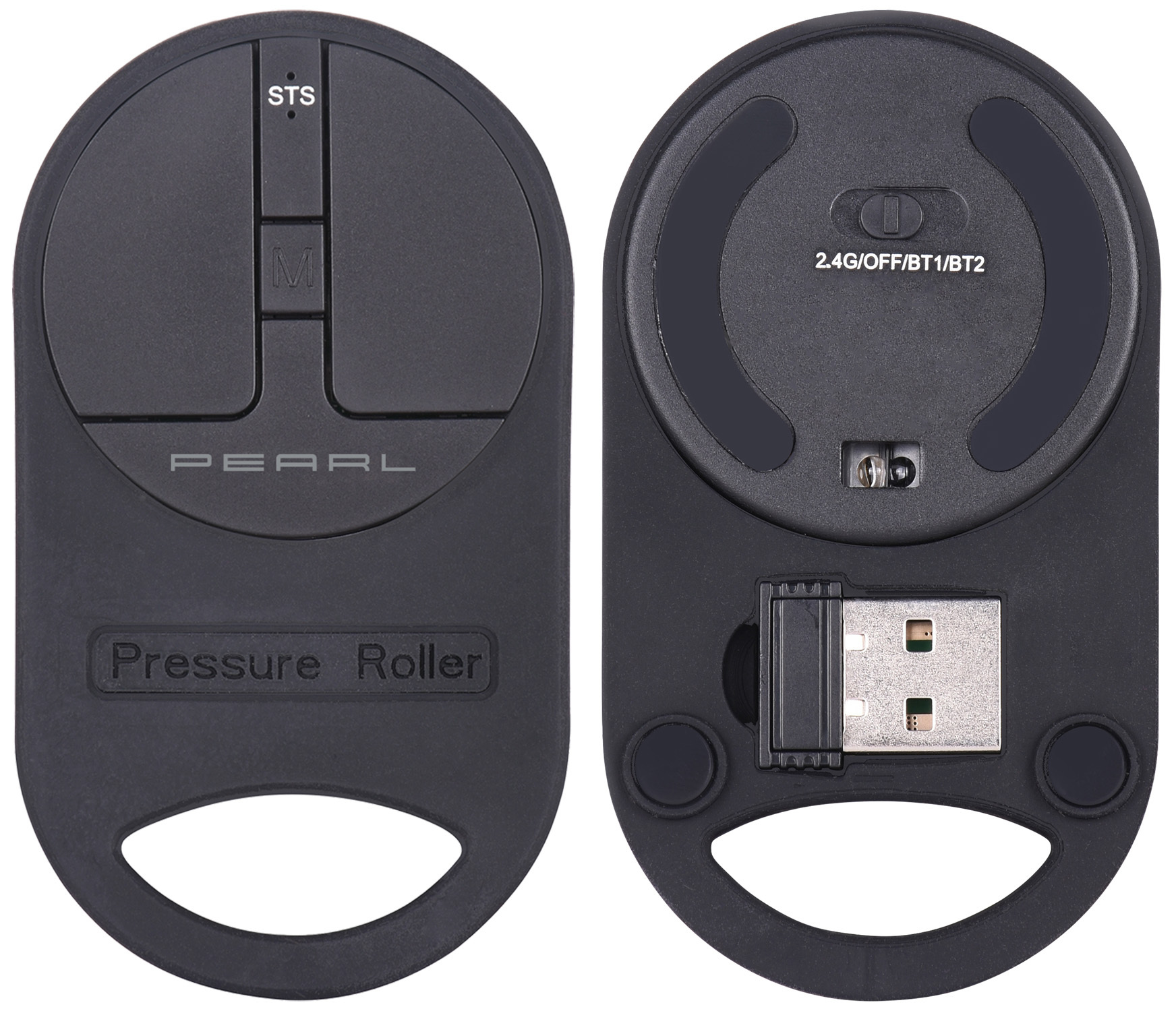Die Maus verfügt über zwei Multifunktionstasten, die die Funktionen der linken, rechten und mittleren Maustaste abbilden. Ergänzt wird dies durch eine intelligente Scrolltaste: Scrollgeschwindigkeit und -richtung lassen sich über die Druckstärke und die Bewegungsrichtung der Maus steuern. Damit stehen trotz der kompakten Bauform zentrale Bedienfunktionen zur Verfügung.
