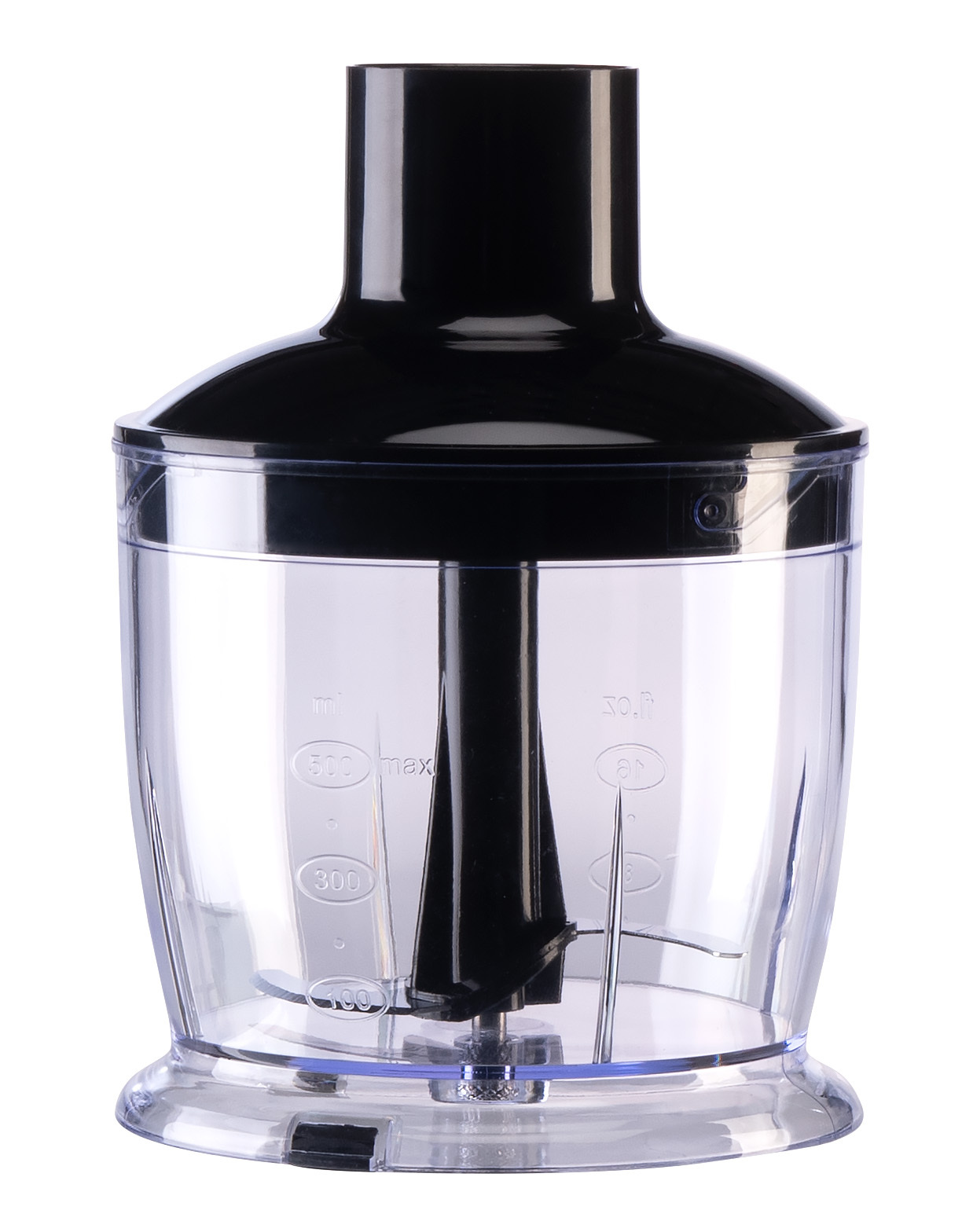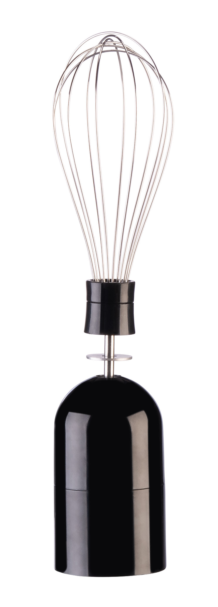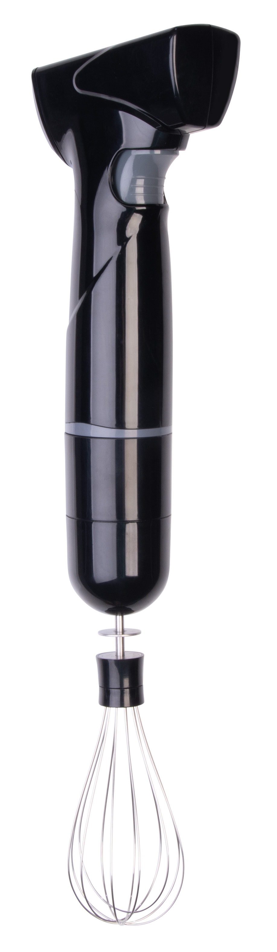 Das Set besteht aus einer Motoreinheit mit abnehmbarem Mixstab und weiterem Zubehör. Dazu gehören ein Schneebesenaufsatz für die Zubereitung von Eischnee, ein Zerkleinerungsbehälter zum Hacken von Zwiebeln oder Kräutern sowie ein verschließbarer Messbecher zum exakten Dosieren der Zutaten.