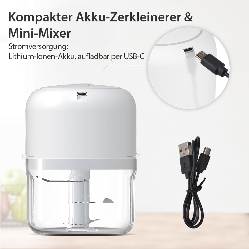 Ein leistungsstarker Lithium-Ionen-Akku hält bei täglichem Gebrauch bis zu einem Monat. Das Aufladen funktioniert bequem über das mitgelieferte USB-Kabel. Dank kabelloser Funktion kann der Zerkleinerer flexibel an verschiedenen Orten zum Einsatz kommen - in der Küche oder beim Camping.