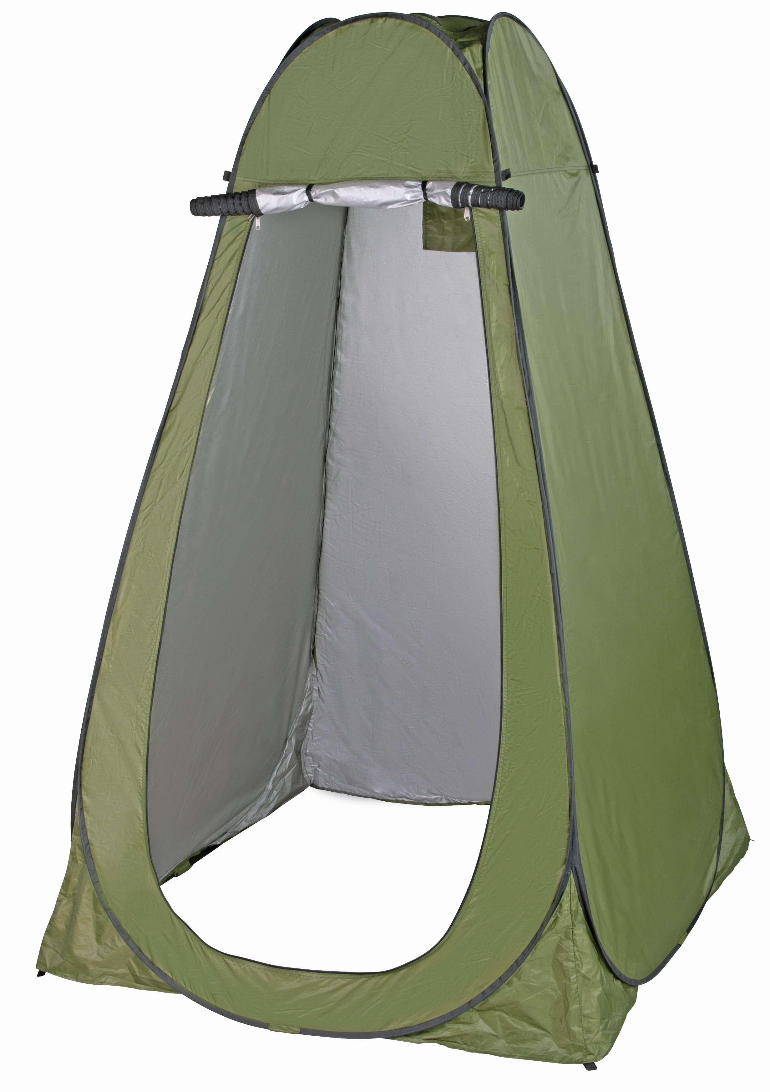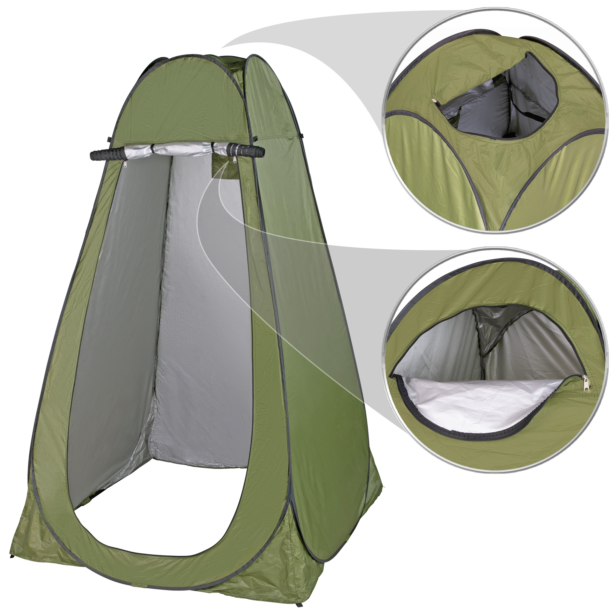 Der Innenraum bietet auch für größere Personen ausreichend Platz für komfortables Umkleiden, Duschen oder den Einsatz als WC. Das aus robustem 100 % Polyester gefertigt Zelt ist wetterbeständig und leicht zu reinigen.