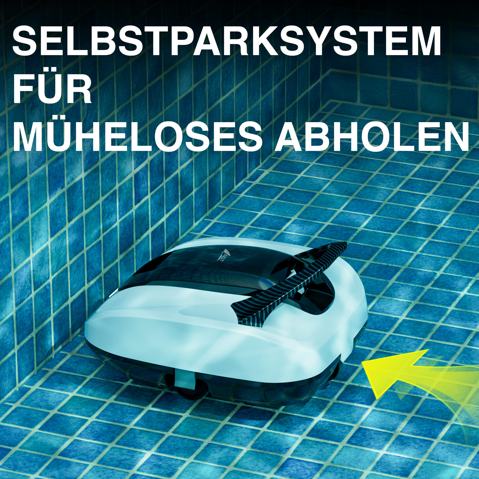 Die Steuerung des Poolroboters ist besonders komfortabel. Mit nur einem Tastendruck startet man den Reinigungsvorgang. Bei niedrigem Akkustand fährt das Gerät selbstständig zum Beckenrand und schaltet sich automatisch ab. So kann man ihn einfach mit einer Stange am mitgelieferten Haken einfach aus dem Wasser nehmen.
