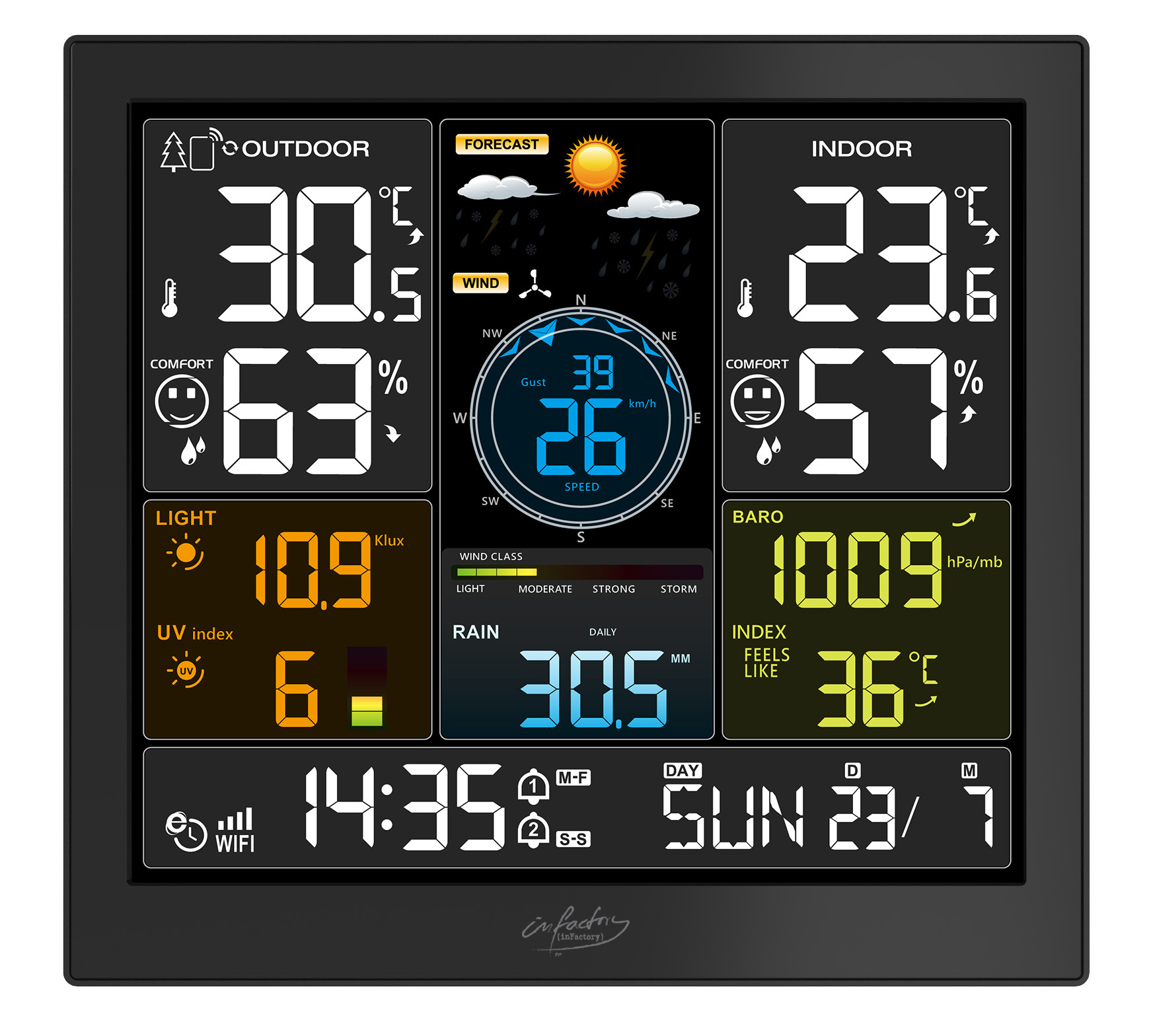 (lifepr) (Buggingen, 12.06.2025) Die Frage, wie das Wetter wird, ist immer interessant: Muss ich die Jacke oder gar einen Regenschirm mitnehmen? Kann ich meine Gartenarbeit erledigen oder eine Fahrradtour unternehmen? Die WLAN-Funk-Wetterstation FWS-300.XL V2 von infactory zeigt auf dem großzügigen XL-Farbdisplay verschiedene Wetterdaten wie Temperatur, Luftfeuchtigkeit, Windgeschwindigkeit, Windrichtung, Niederschlagsmenge, UV-Index und Luftdruck. Der Kombi-Außensensor misst diese Wetterparameter präzise und überträgt sie kabellos bis zu 100 Meter weit an die Basisstation. Dank WLAN-Anbindung lassen sich die Daten in Echtzeit über die kostenlose App für Android und iOS abrufen und analysieren. Zudem ist die Station mit den Wetterplattformen Weather Underground und Weathercloud kompatibel, was eine weltweite Vernetzung ermöglicht. Ein integrierter Wecker mit zwei einstellbaren Alarmzeiten sowie die Speicherung von Minimal- und Maximalwerten runden die Ausstattung ab.