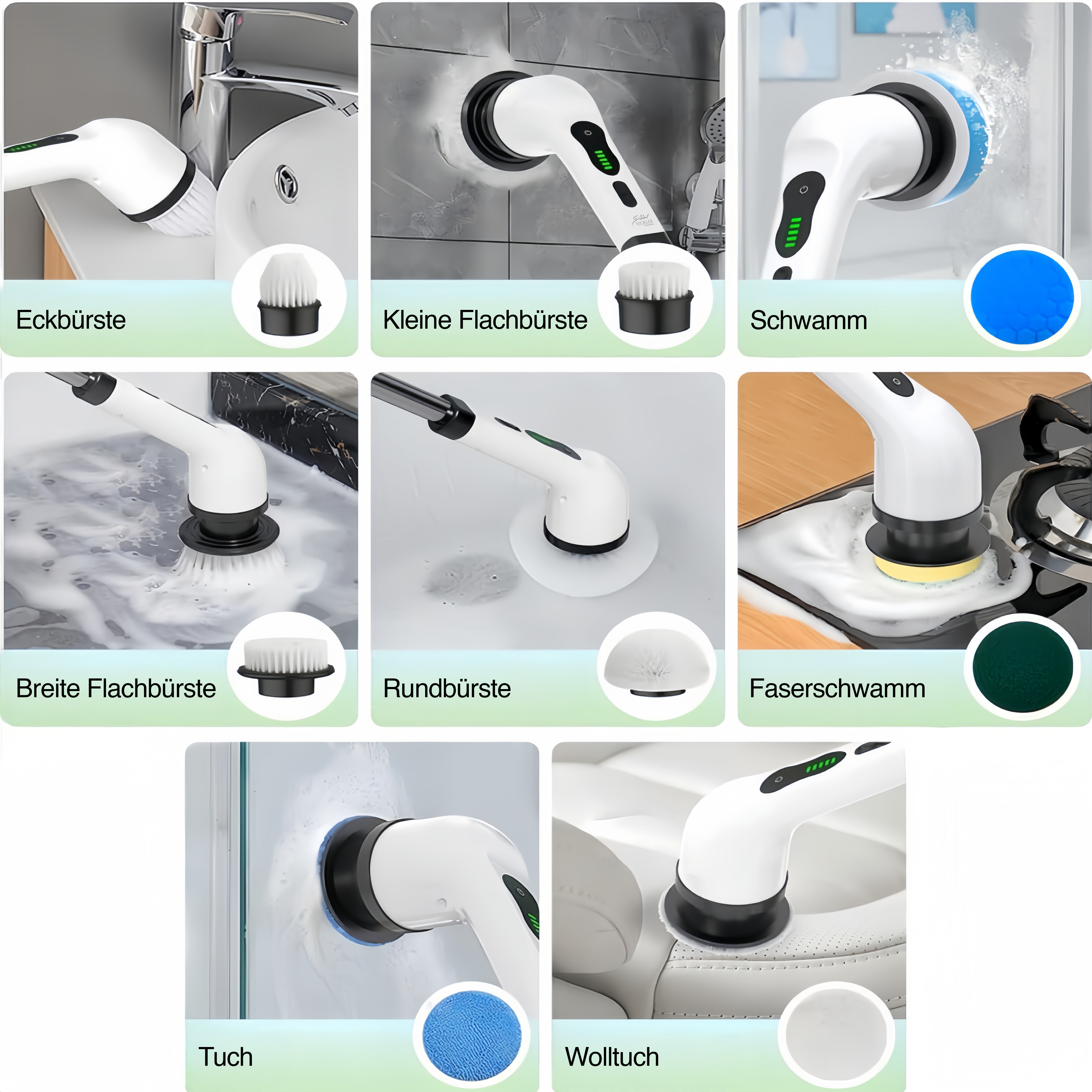 Acht spezialisierte Reinigungsaufsätze: Das Zubehör-Set umfasst verschiedene Aufsätze für unterschiedliche Reinigungsaufgaben: vier Bürsten mit verschiedenen Härtegraden, zwei Schwämme und zwei Mikrofaser-Aufsätze. Diese Ausstattung ermöglicht die optimale Reinigung aller Oberflächentypen.