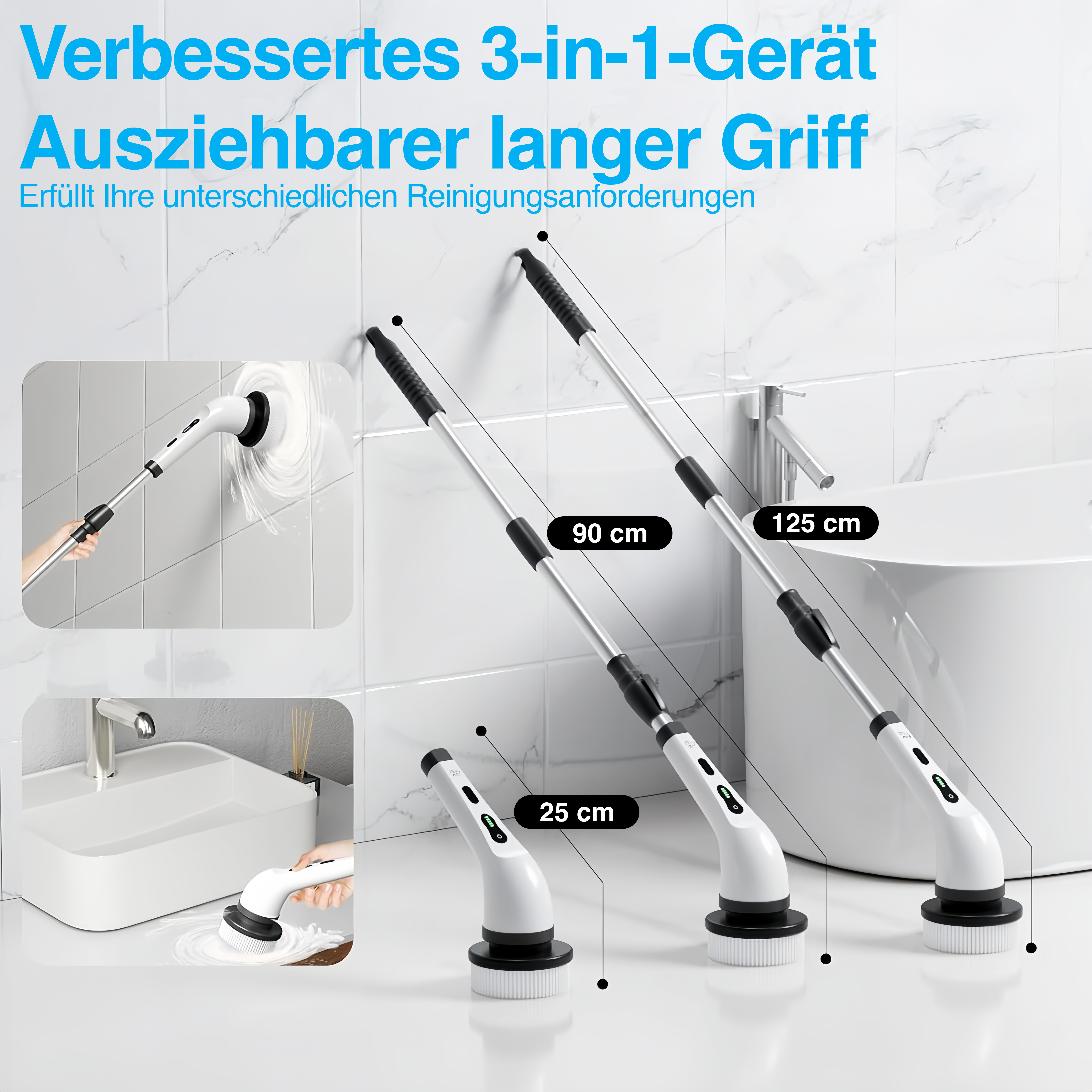 Vielseitige Reinigungsanwendungen: Die Akku-Reinigungsbürste von Sichler Haushaltsgeräte eignet sich für verschiedene Oberflächen, wie Fliesen, Waschbecken, Arbeitsflächen, Gartenmöbel und Autositze. Das Gerät funktioniert sowohl als kompaktes Handgerät als auch mit einer Verlängerung auf bis zu 125 Zentimeter Länge für schwer erreichbare Bereiche eingesetzt werden.