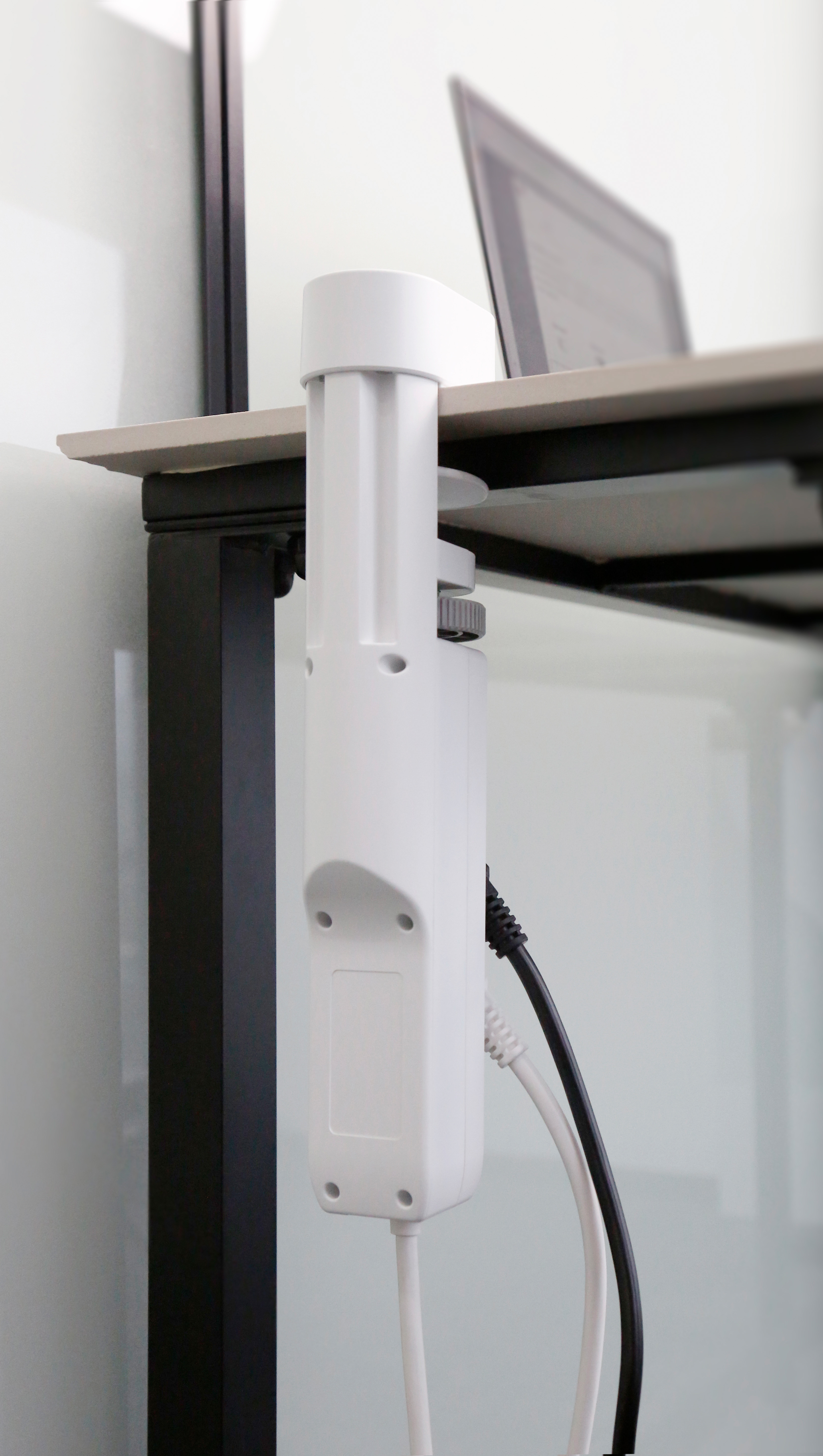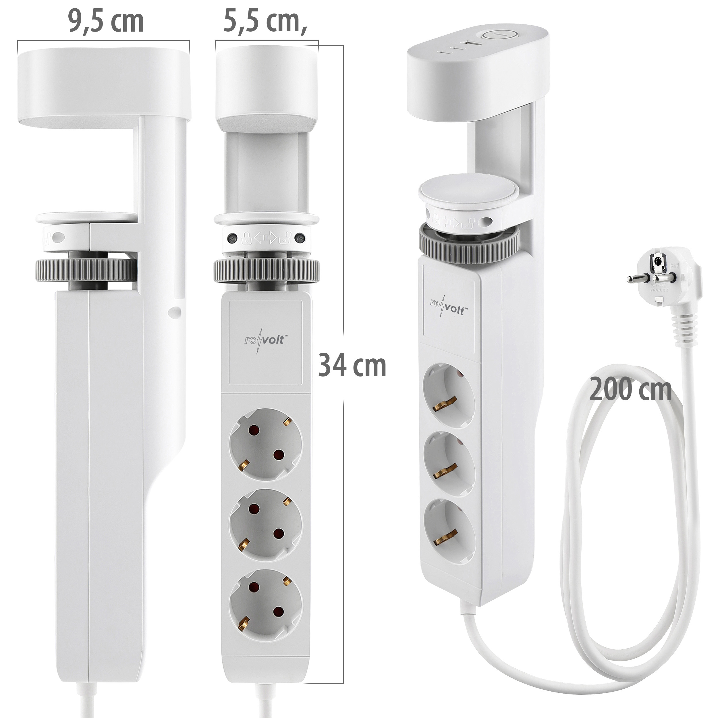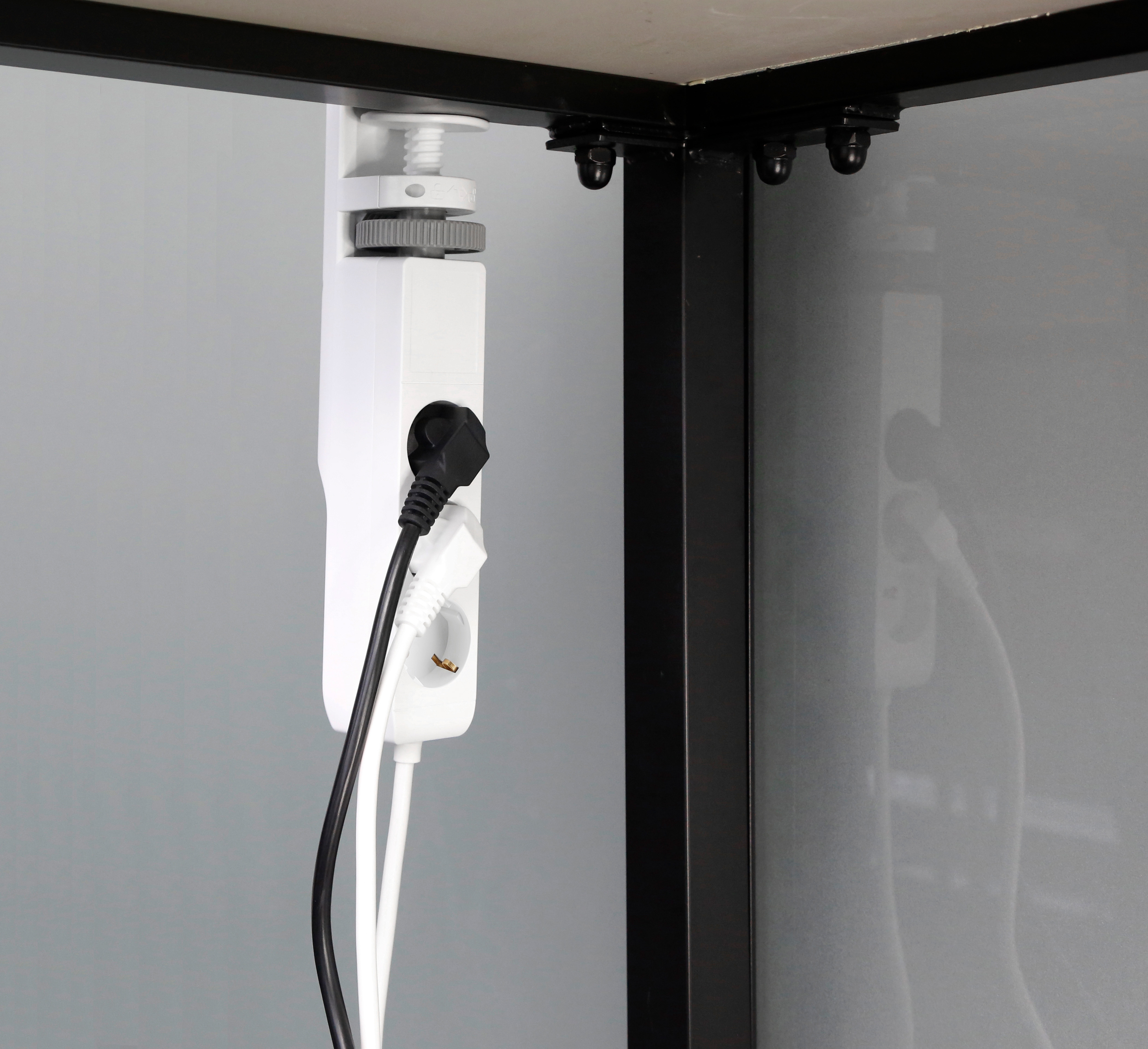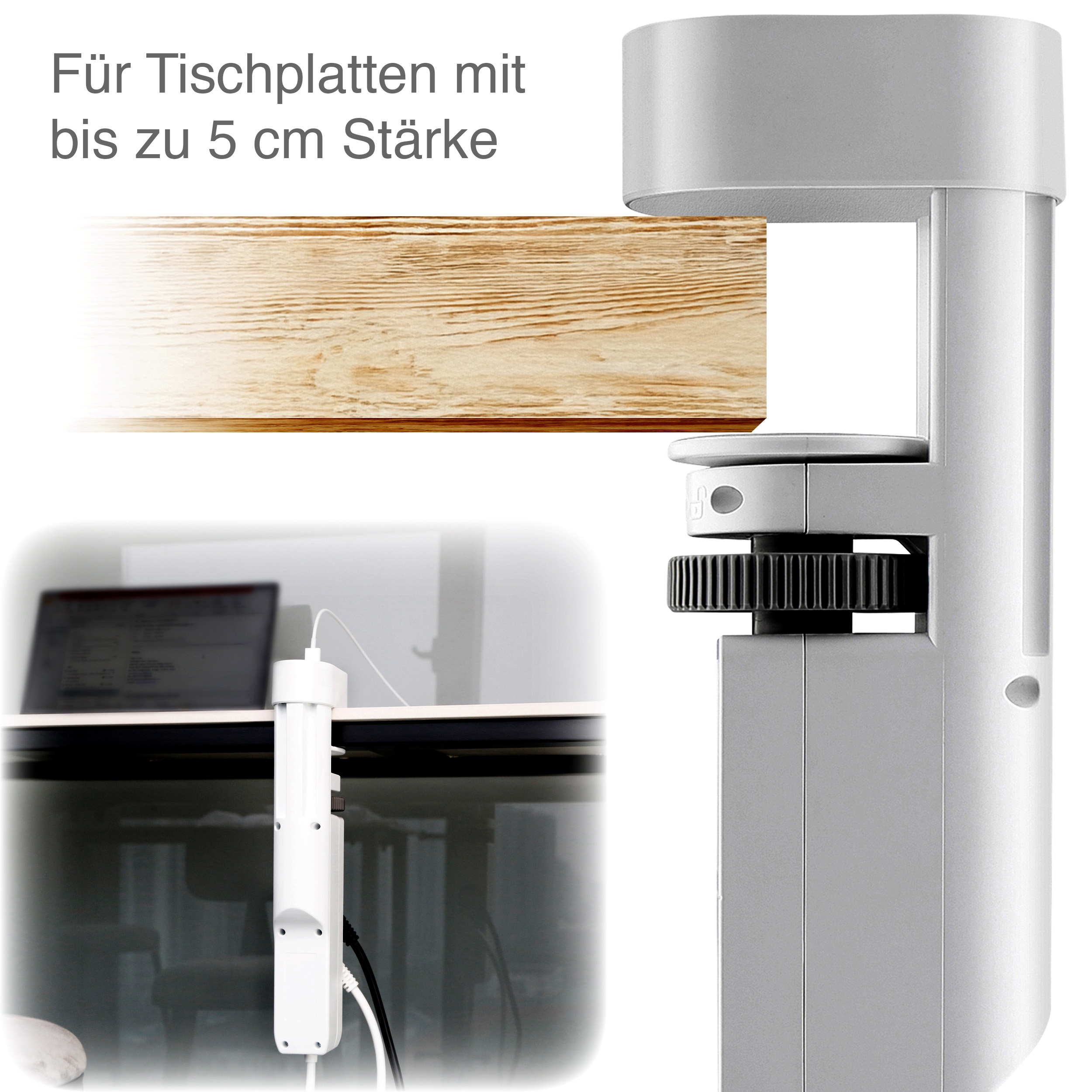 Werkzeugfreie Schraubklemm-Montage: Die Befestigung erfolgt mittels Schraubklemme an Tischplatten bis zu fünf Zentimeter Stärke - ohne Bohren oder Kleben! Das System lässt sich bei Bedarf rückstandslos entfernen. Das zwei Meter lange Anschlusskabel bietet flexible Positionierungsmöglichkeiten.