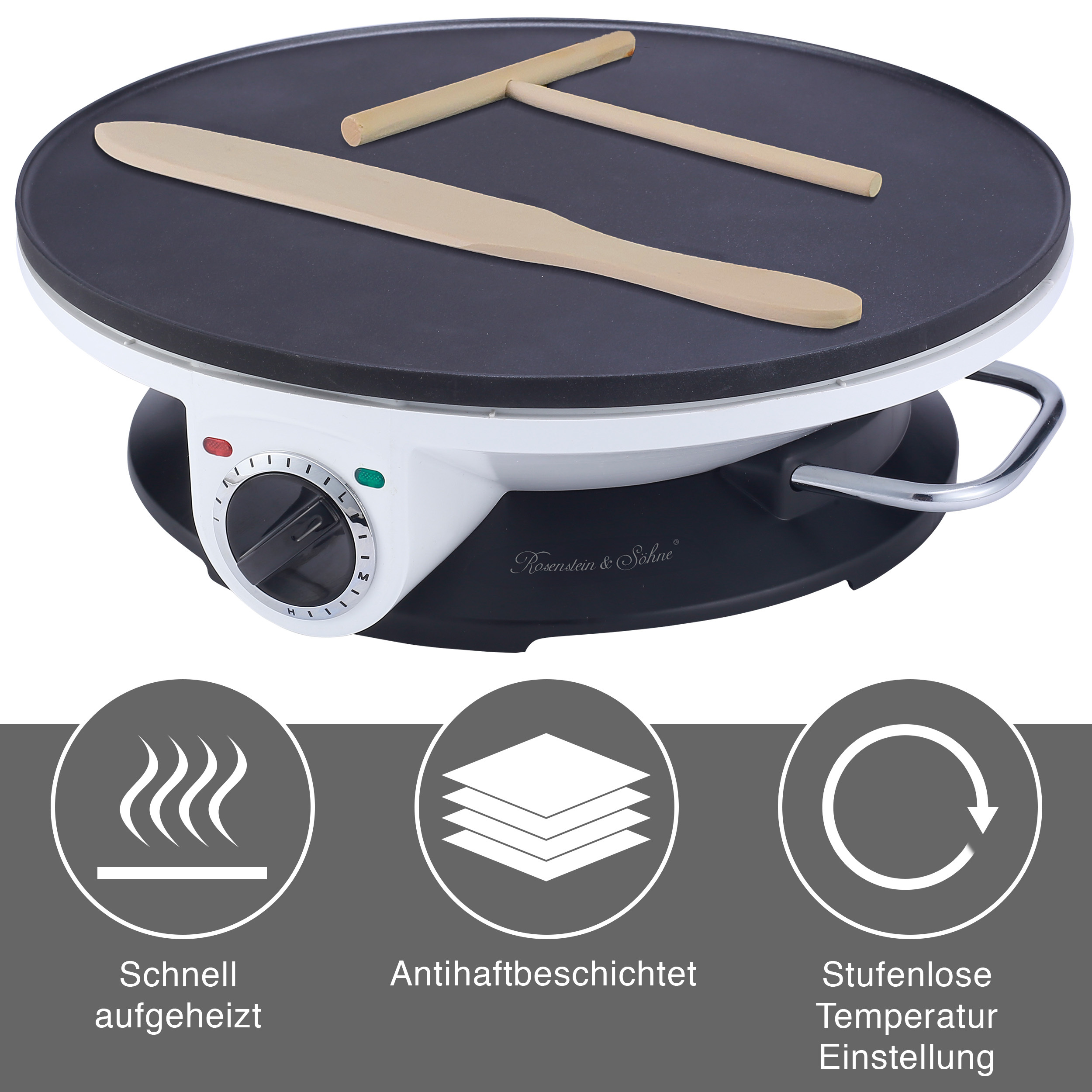 Große Backfläche für vielseitigen Einsatz: Mit dem XXL-Crêpes-Maker PKM-500 von Rosenstein & Söhne bereitet man mühelos köstliche Crêpes, fluffige Pancakes oder knusprige Tortillas zu. Auf der großzügigen Backfläche mit 32 cm Durchmesser ist genug Platz für kreativen Leckereien. Ob süß oder herzhaft, dieser XXL-Crêpes-Maker bringt Abwechslung in die Küche!