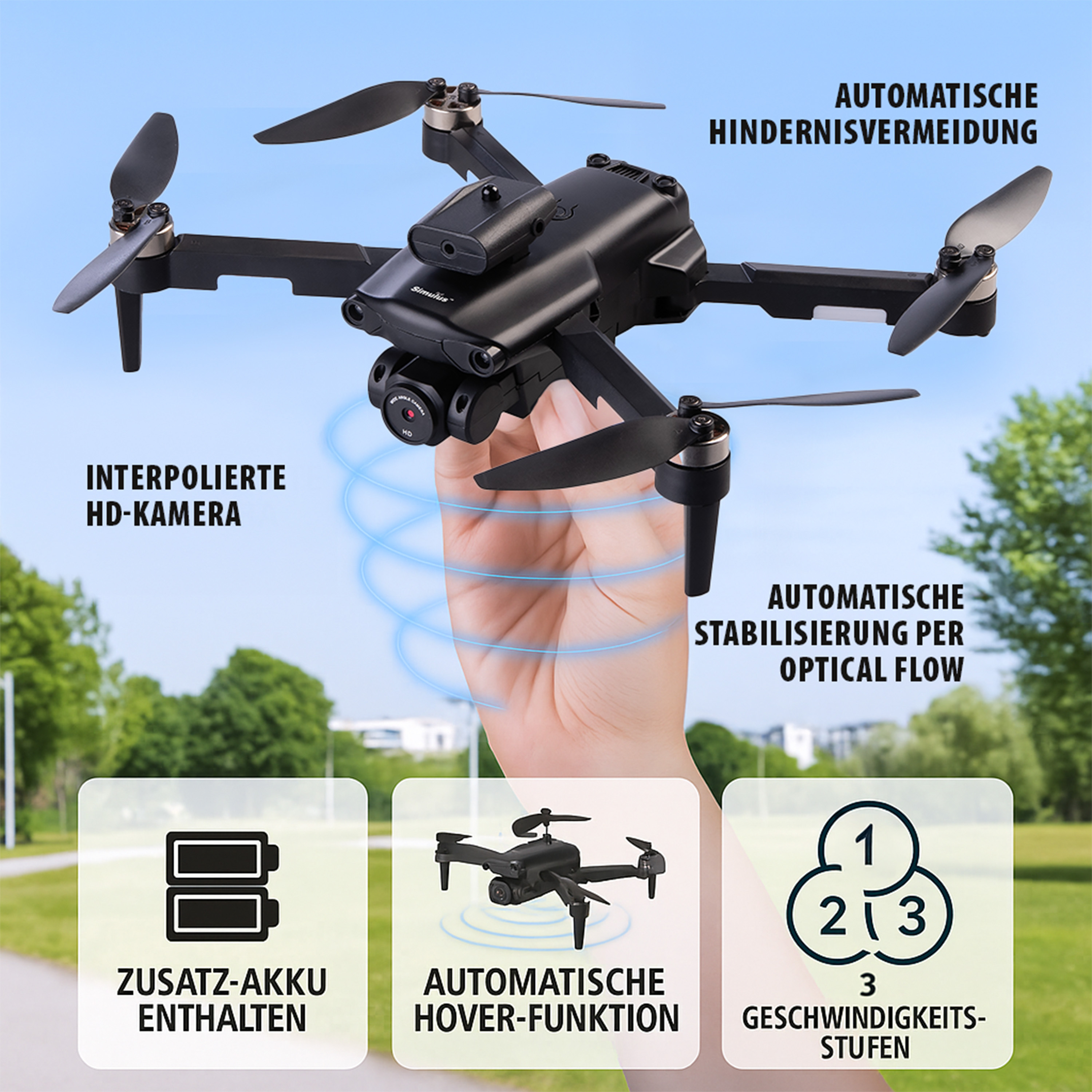(lifepr) (Buggingen, 29.07.2025) Die faltbare Drohne GH-320.fpv von Simulus lässt sich zusammenklappen und überallhin mitnehmen. Die eingebaute HD-Kamera macht scharfe Luftbilder und überträgt diese per WLAN direkt aufs Smartphone. Besonders praktisch: Das Gerät erkennt Hindernisse automatisch und weicht aus. Dadurch können auch Anfänger entspannt fliegen, ohne ständig Crashs befürchten zu müssen. Die Drohne eignet sich für alle, die gerne spektakuläre Aufnahmen aus der Luft machen möchten.