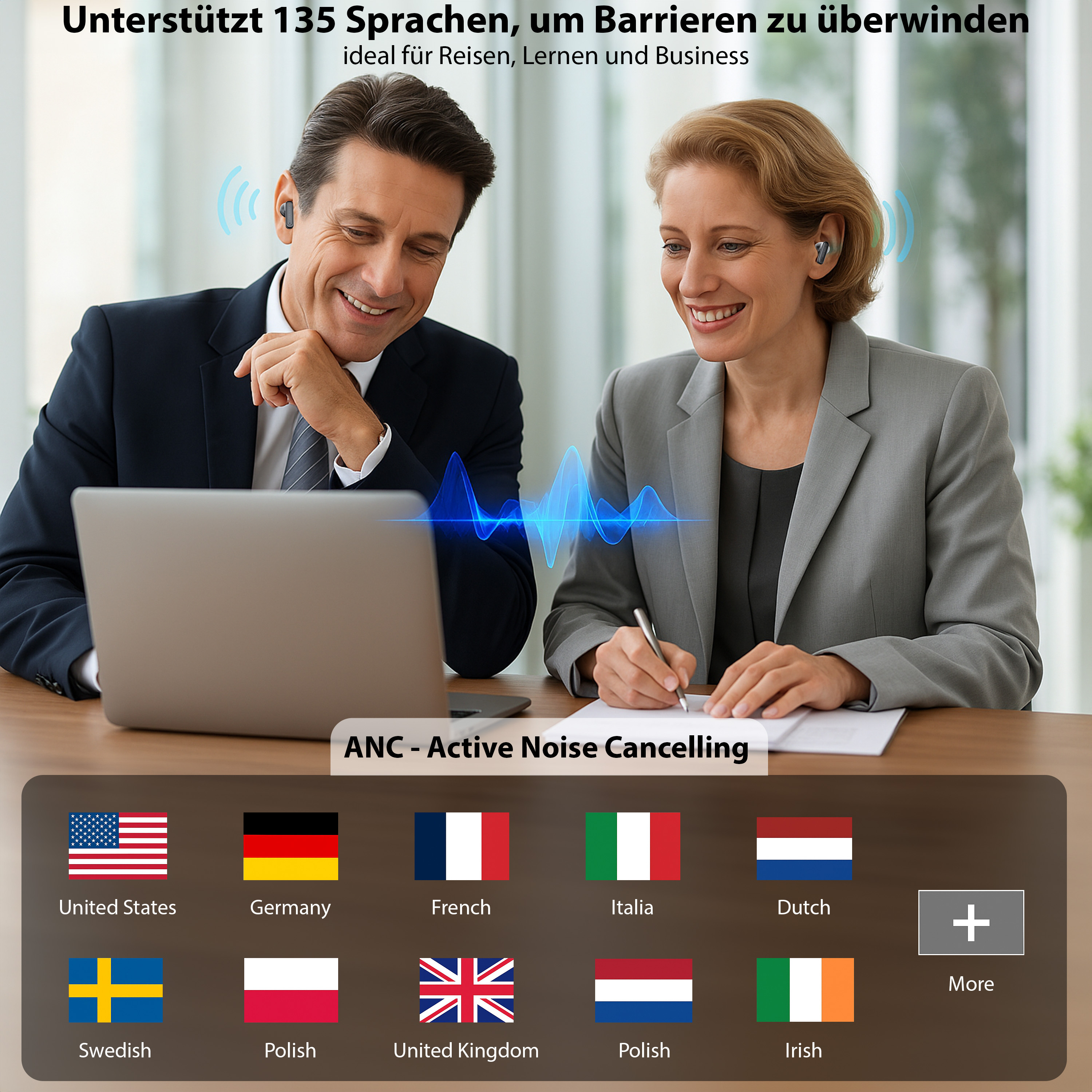 auvisio 2er-Set KI-Echtzeitzeitübersetzer & In-Ear-Kopfhörer, 135 Sprachen, ANC