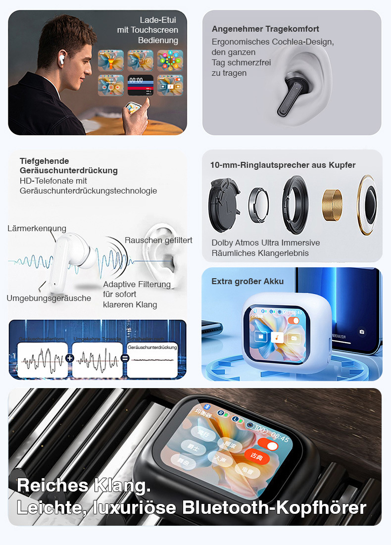 Alles im Griff - auf Fingertipp: Die Ladebox besitzt ein 5,1 cm großes Touch-Farbdisplay für direkte Steuerung. Hier lassen sich Einstellungen wie den Wechsel des Songs oder das Klangprofil direkt am Etui ganz ohne Umweg über das Handy vornehmen.