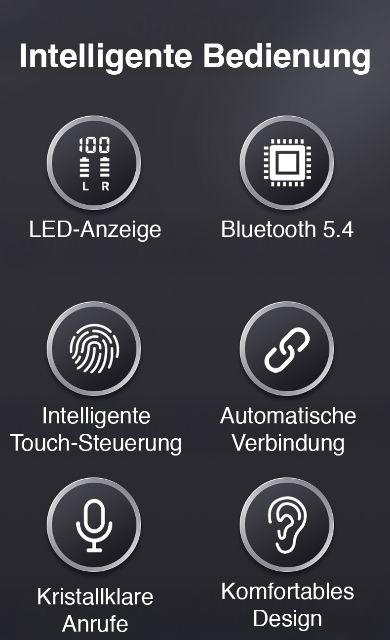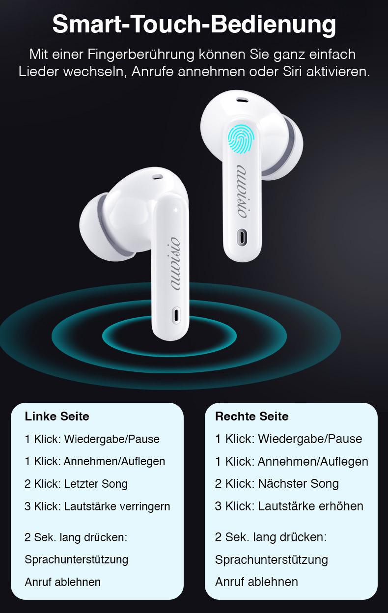 Antippen statt Tasten drücken: Die Kopfhörer reagieren auf Berührungen am Gehäuse. Musikwiedergabe, Anrufe und Sprachassistenten lassen sich so direkt steuern, ohne das Smartphone hervorzuholen.