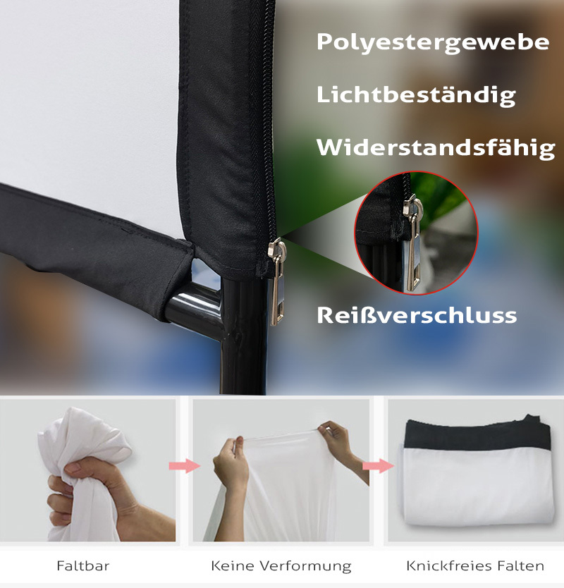 Die Leinwand lässt sich schnell auseinanderfalten und wieder zusammenlegen. Falten entstehen dabei nicht. Und in der Tasche ist alles einfach transportiert. Ideal für spontane Filmnächte oder Präsentationen auf der großen Wiese.