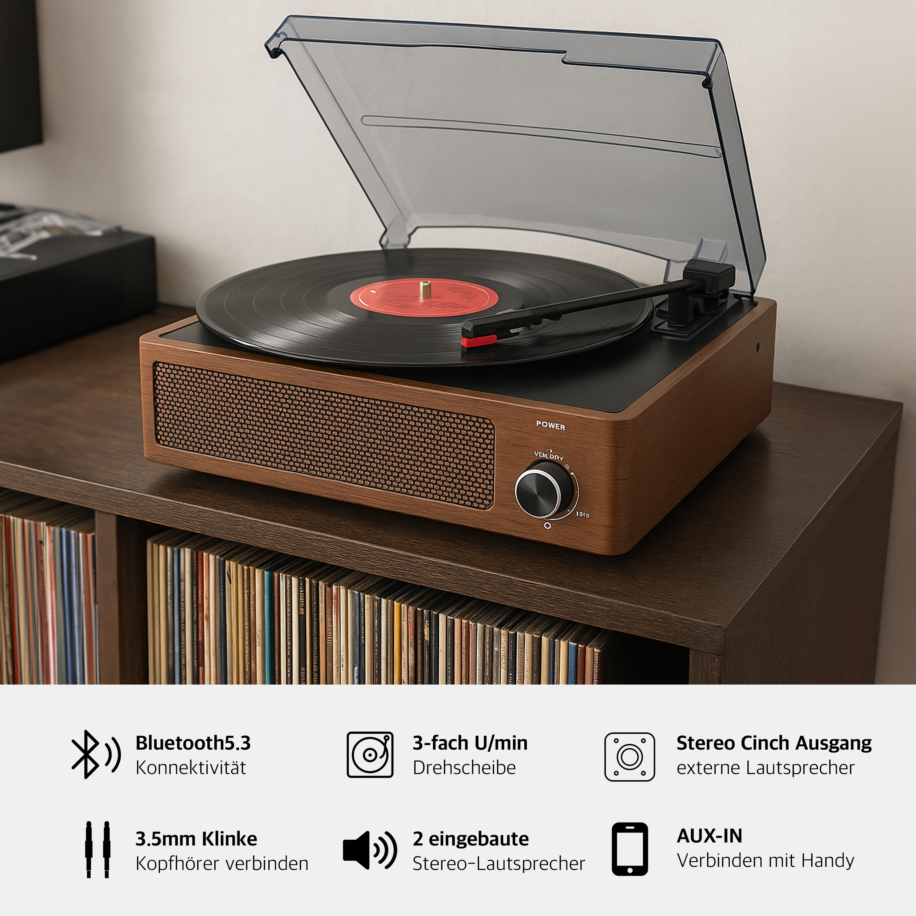 Auch für das HiFi-System: Per Stereo-Cinch lässt sich der Plattenspieler mit der HiFi-Anlage oder einem Verstärker verbinden. Oder man schließt einen Kopfhörer an und genießt seine Musik, ohne von der Umwelt gestört zu werden!