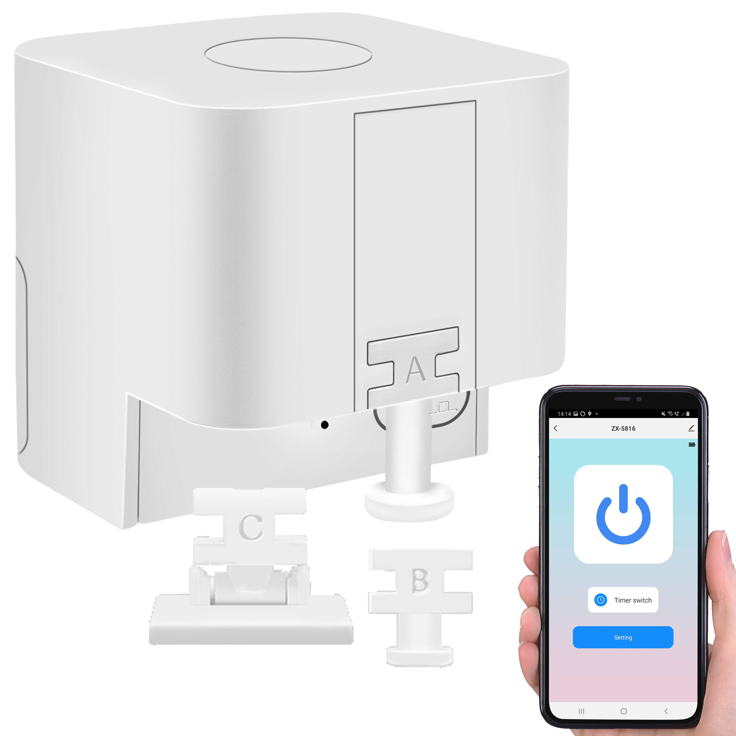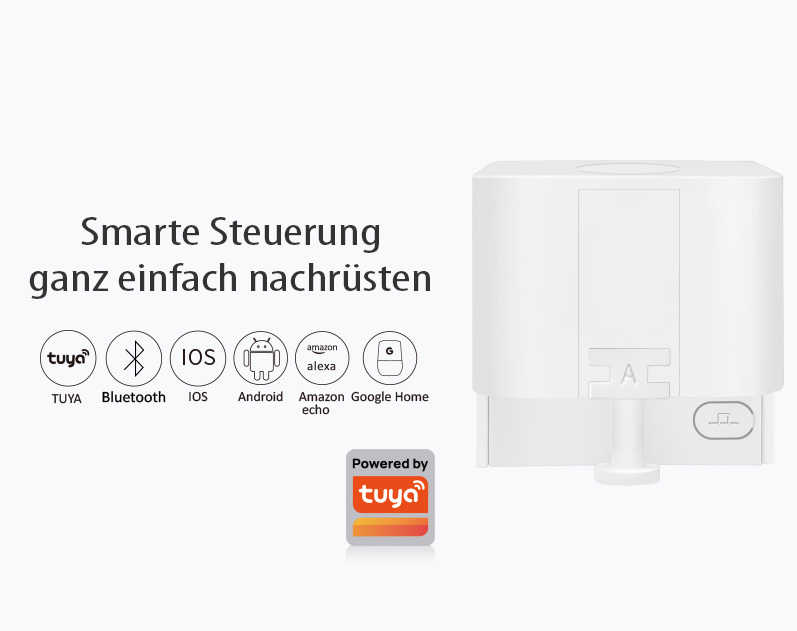 Smarte Steuerung ganz einfach nachrüsten: Dazu klebt man einfach den Schalter-Aufsatz von Luminea Home Control neben den Kippschalter oder Taster. Der integrierte Schalter-Adapter fungiert als mechanischer Finger und kommt in 3 verschiedenen Varianten, damit er perfekt zu dem Schaltmechanismus passt. Der Arm des Schalter-Aufsatzes wird direkt auf den Schalter oder Taster geklebt. Dann koppelt man den Aufsatz per Bluetooth mit dem Mobilgerät, und schon lassen sich Leuchten, Rollläden und Lüfter mit nur einem Fingertipp auf dem Smartphone-Display steuern. Auch Zeitsteuerungen können bequem per App eingerichtet werden.