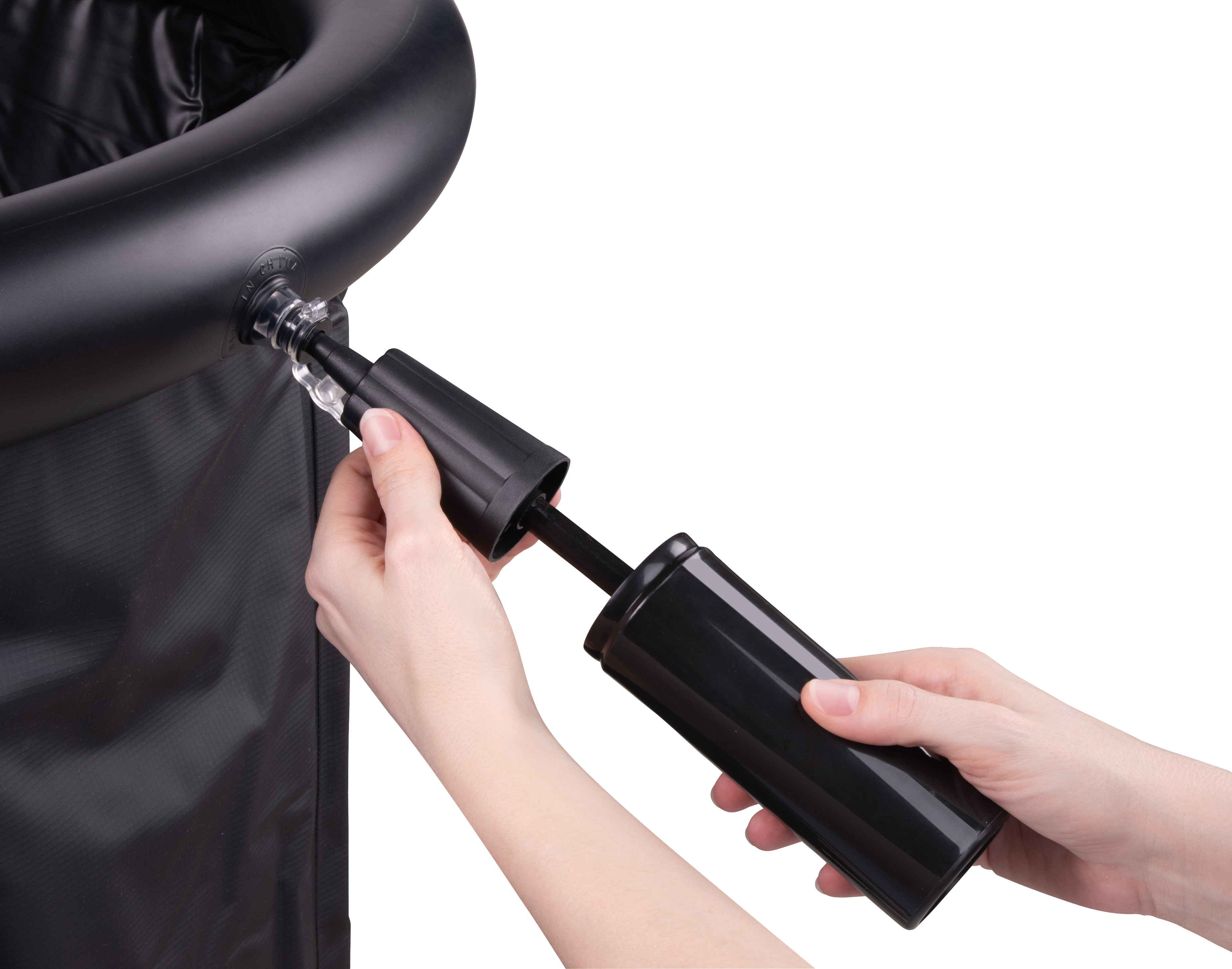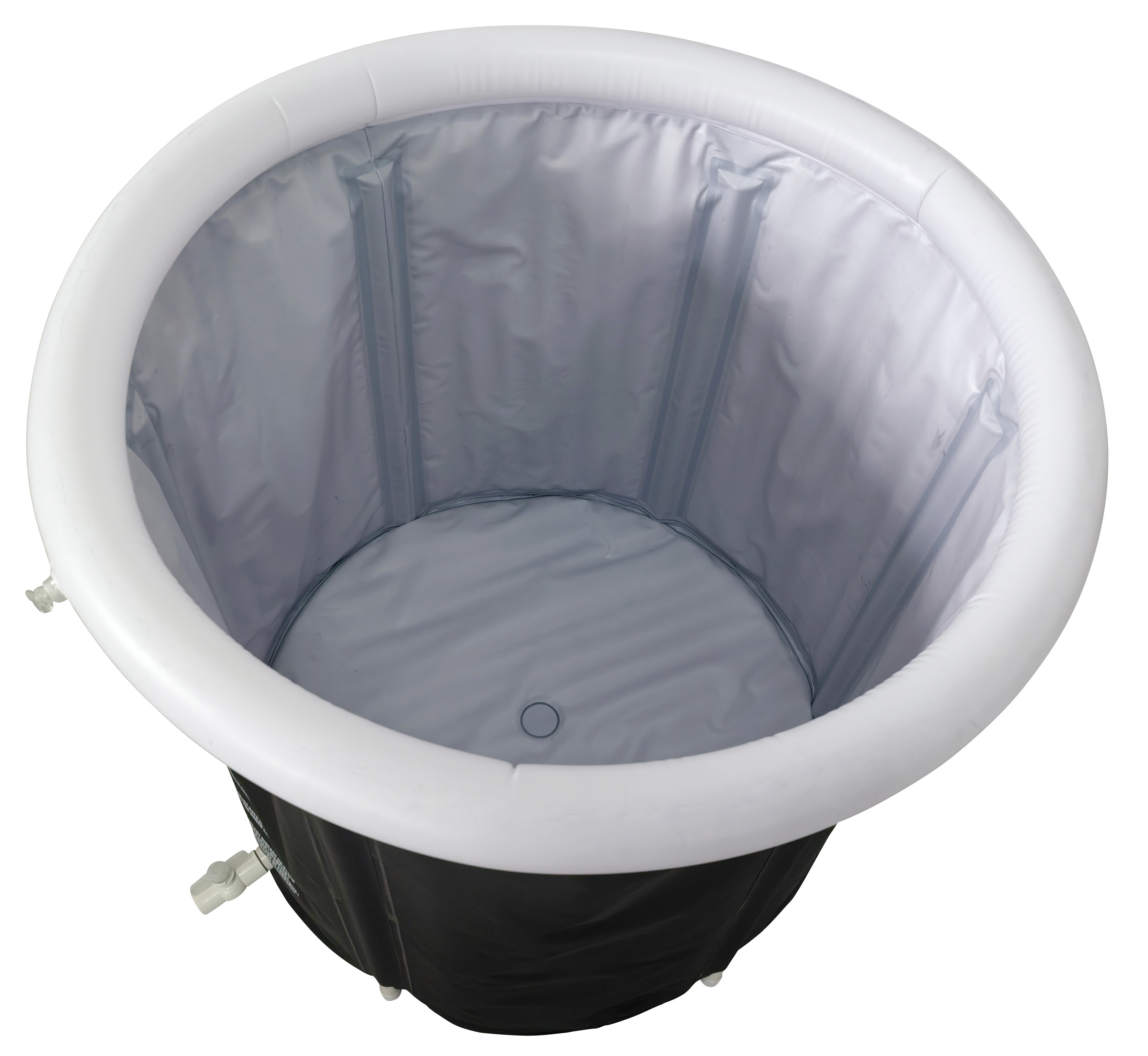 Schnell einsatzbereit: Mit wenigen Handgriffen lässt sich das Eisbad aufstellen. Einfach die Stützstangen einschieben, den oberen Ring mit der enthaltenen Luftpumpe aufpumpen und den Ablaufhahn anschrauben. Schon kann man den neuen Badezuber mit frischem Wasser befallen.