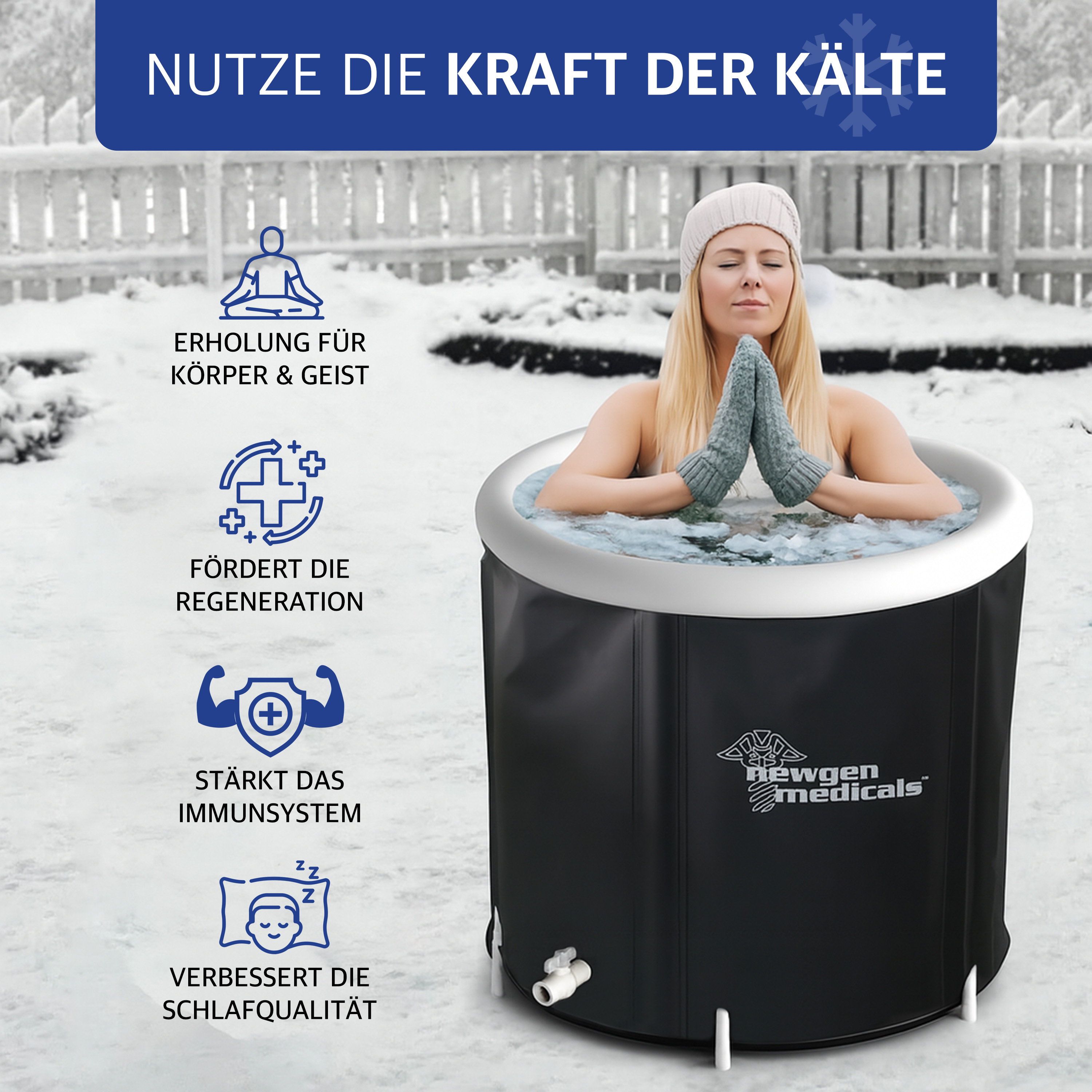 (lifepr) (Buggingen, 01.09.2025) Abtauchen, abschalten, regenerieren: Mit dem Eisbad-Set von newgen medicals wird Kryotherapie ganz einfach – ob nach dem Sport oder zur Stärkung des Immunsystems. Das großzügige Becken mit 220 Litern Volumen und 5-facher Isolierung hält das Wasser kalt, der aufblasbare Deckel schützt zusätzlich. Im praktischen Komplett-Set ist alles dabei: Pumpe, Ablaufhahn, Abdeckung und sogar eine Tragetasche. Der Aufbau ist kinderleicht – und das Bad jederzeit einsatzbereit. Ideal für alle, die auch unterwegs, auf Reisen oder bei Sport-Events nicht auf das Kältebad verzichten möchten.