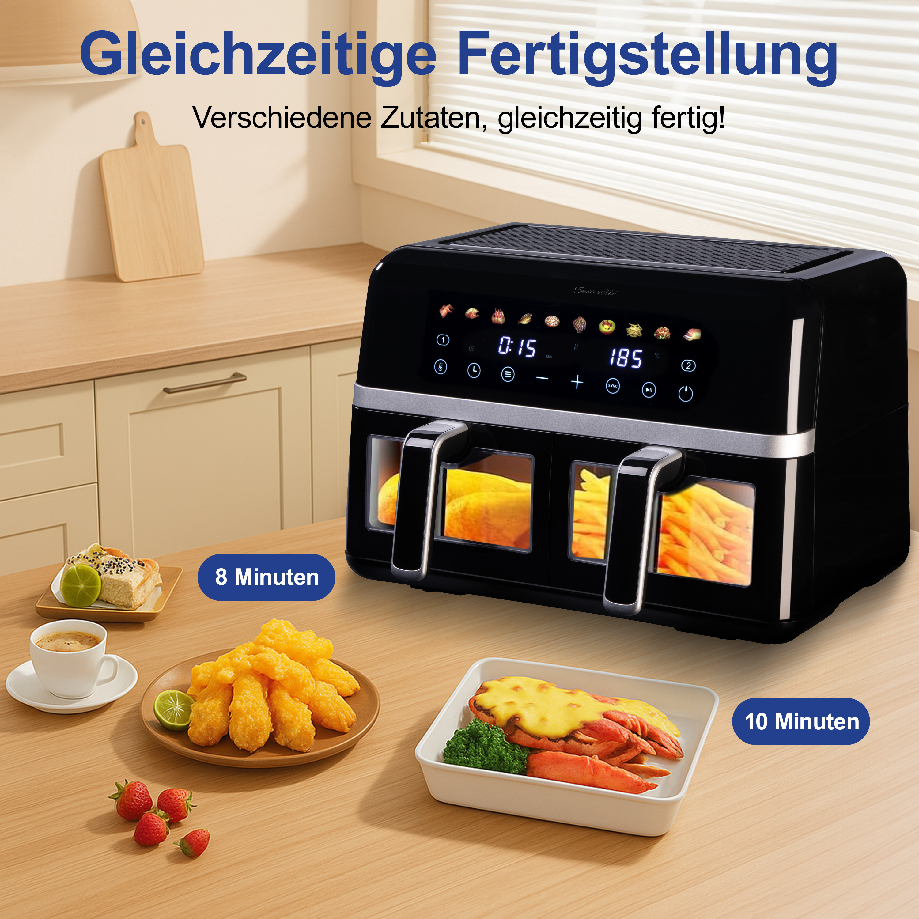 (lifepr) (Buggingen, 03.09.2025) Mit der Dual-Heißluftfritteuse HF-420 von Rosenstein & Söhne kann man in zwei Fächern mit unterschiedlichen Temperaturen und Garzeiten eine ganze Hauptmahlzeit inklusive Beilagen zubereiten, beispielsweise Hähnchen mit Pommes. Alternativ können die beiden separaten 4,5-Liter-Schubladen mit Sichtfenster auch für Beilagen für eine Großfamilie oder Gästeschar genutzt werden. Das spart Zeit, da alles zur gleichen Zeit fertig ist. Mit 2.800 Watt Leistung und zehn voreingestellten Programmen für Fleisch, Pizza, Kuchen, Pommes und Gemüse gelingt jedes Gericht perfekt. Über das moderne Touch-Bedienpanel mit großen Digitaldisplays lässt sich die Temperatur präzise von 80 bis 200 °C und die Zeit flexibel von 1 bis 60 Minuten einstellen. Die antihaftbeschichteten Schubladen und Einlegegitter sind spülmaschinengeeignet und sorgen so für eine mühelose Reinigung.