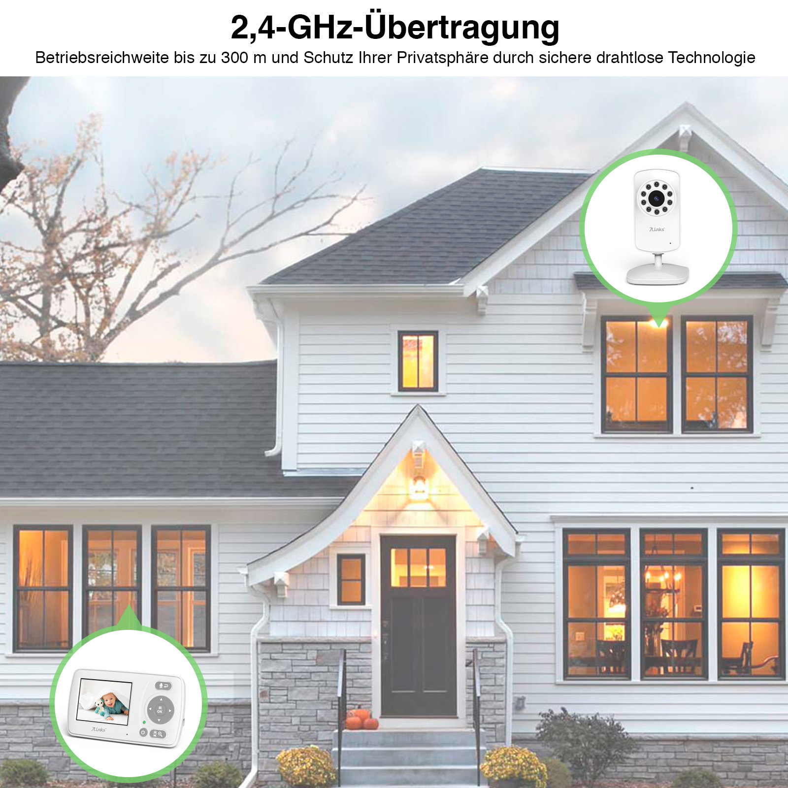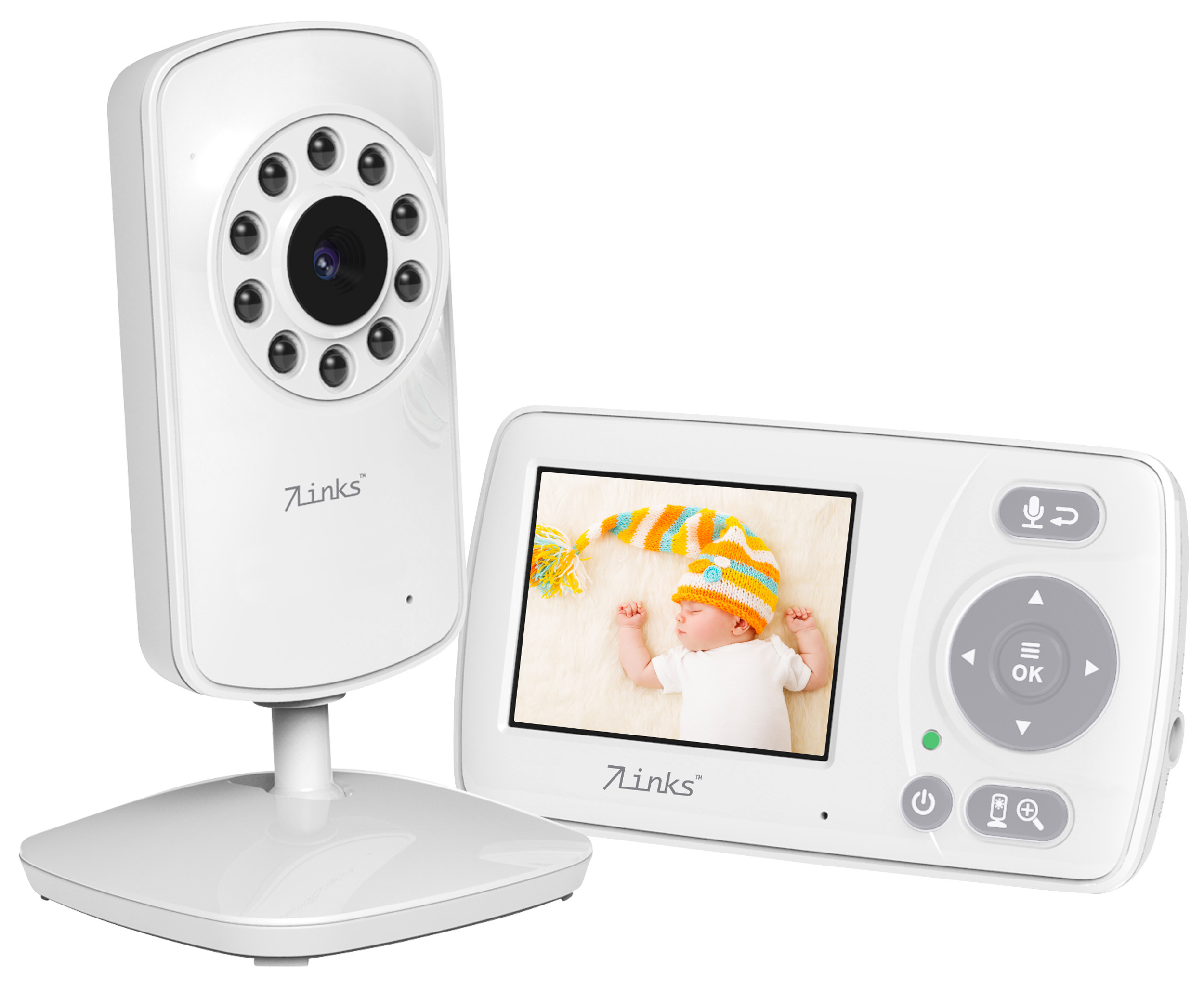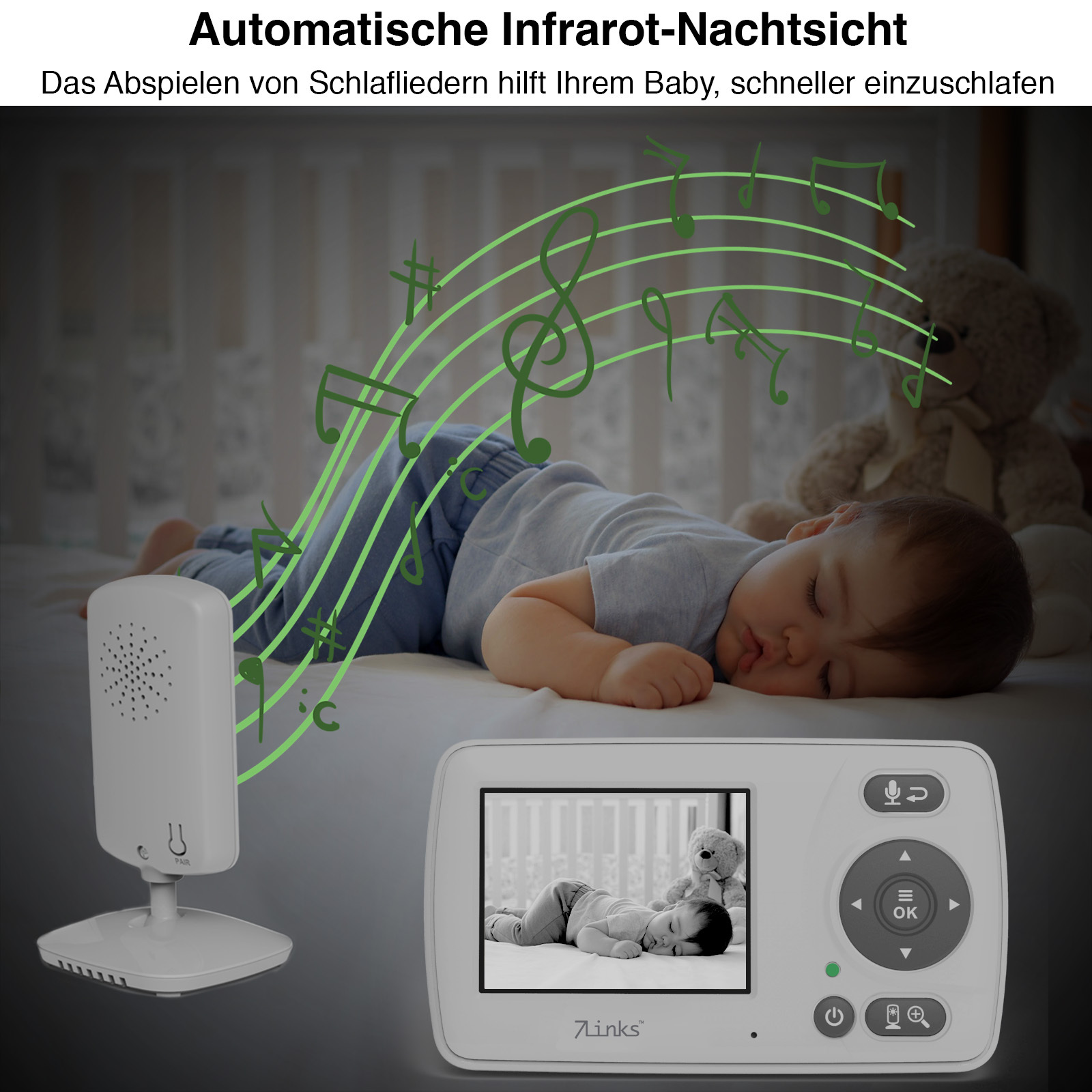 Kontinuierliche Videoüberwachung: Das digitale Video-Babyphone von 7Links ermöglicht eine durchgehende Überwachung des Kindes. Die Elterneinheit mit integriertem Display dient dabei als Steuerzentrale. Das System bietet Sicherheit und Komfort bei der Kinderbetreuung zu Hause.