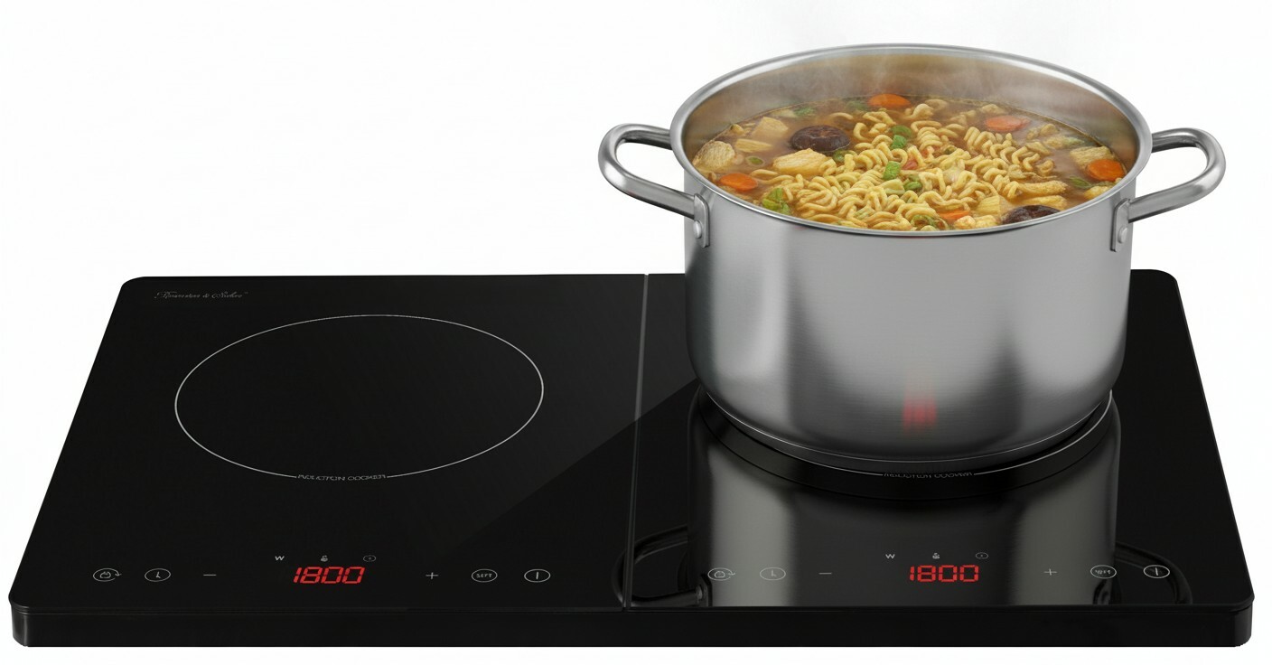 Zwei unabhängige Kochzonen mit hoher Gesamtleistung: Das Doppel-Induktionskochfeld von Rosenstein & Söhne bietet zwei individuell steuerbare Kochzonen mit einer Gesamtleistung von bis zu 3.500 Watt, sodass verschiedene Gerichte gleichzeitig zubereitet werden können. Es ist ideal für kleine Küchen, Camping oder Ferienwohnungen und ermöglicht schnelles sowie energieeffizientes Kochen.