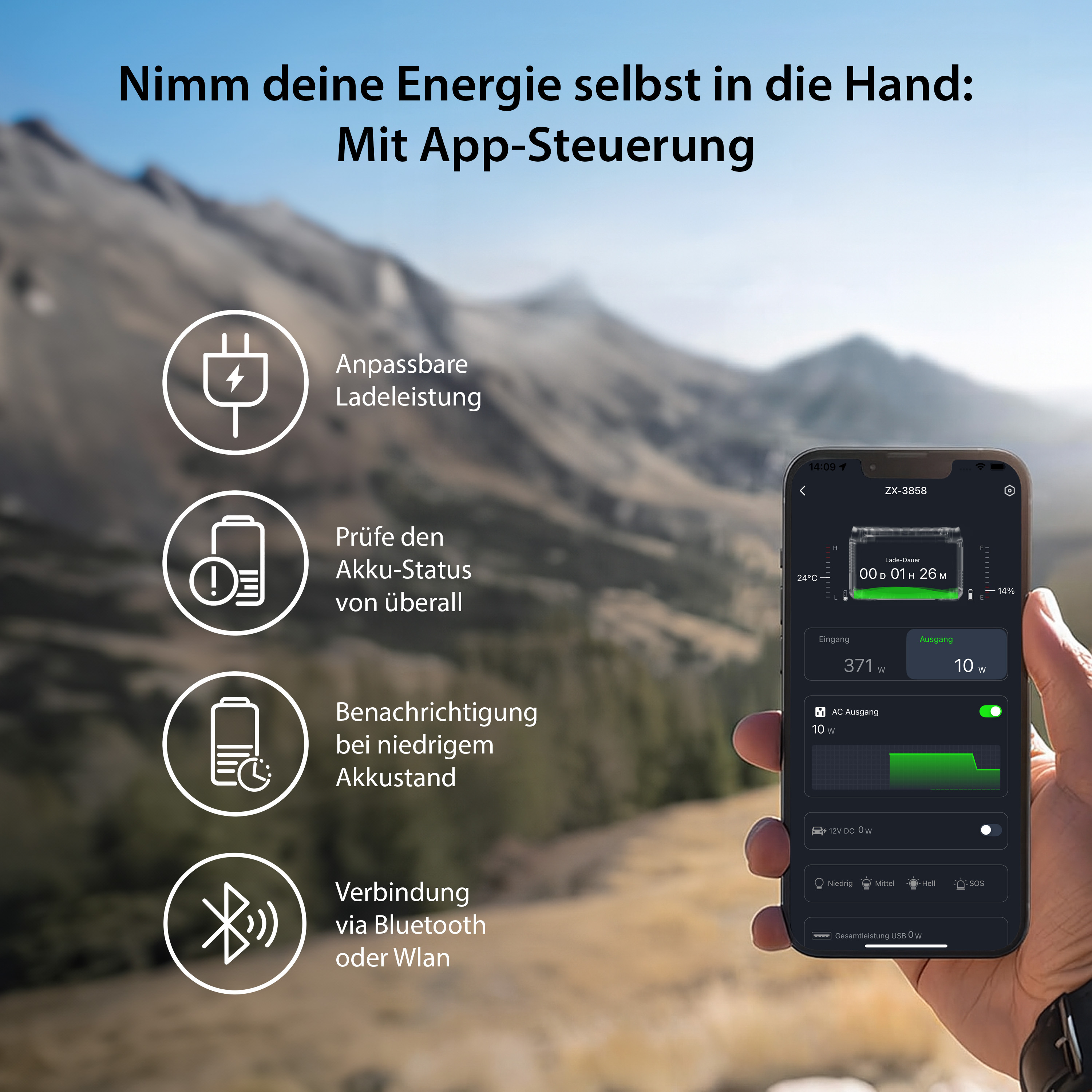 Weltweite Fernüberwachung per App: Die ELESION-App ermöglicht kontinuierliche Überwachung wichtiger Parameter wie Akku-Ladestand und Temperatur von jedem Standort aus. Alle Einstellungen lassen sich bequem über Android- oder iOS-Mobilgeräte vornehmen.