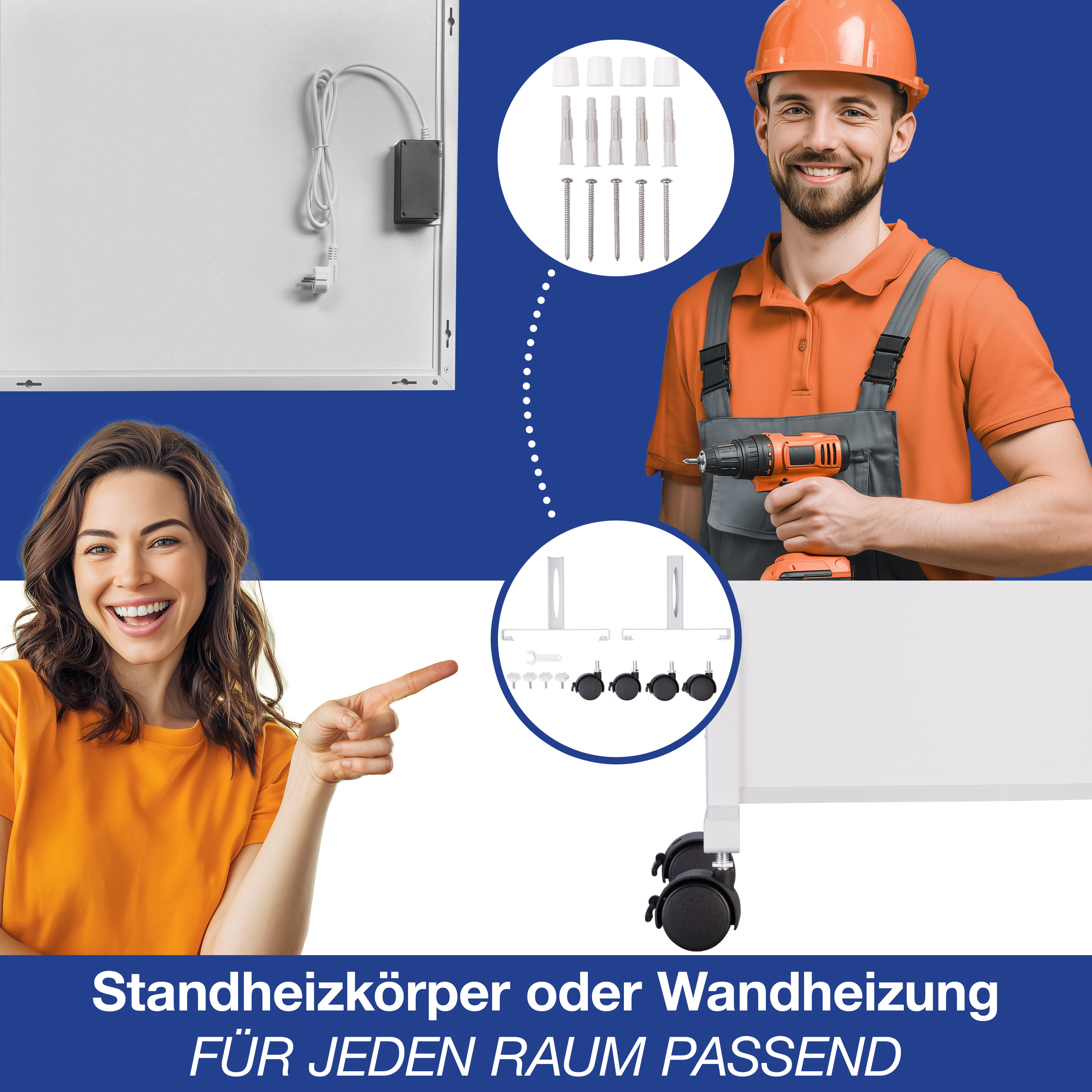 Mobiler Heizkomfort für jeden Raum: Dank praktischem Standfuß-Set lassen sich die WLAN-Infrarot-Heizungen ganz einfach mit Rollen ausstatten. So platziert man die Heizung flexibel genau dort, wo man sie benötigt - ganz ohne Bohren und Wandmontage.
