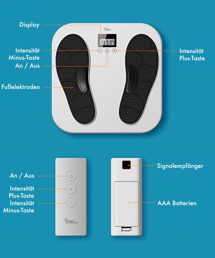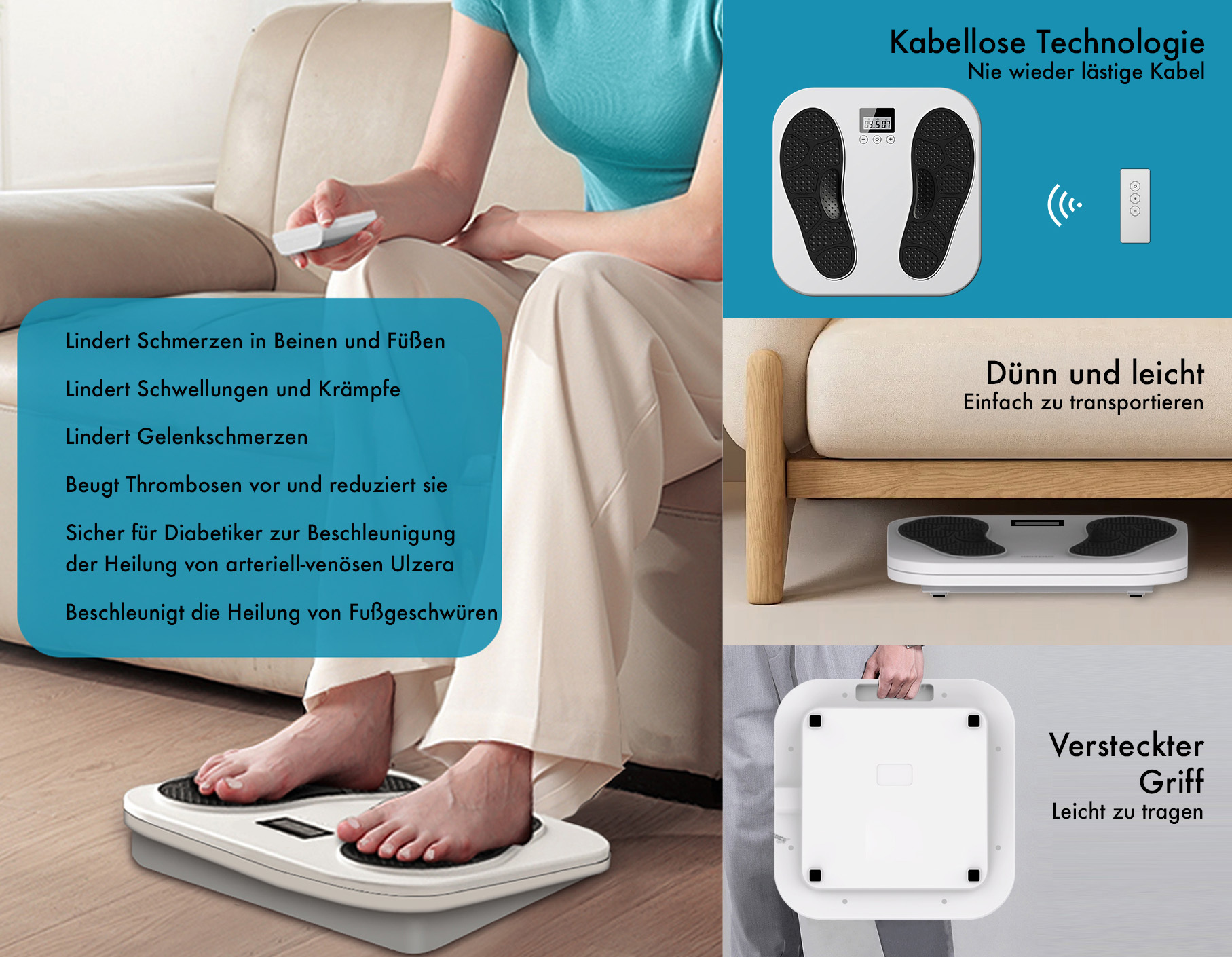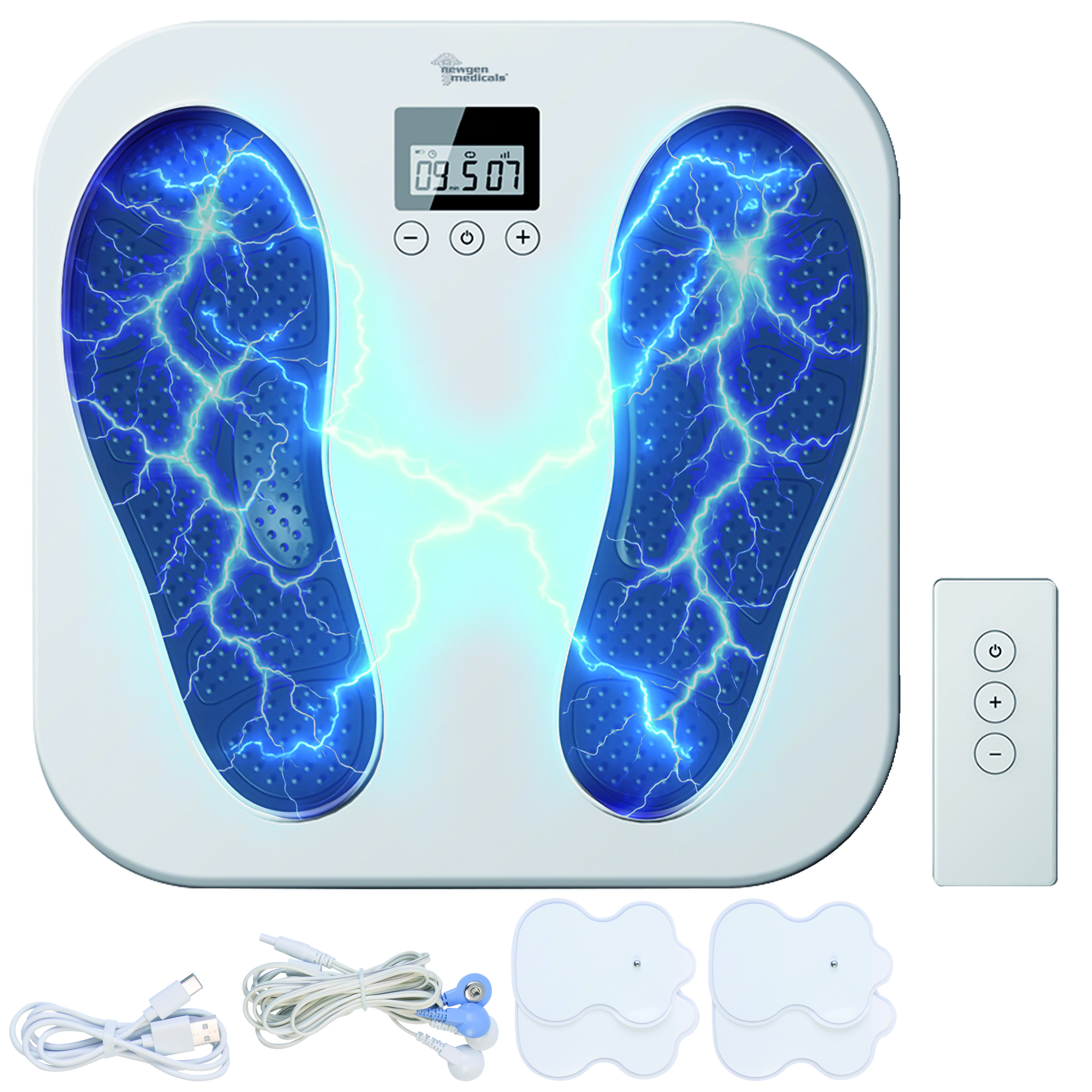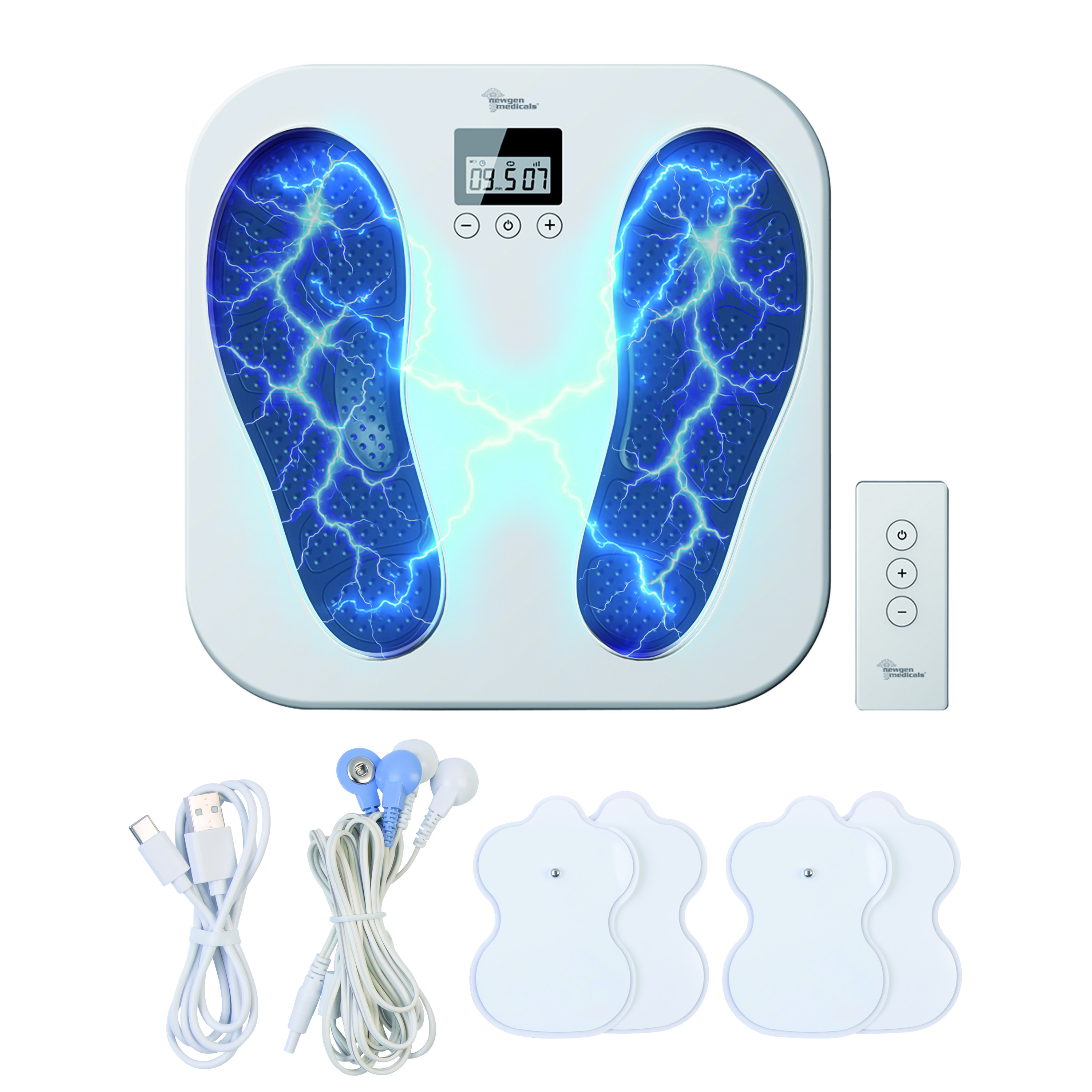 Entspannung und Schmerzlinderung durch medizinische Elektrostimulation: Der EMS- und TENS-Durchblutungsstimulator von newgen medicals eignet sich ideal zur Regeneration müder Beine und Füße. Die elektrische Muskelstimulation (EMS) lockert und aktiviert die Muskulatur, während die transkutane elektrische Nervenstimulation (TENS) sanft die Nerven anregt. Diese medizinischen Verfahren fördern die Durchblutung, lindern Schmerzen, entkrampfen und stärken die Muskeln. Die Anwendung erfolgt durch einfaches Aufstellen der Füße auf die Fußelektroden – besonders wohltuend nach langem Stehen oder intensiver Belastung.