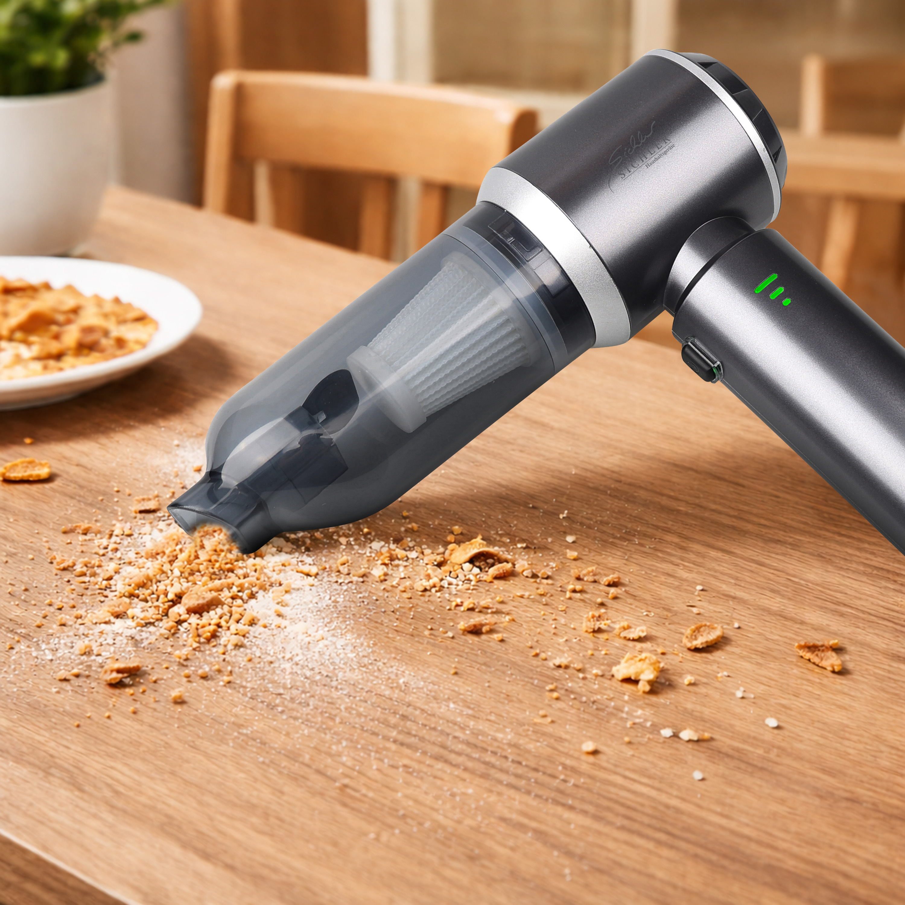 Hohe Saugkraft für gründliche Reinigung:Mit einer Saugkraft von bis zu 25 kPa entfernt das Gerät selbst tiefsitzenden Schmutz gründlich. Teppichkanten, Heizkörper oder schwer erreichbare Ecken in Küchenschränken lassen sich effektiv reinigen. Besonders in Ritzen und Polstern zeigt sich die Leistungsfähigkeit des Handstaubsaugers.