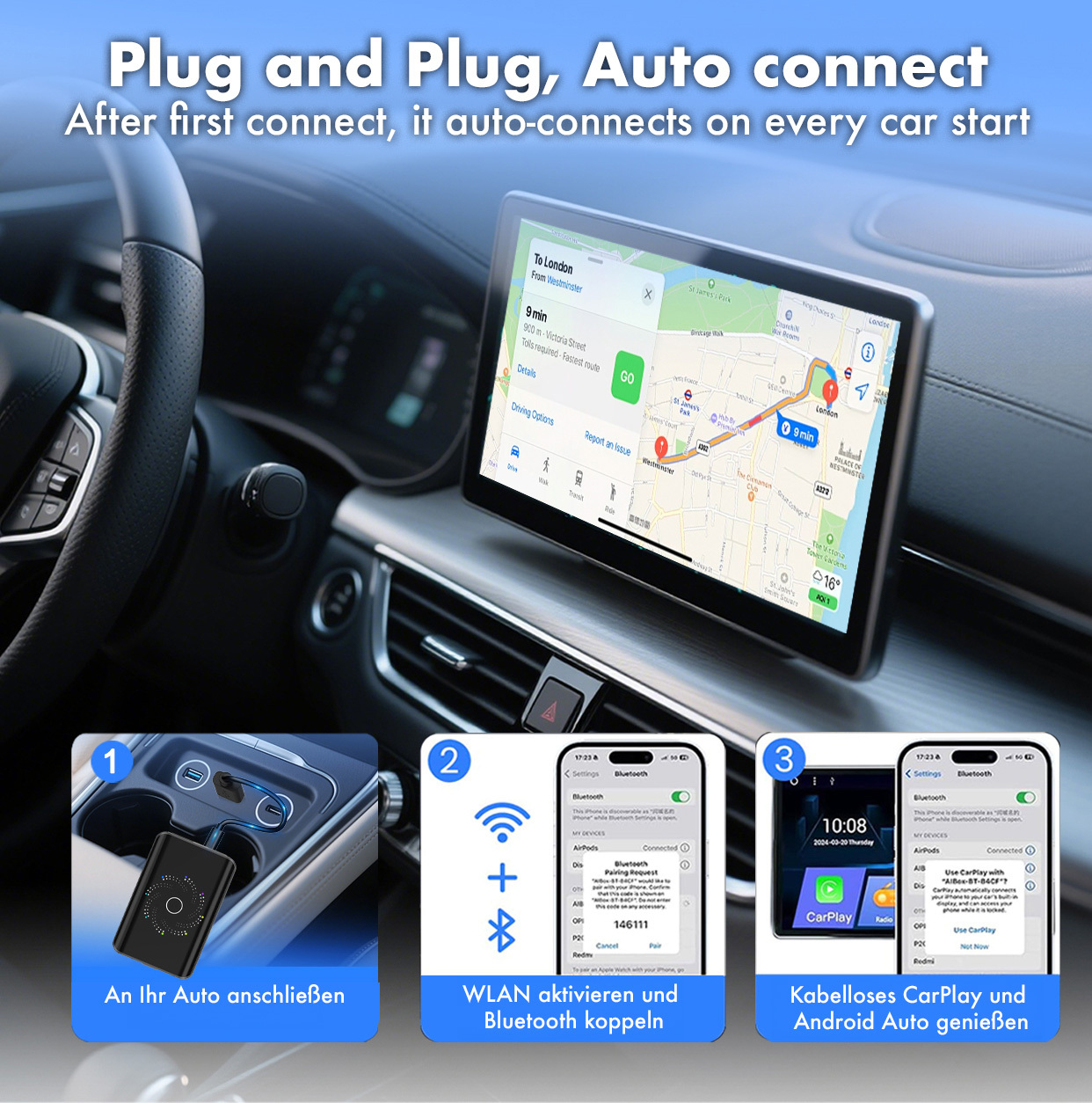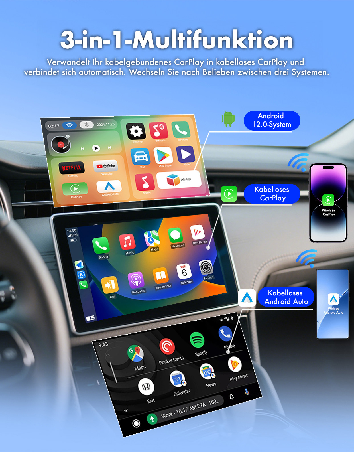 Dual-WLAN für parallele Nutzung:Die Unterstützung von 2,4- und 5-GHz-WLAN ermöglicht die gleichzeitige Verbindung mit CarPlay oder Android Auto und die Nutzung von Streaming-Diensten wie Netflix oder YouTube.
