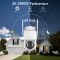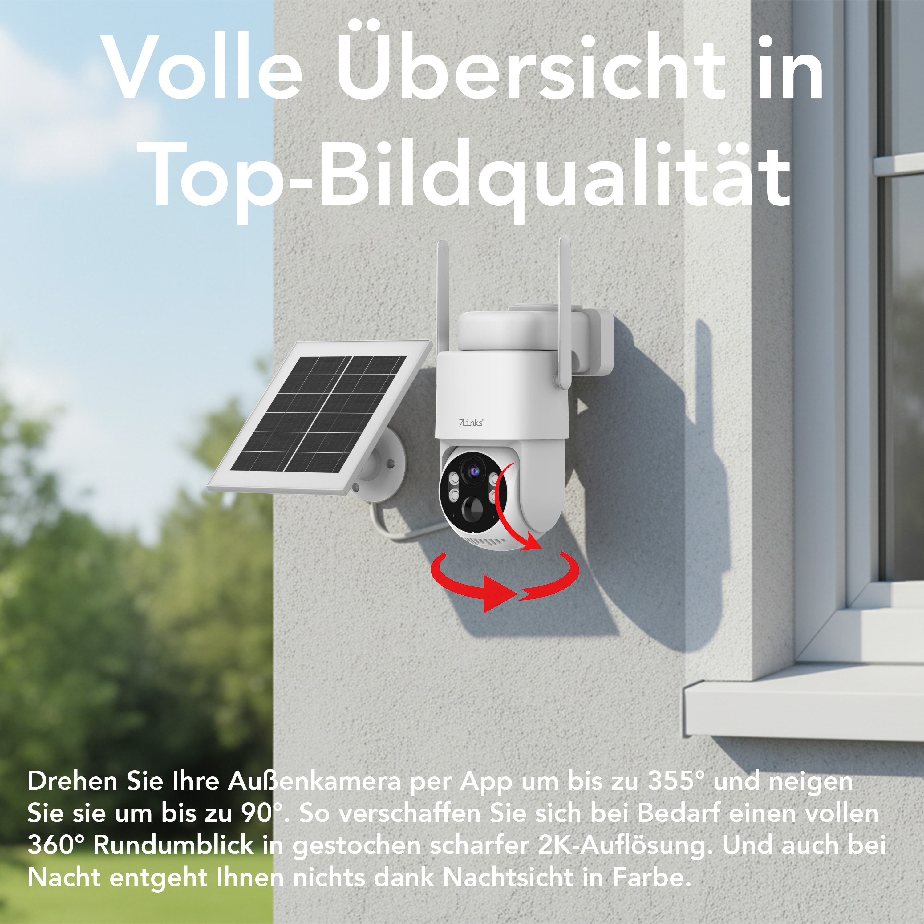 Die Außenkamera lässt sich per App um bis zu 355° drehen und um bis zu 90° neigen. Dies ermöglicht einen vollen 360° Rundumblick in 2K-Auflösung. Dank Farb-Nachtsicht bleiben auch nächtliche Ereignisse sichtbar.