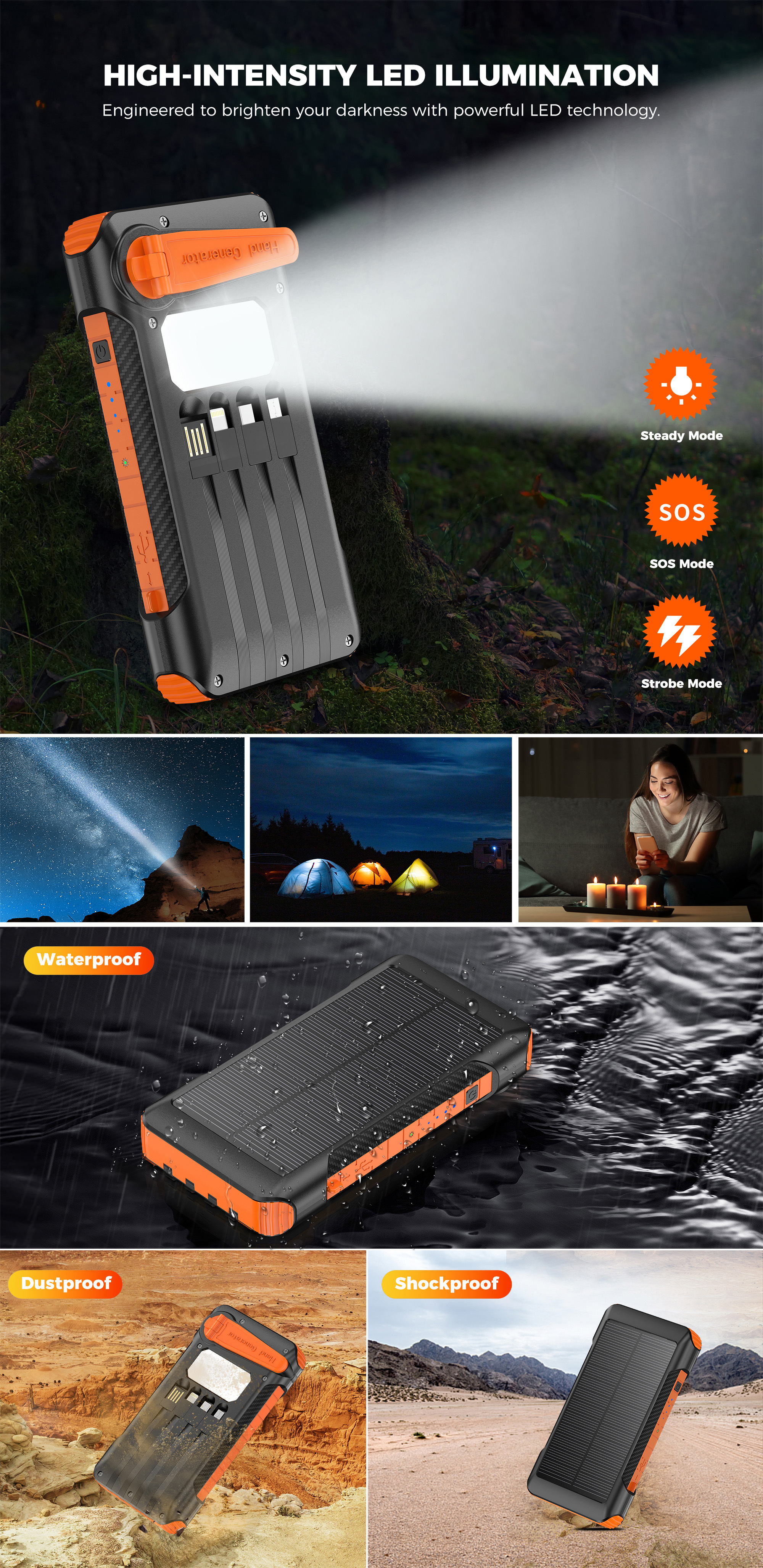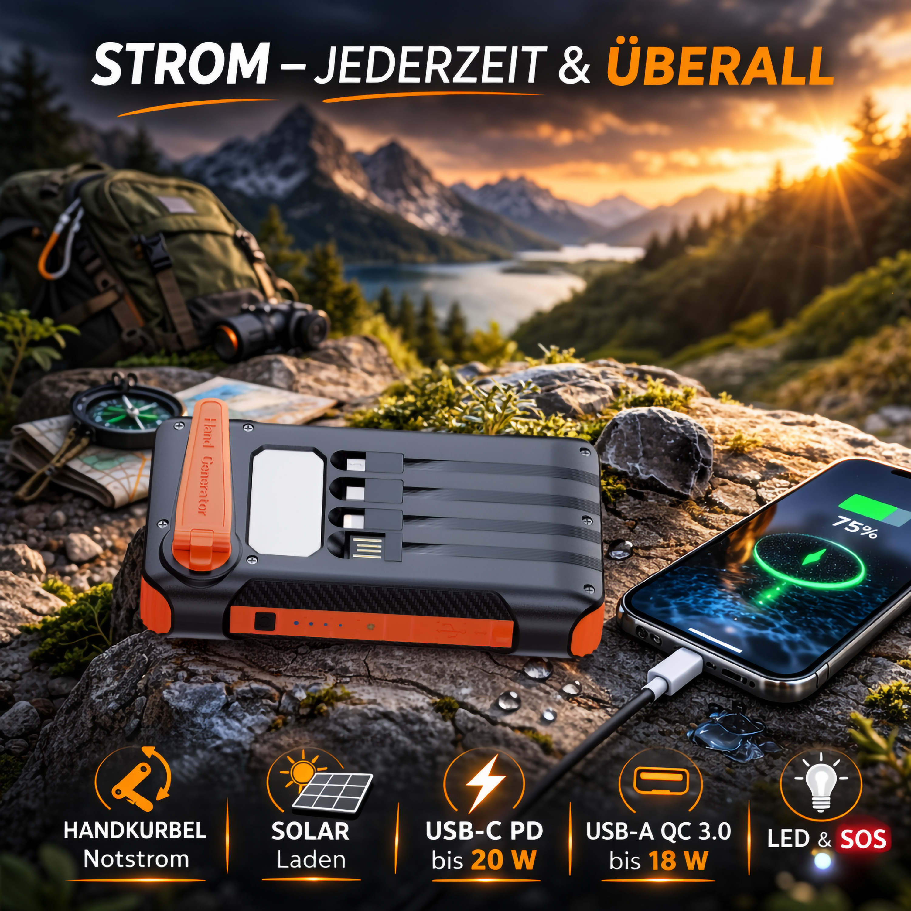 Das stoßfeste Gehäuse schützt die Powerbank vor Witterungseinflüssen und Staub. Das kompakte Format passt in jeden Rucksack und macht das Gerät zum zuverlässigen Begleiter für Outdoor-Abenteuer und Notfallausrüstung - ob im Zelt, auf der Berghütte oder bei Stromausfall.