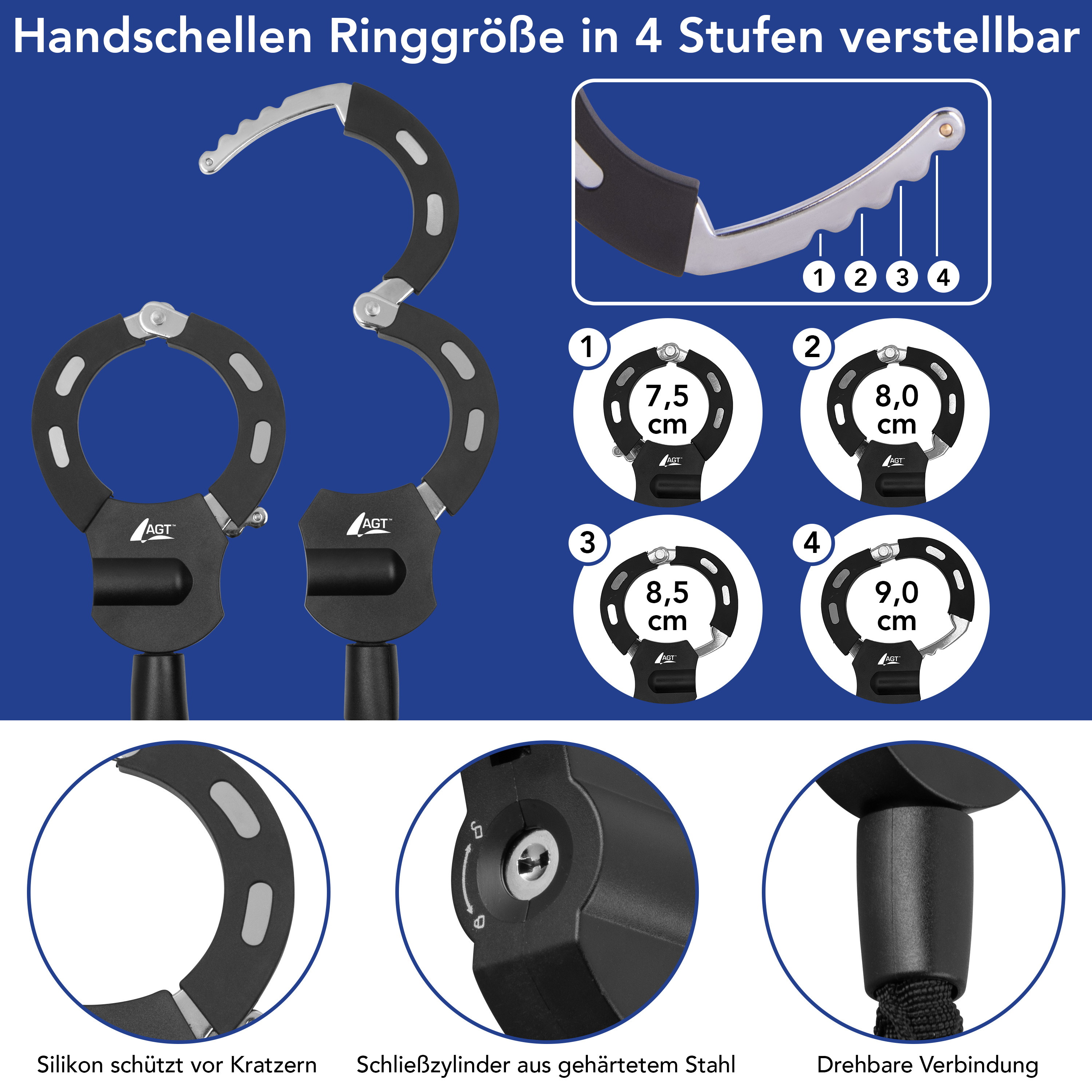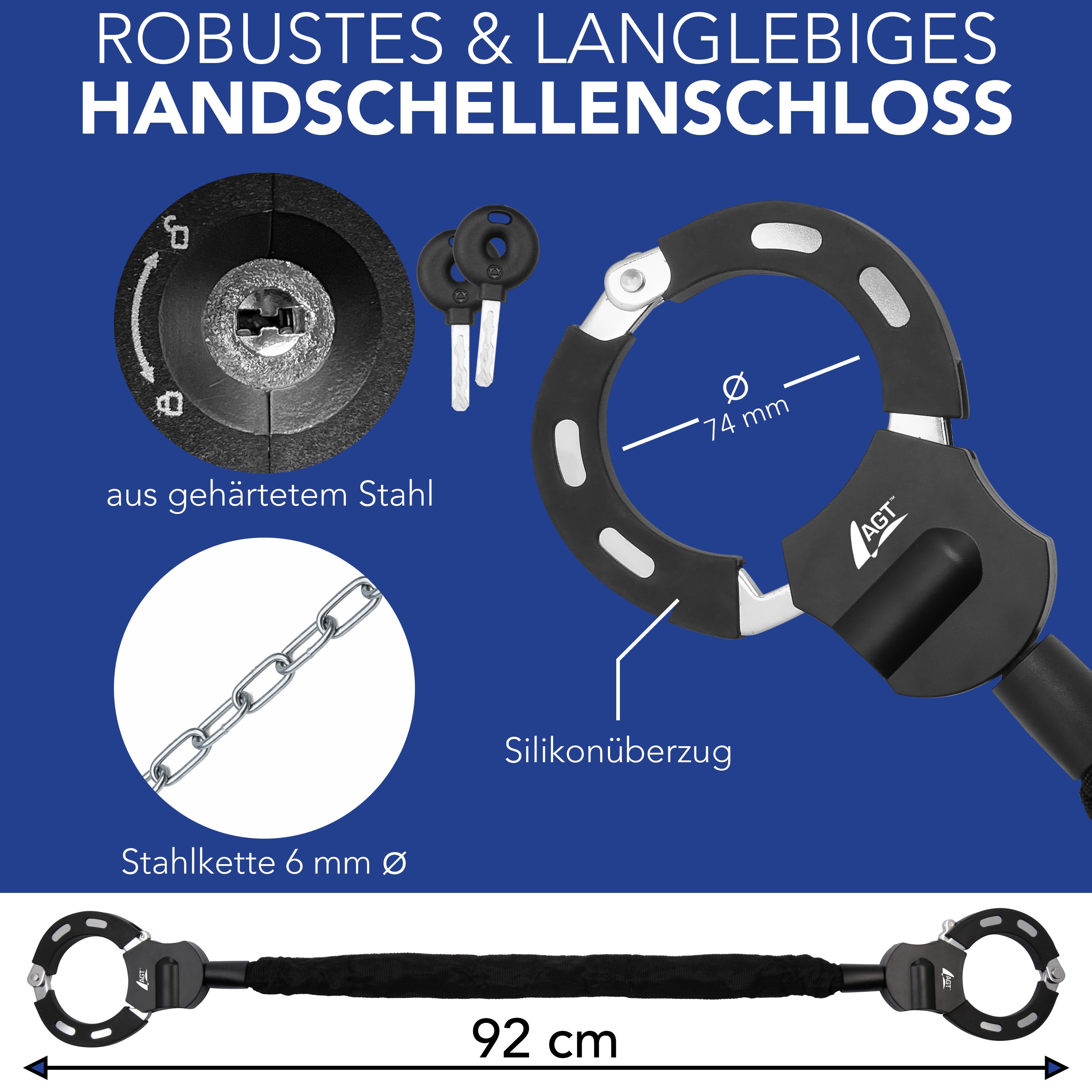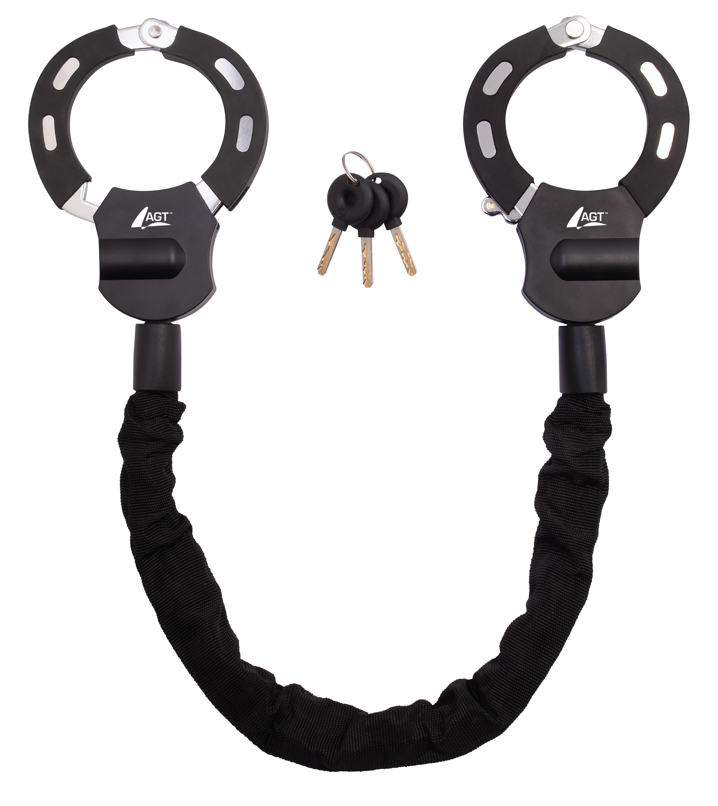 (lifepr) (Buggingen, 17.04.2026) Das Handschellenschloss von AGT wurde speziell für E-Scooter konzipiert. Es eignet sich aber auch für Fahrräder, E-Bikes, Roller und Kinderwagen. Das Schloss verfügt über zwei 74 mm große, stabile Metallschellen mit einer Silikonschutzschicht und eine 6 mm starke Stahlkette, die durch einen Textilschlauch geschützt ist. Mit einer Gesamtlänge von 92 cm lässt es sich flexibel an Fahrradbügeln, Zäunen oder Verkehrsschildern befestigen. Im Lieferumfang sind drei Schlüssel enthalten. Diese innovative und praktische Lösung ist ideal, um den E-Scooter vor Diebstahl zu schützen.