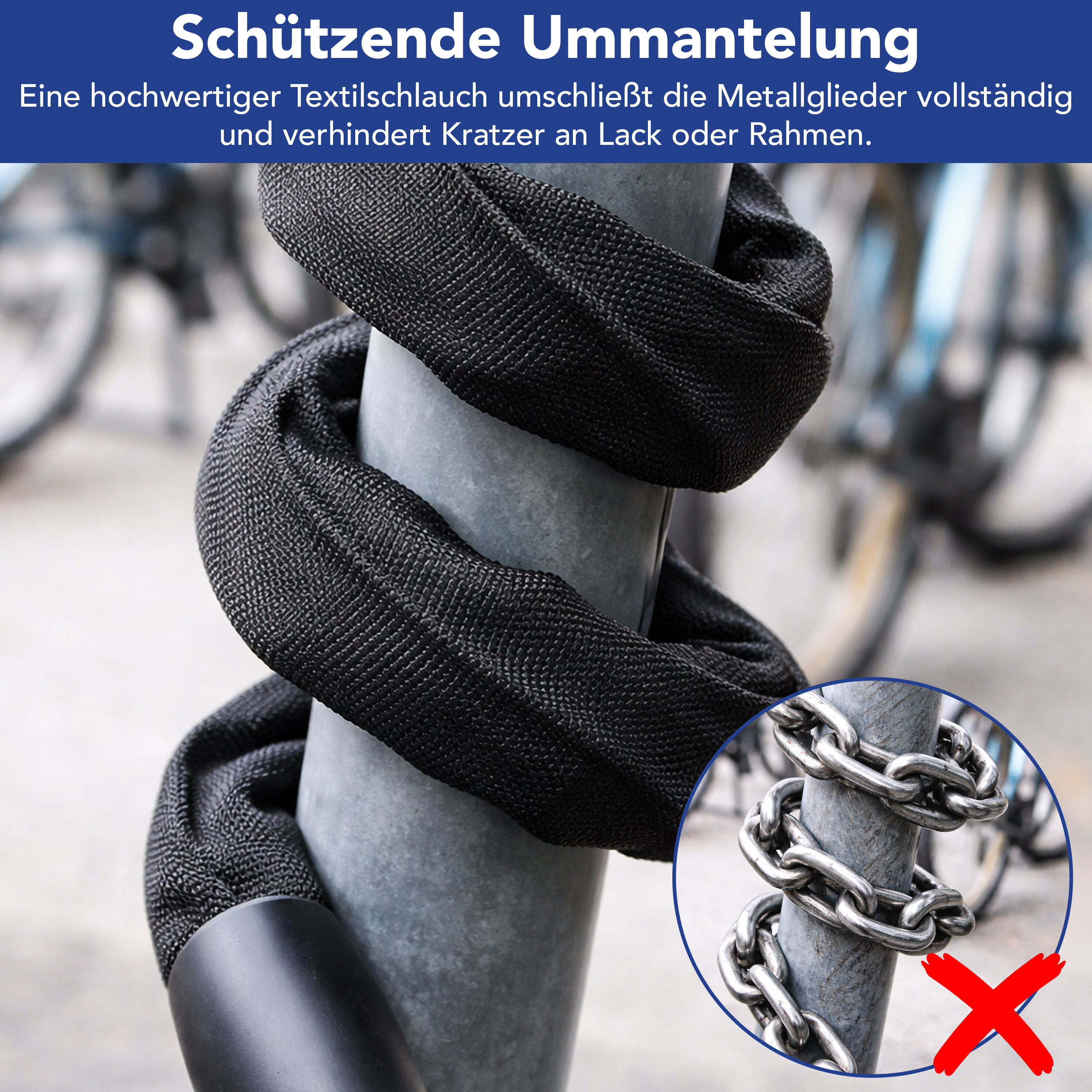 Schützende Ummantelung: Ein hochwertiger Textilschlauch umschließt die Metallglieder vollständig und verhindert Kratzer an Lack oder Rahmen. Selbst bei täglicher Nutzung bleibt die Oberfläche des Scooters makellos. Die Gummierung sorgt zudem für angenehmes Handling – besonders an kalten Tagen.