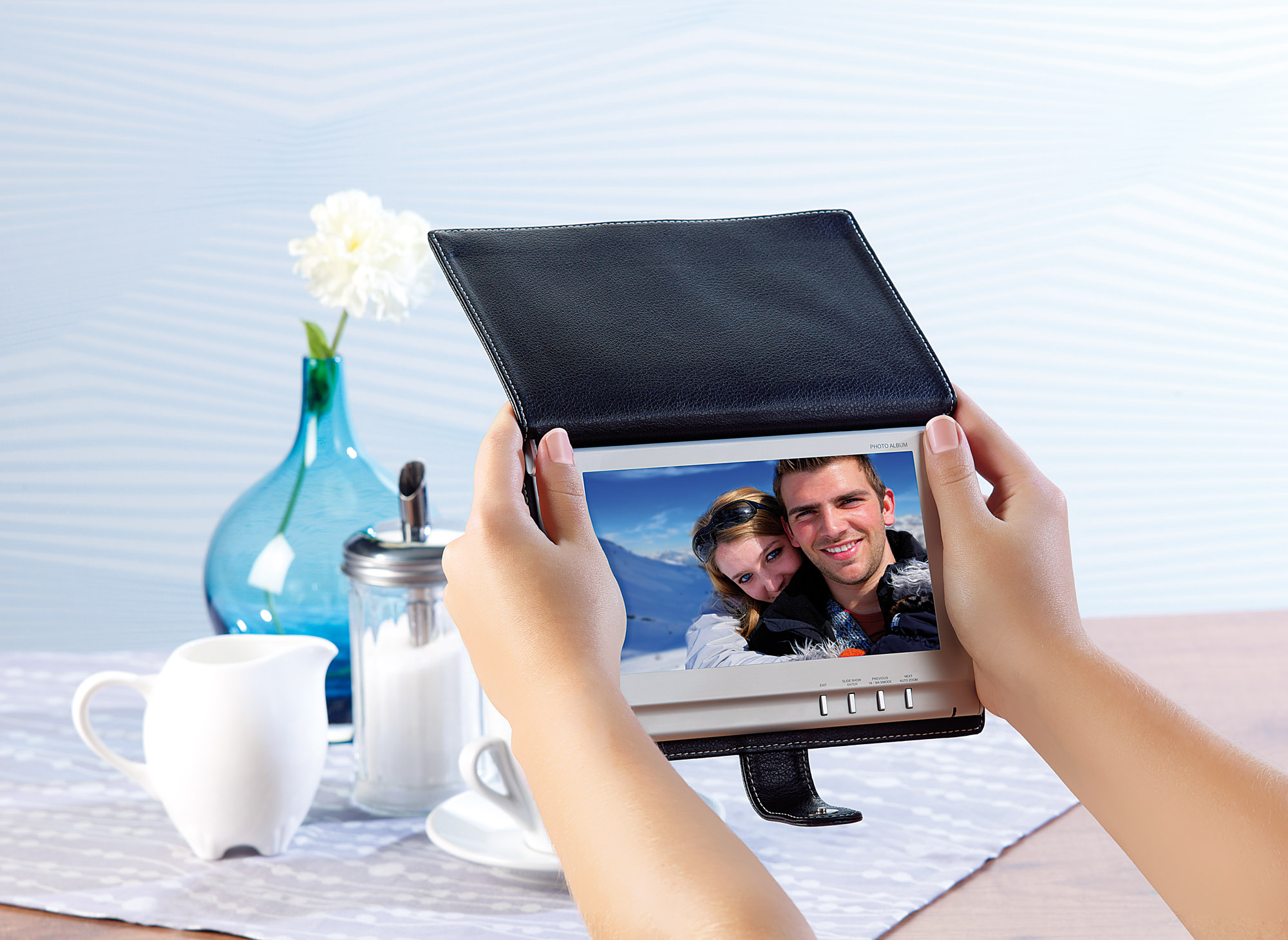 Oder soll der Schreibtisch im Büro mit einem besonderen Highlight ausgestattet werden? Kein Problem! Das Fotoalbum wird mit dem integrierten Ständer blitzschnell zum digitalen Bilderrahmen.