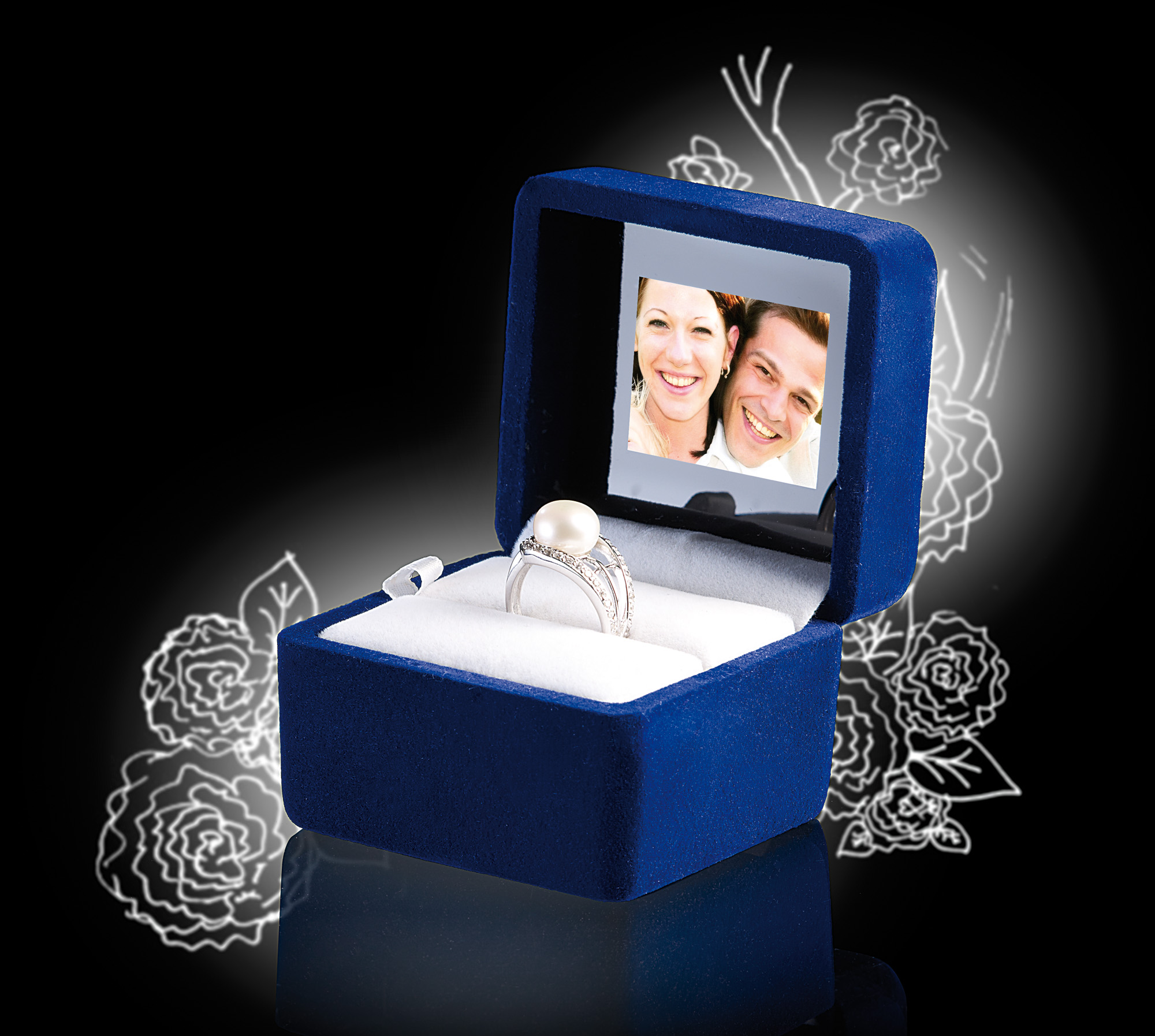 (lifepr) (Buggingen, 29.04.2011) Außen samtweich, innen brillant schön: Diese originelle Ringschatulle präsentiert einen Ring auf einzigartige Art und Weise: Im Inneren befindet sich ein kleiner, digitaler Bilderrahmen! So wird das Ring-Geschenk ein unvergessliches Erlebnis.
