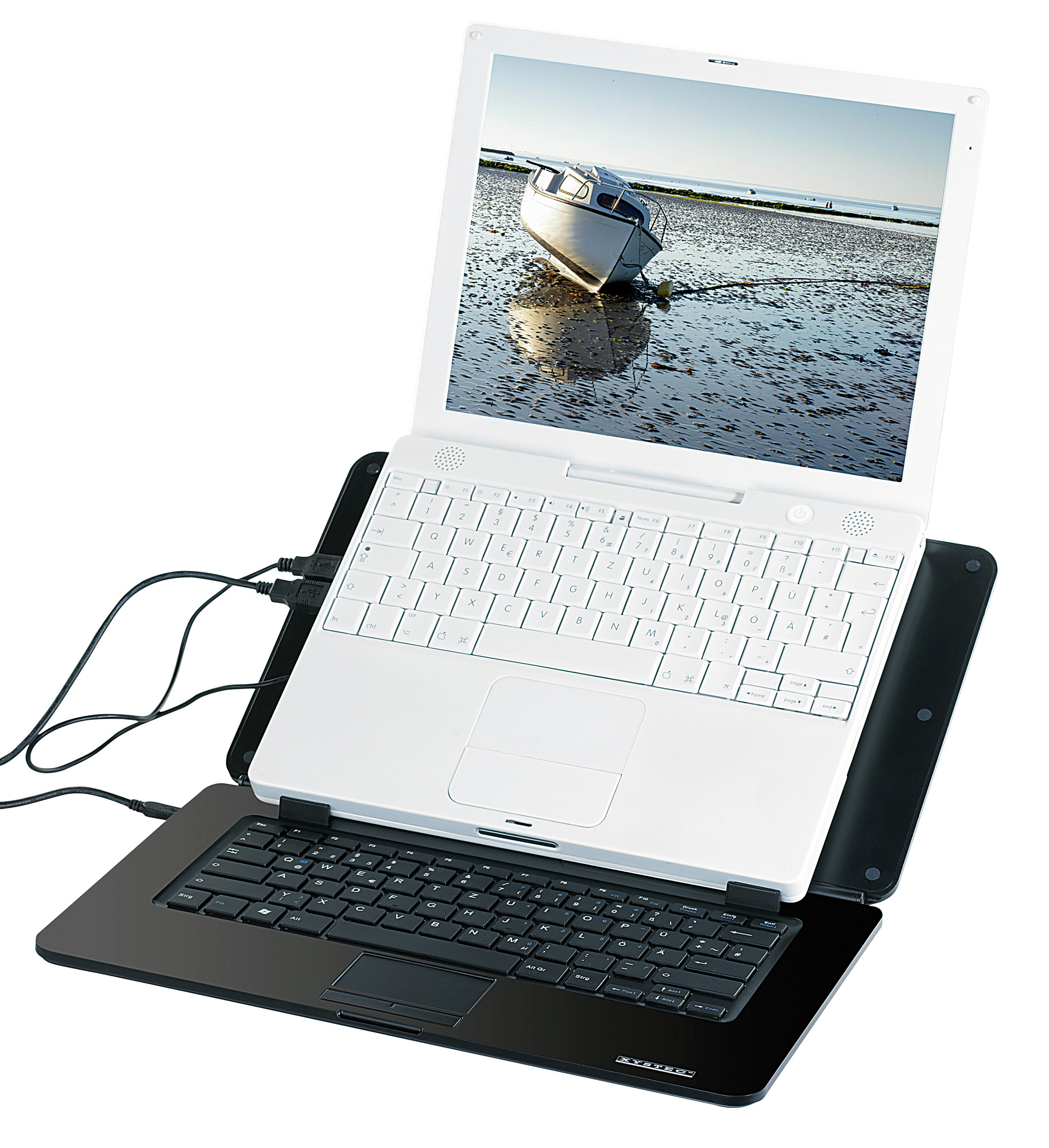 Genial: Weil sich auf der schräggestellten Tastatur schlecht tippen lässt, bietet dieser pfiffige Helfer eine integrierte Windows-Tastatur komplett mit Touchpad! Über USB angeschlossen lässt sich auch der praktische 2-fach USB-Hub für Stick, externe Festplatten oder Maus nutzen.