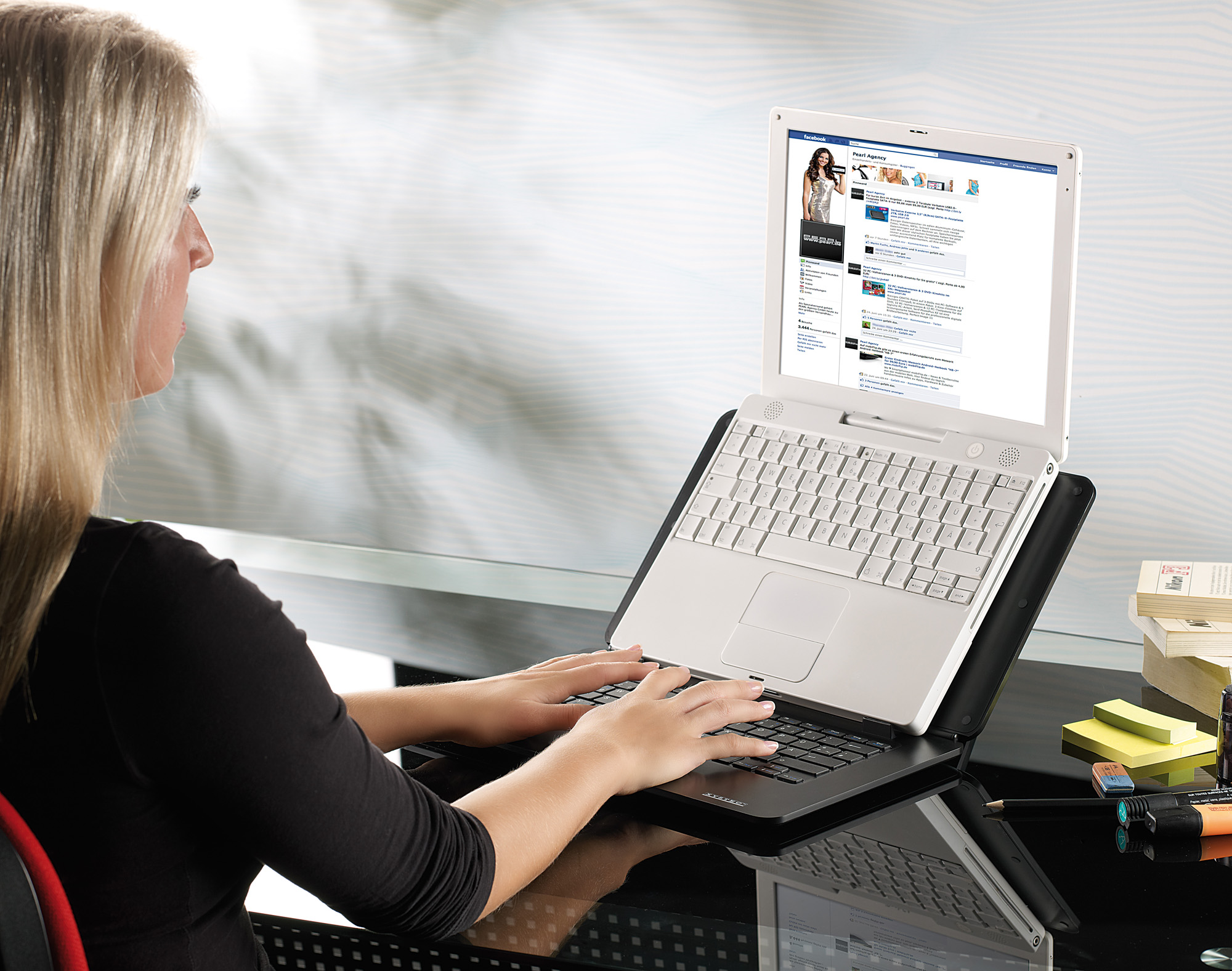 Ein Segen für die Rückenwirbel: Die standfeste Unterlage lässt sich bequem auf verschiedene Winkel einstellen. Je nach Notebook, Monitor sowie der eigenen Sitzposition findet man spielend die passende Höhe und den optimalen Winkel.