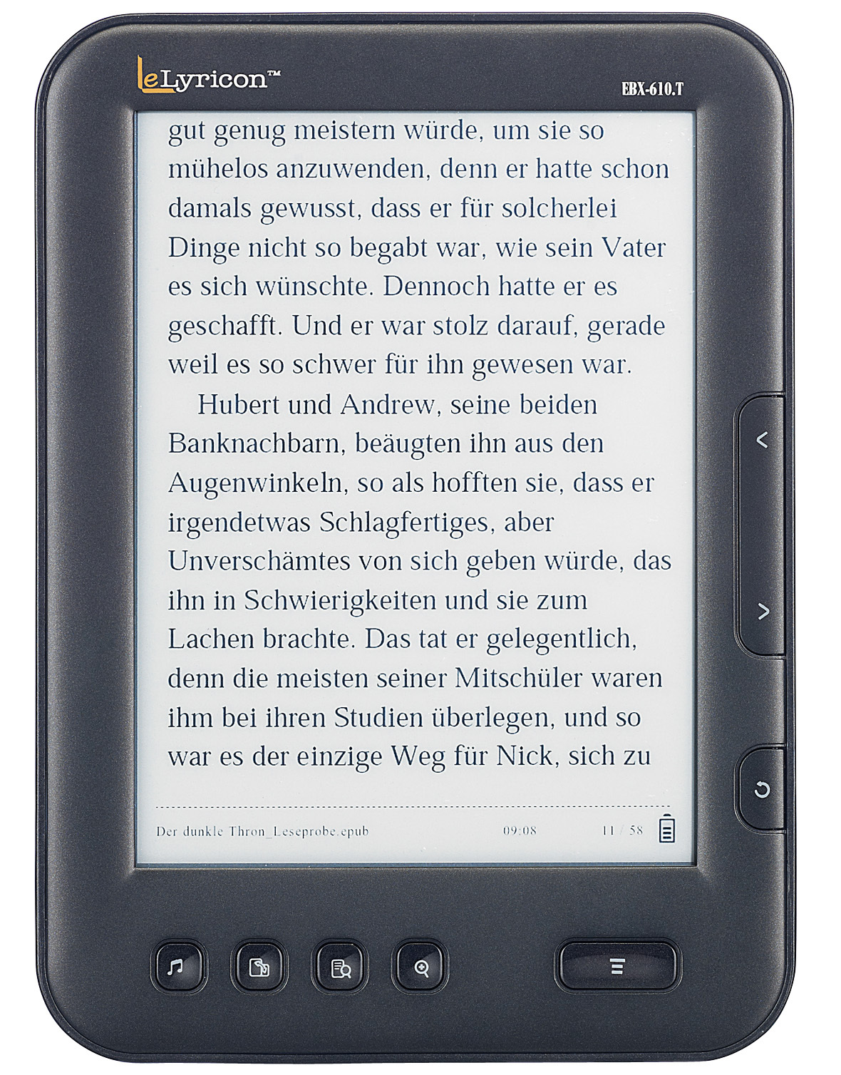 Eine komfortable Bibliothek für die Handtasche: Der schlanke eBook-Reader von eLyricon unterstützt fast alle Formate wie z.B. ePub oder pdf. Auch DRM-geschützte. So ist man also an keinen bestimmten eBook-Shop gebunden. Viele Tausend kostenlose eBooks finden sich übrigens im Internet. Einfach mal "googeln".