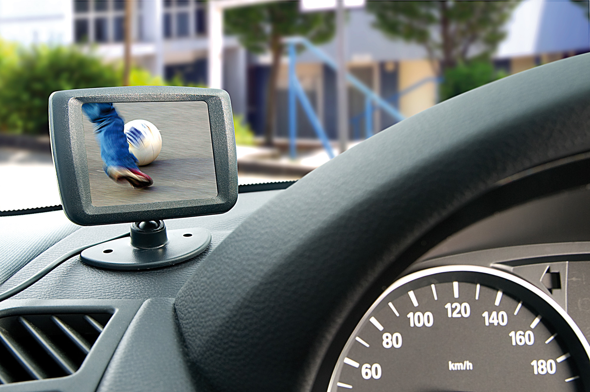 Hindernisse, wie Waende und Hecken, aber auch spielende Kinder loesen sofort ein Warnsignal aus. Ein Blick auf das 3"-TFT-Display zeigt, was hinter dem Fahrzeug passiert und wie viel Spielraum man noch nach hinten hat.