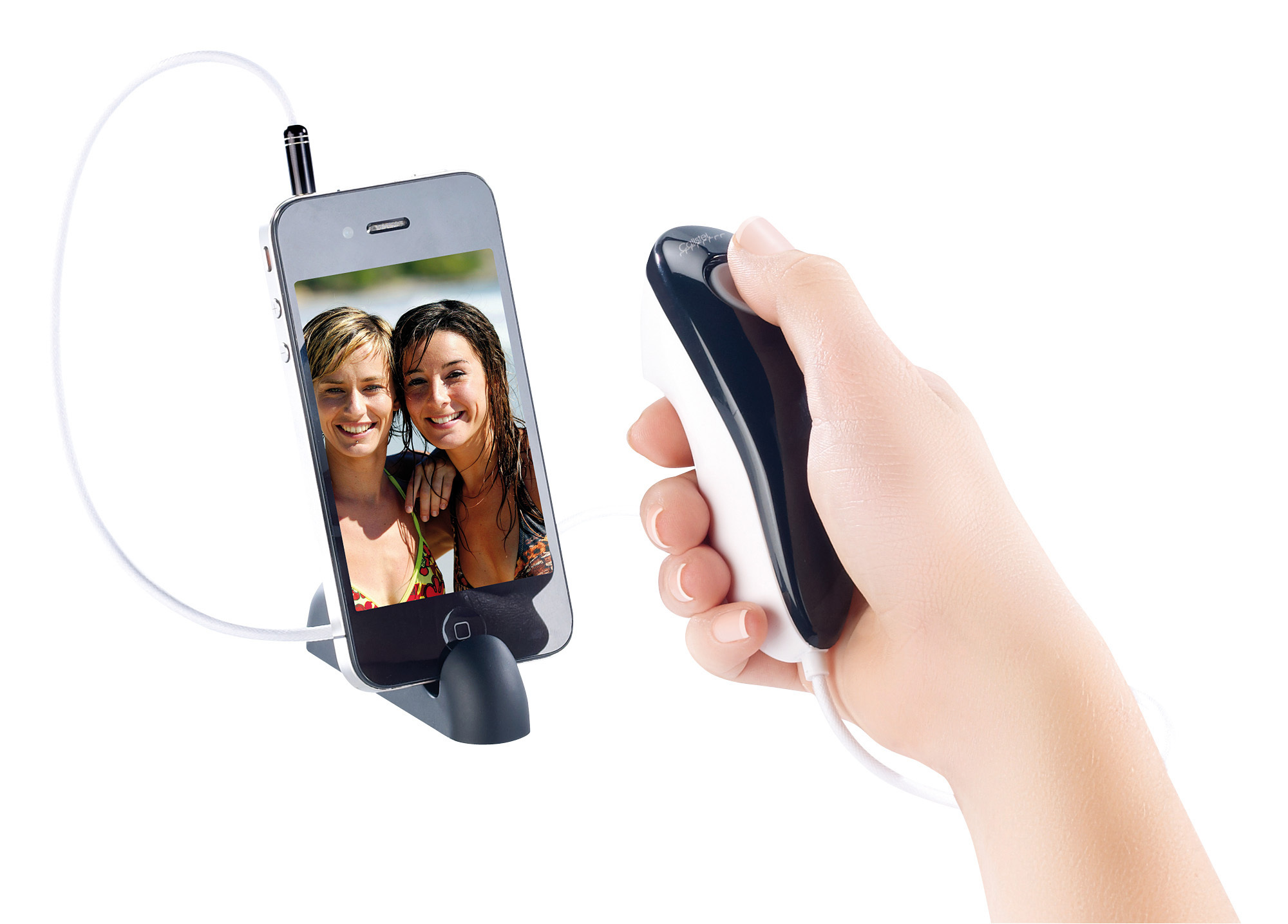 (lifepr) (Buggingen, 16.10.2012) Mit der richtigen Technik sind gestochen scharfe Selbstaufnahmen mit iPhone und iPad ein Kinderspiel: Per Kabel verbindet man diesen Fernausloeser von Callstel mit dem mobilen Kultgeraet. Einfach in den Klinkenstecker einstecken. Kurz noch die Kamera-App aufrufen, ausrichten und Klick! Perfektes Foto.