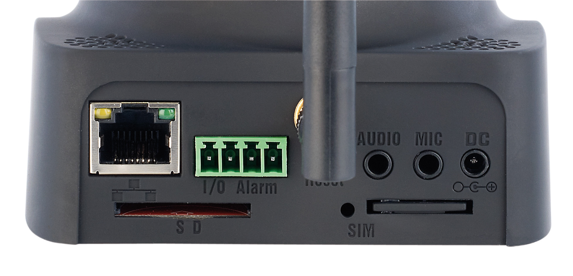 - Schnittstellen: Ethernet, Antennenanschluss, 2 x Audio (3,5-mm-Klinke In und Out), Alarm (4-Pin In/Out)