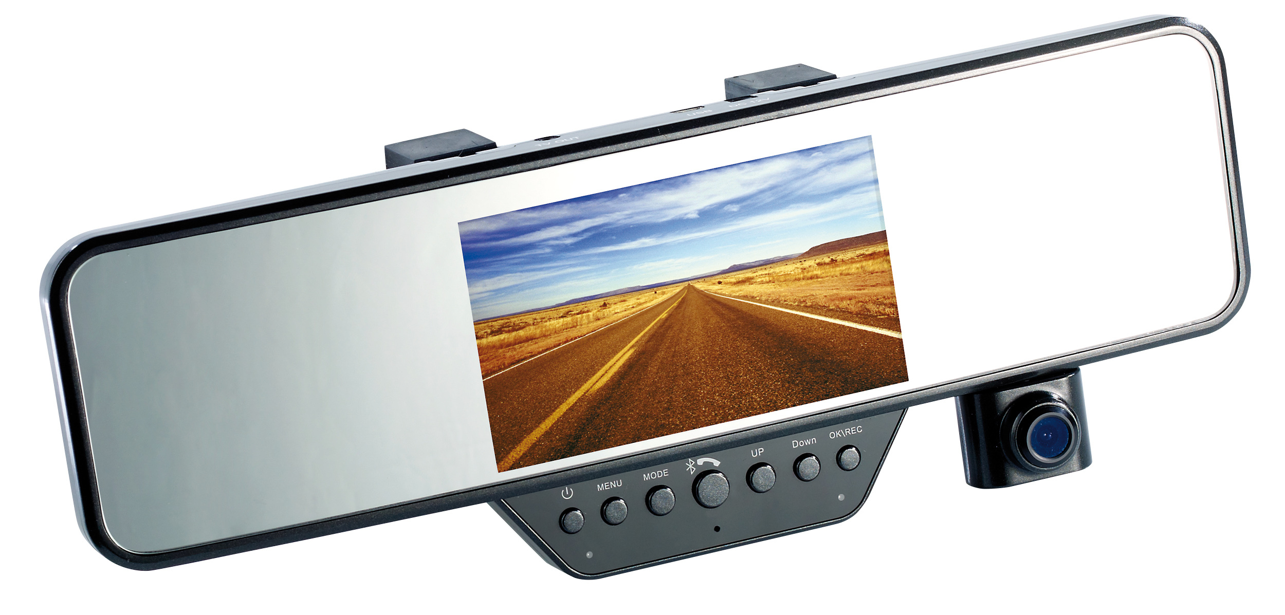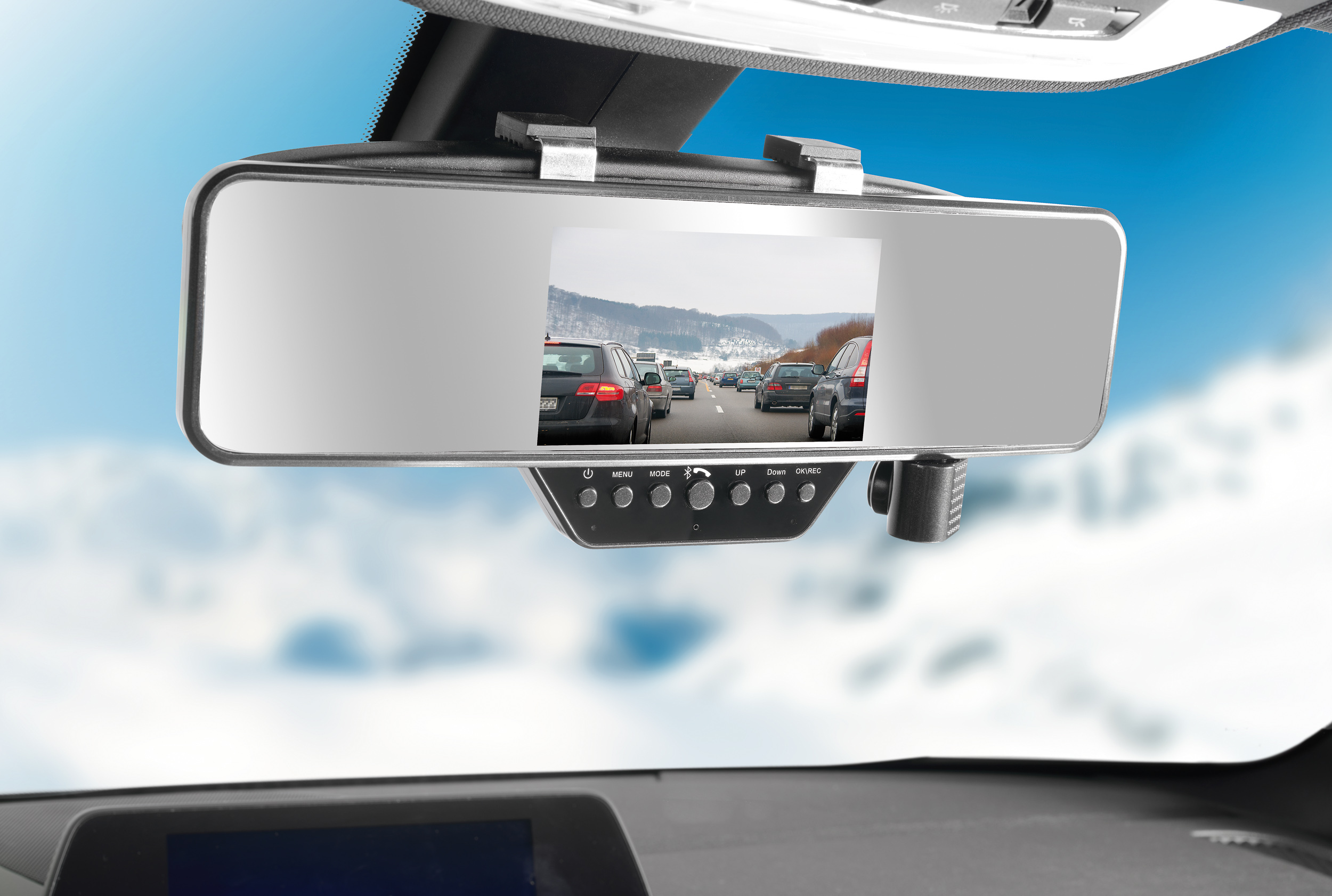 (lifepr) (Buggingen, 19.11.2013) Auf den ersten Blick ein besonders schicker Rückspiegel. Auf den zweiten Blick eine Luxus- Dashcam mit hochwertiger Bluetooth-Freisprecheinrichtung und integriertem Farb-Display im Spiegel!