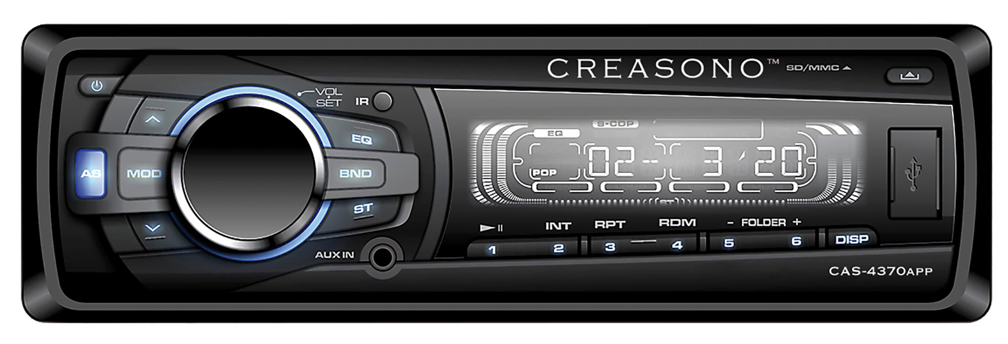 Ausserdem glaenzt dieses USB-Autoradio von Creasono mit 4-Kanal-Sound von USB-Speicher und SD-Karte. Das Display bietet 6 Direktwahlknoepfe zum Anwaehlen der Lieblings-Radiosender. Und via RDS erhaelt man immer aktuelle Informationen zu Sender und Programm.